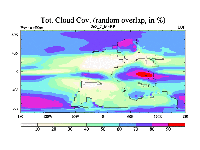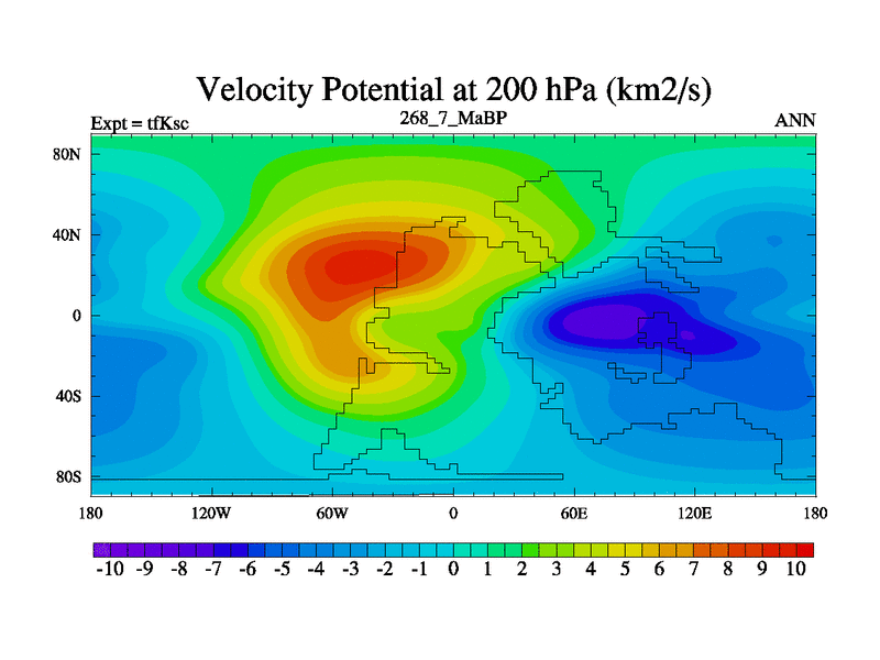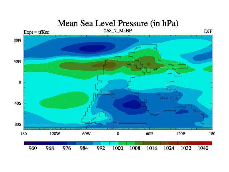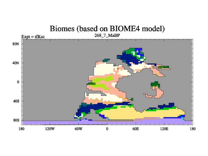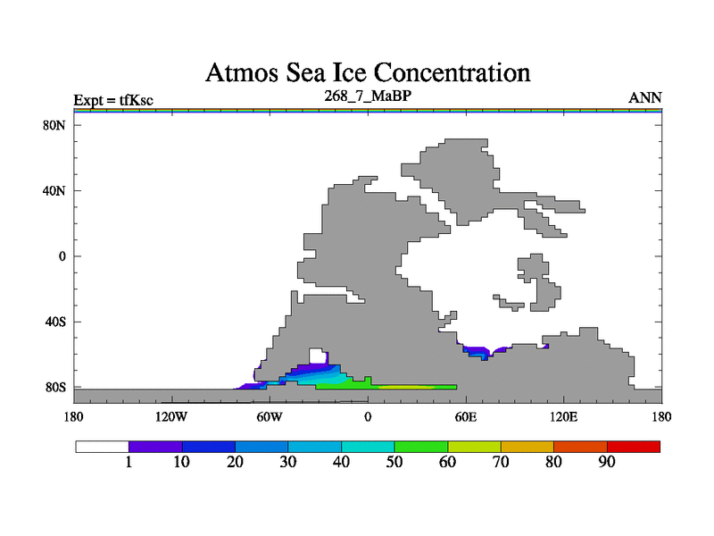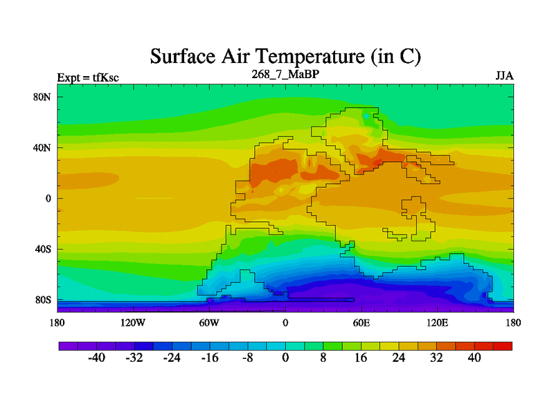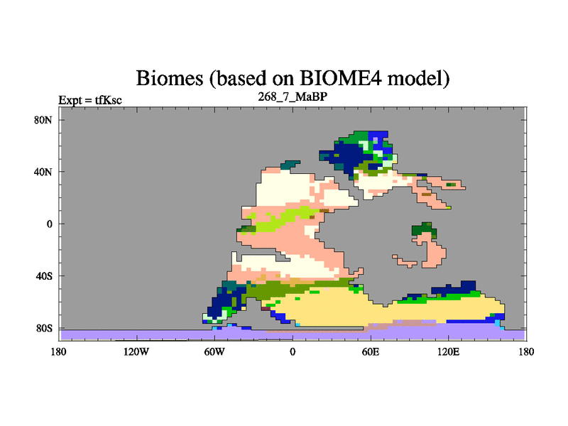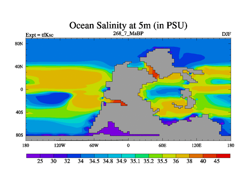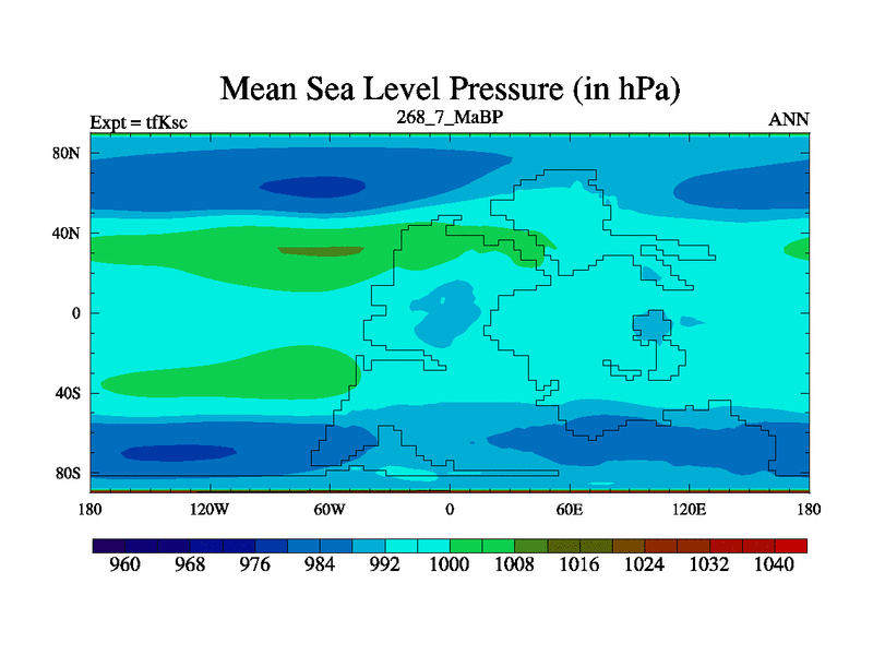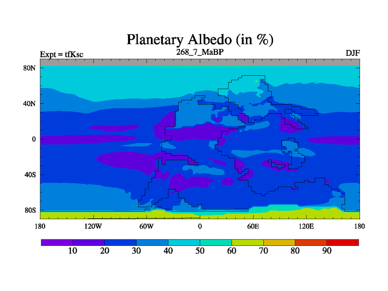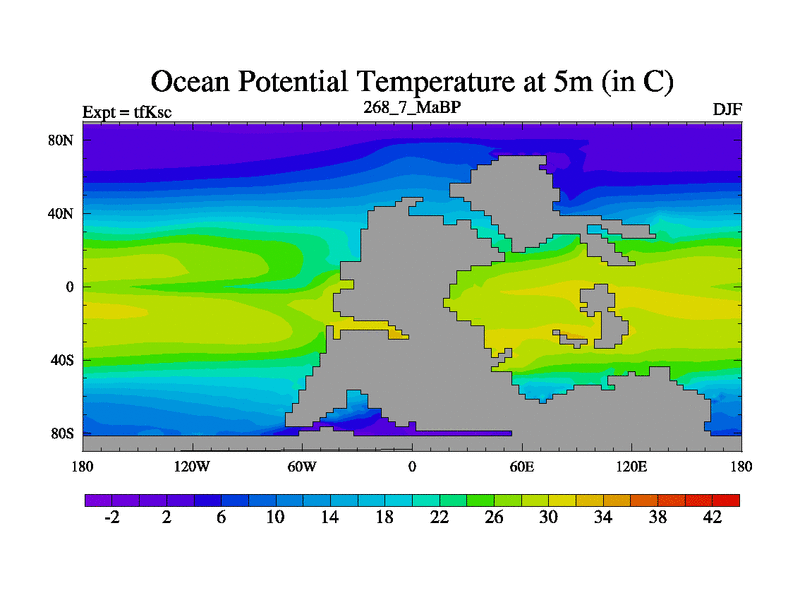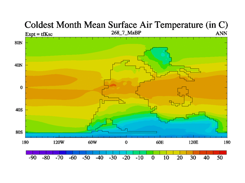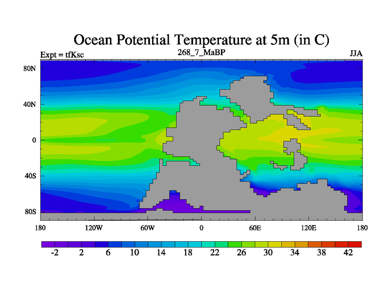 This is the 268.7 Ma simulation using the Scotese palaeogeographies and revised CCN etc. This version has islands and smoothing and desert albedo included. Tuned CO2 to give Scotese temperatures. Started from end of tfKec.