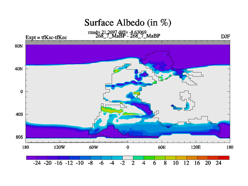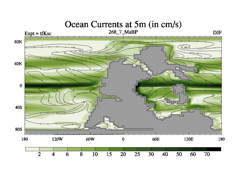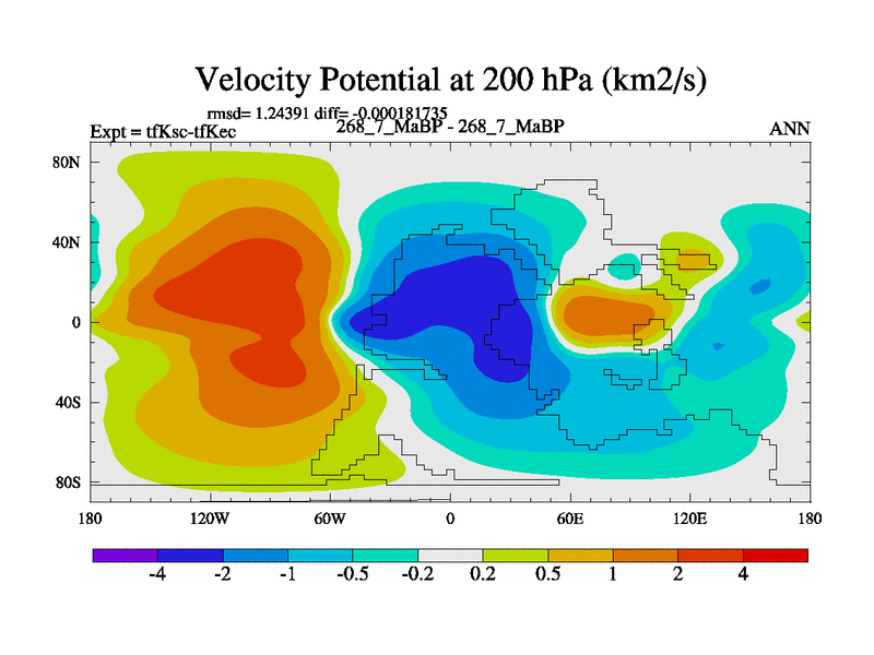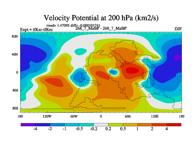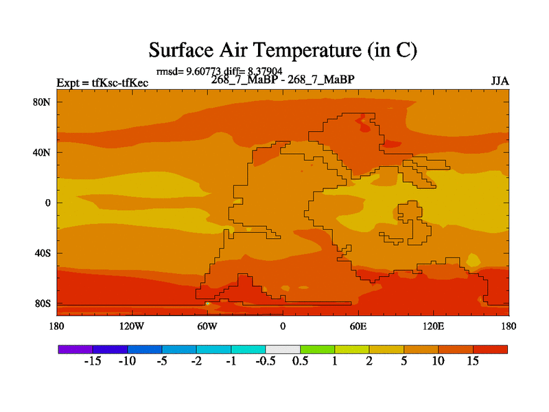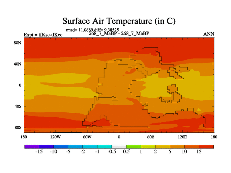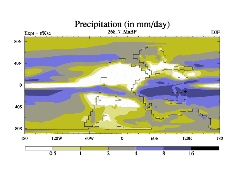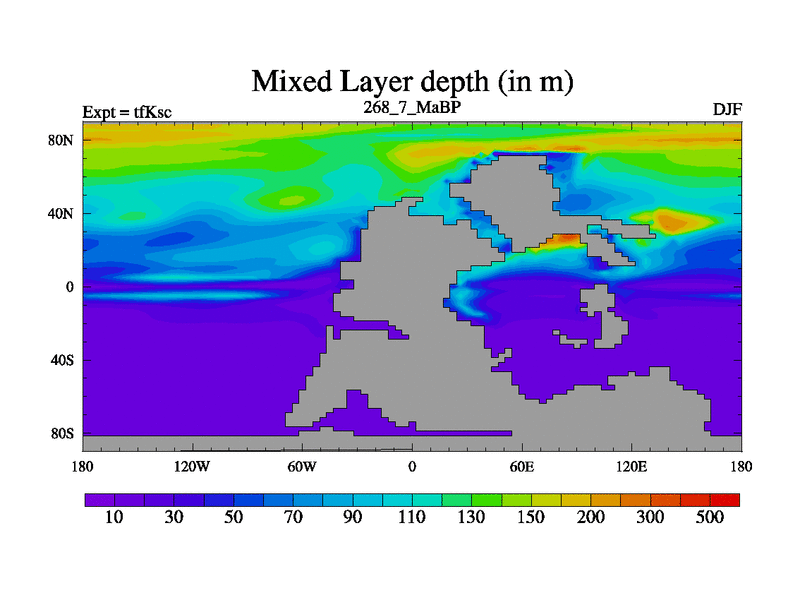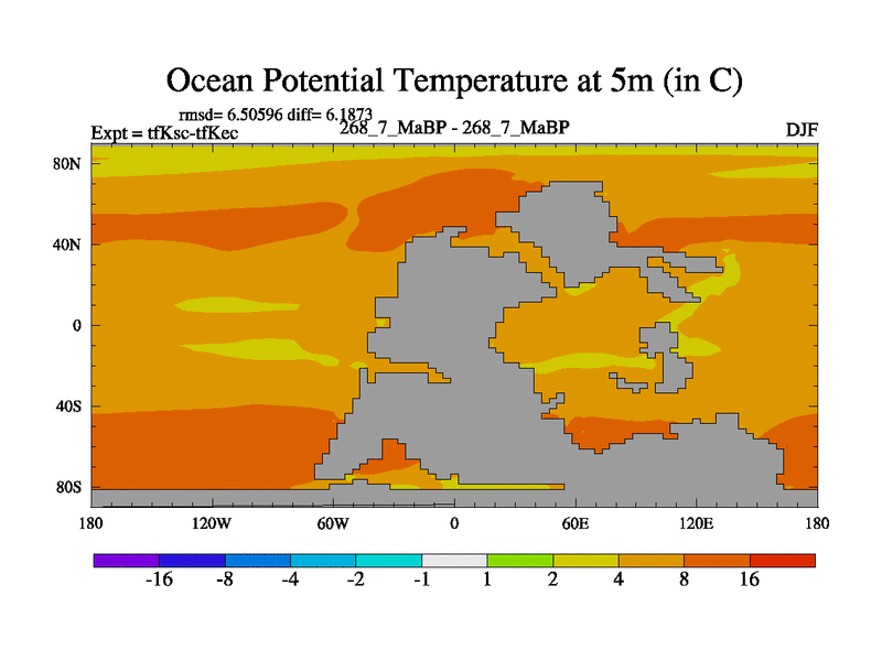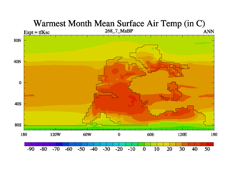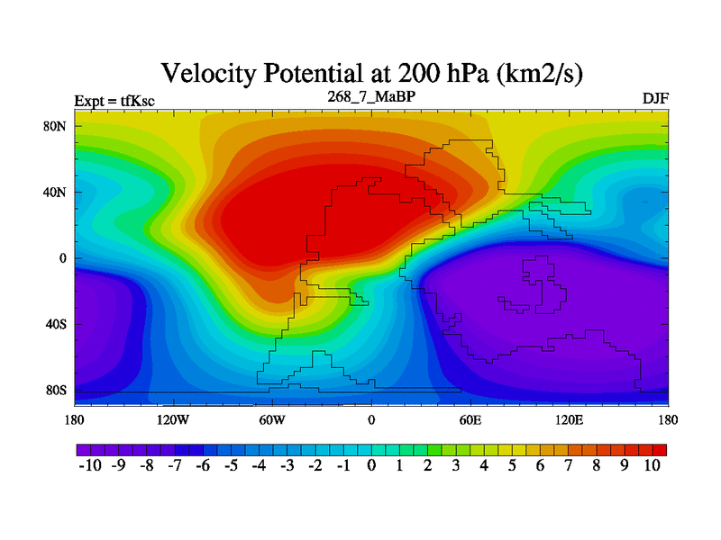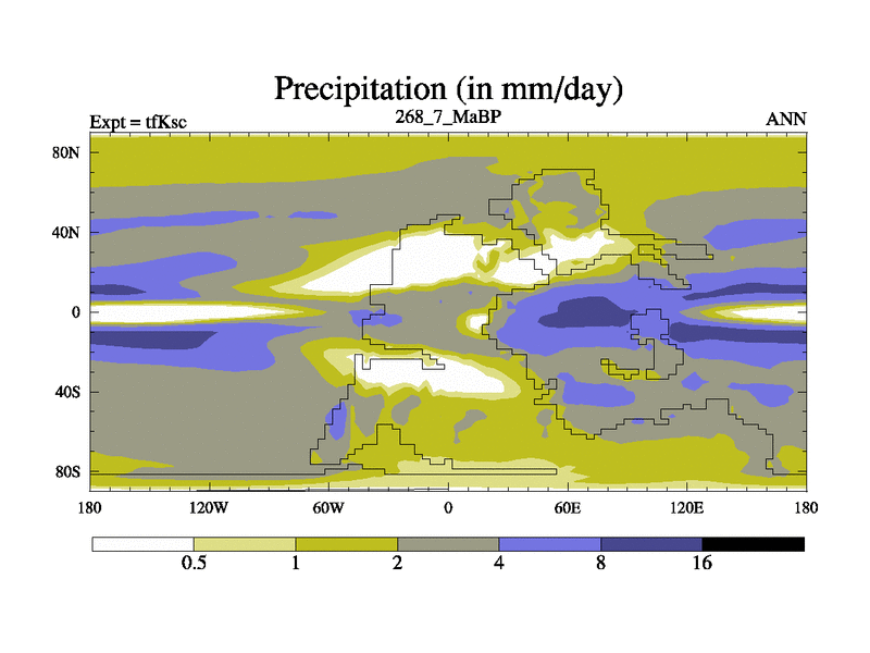 This is the 268.7 Ma simulation using the Scotese palaeogeographies and revised CCN etc. This version has islands and smoothing and desert albedo included. Tuned CO2 to give Scotese temperatures. Started from end of tfKec.
