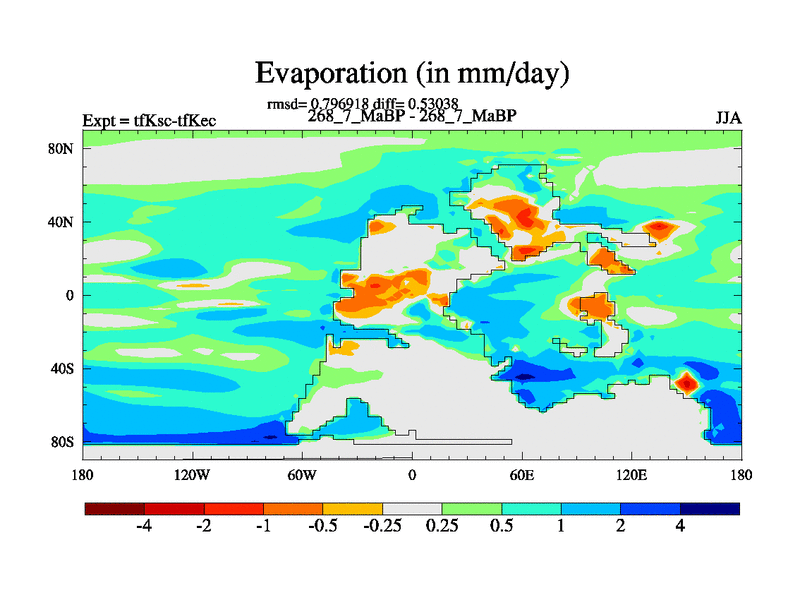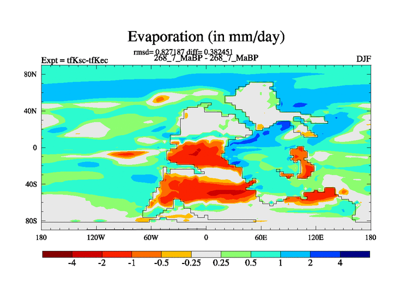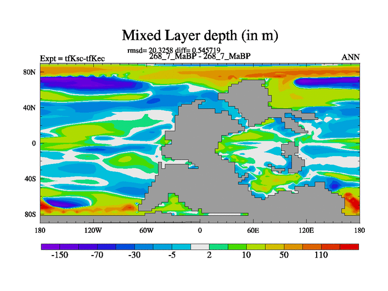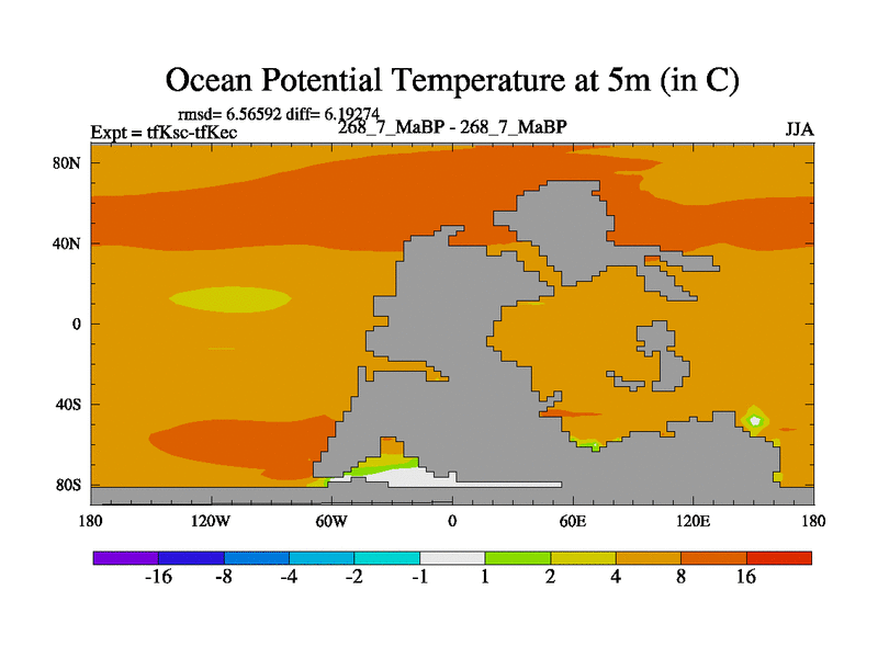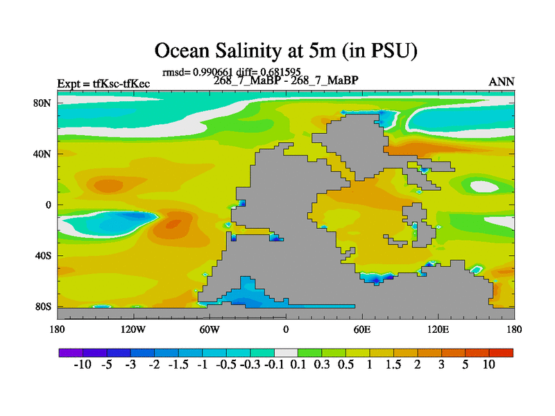 Scientifically as benchmark except using water age update, dark respiration, salinity conservation and revised ozone. Also using new orbital and solar update, and outputting leaf CO2. This version has islands included and atmospheric smoothing and desert albedo. Tuned CO2 to give Scotese temperatures. Started from end of tfKec.