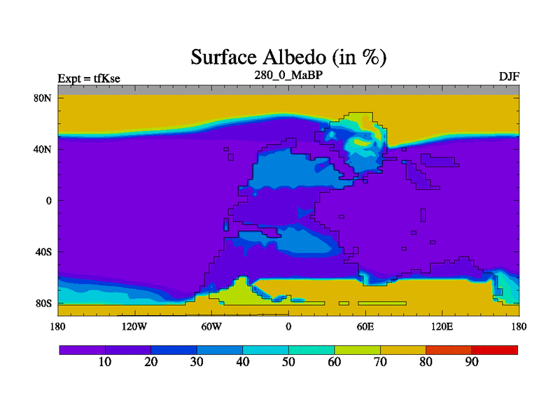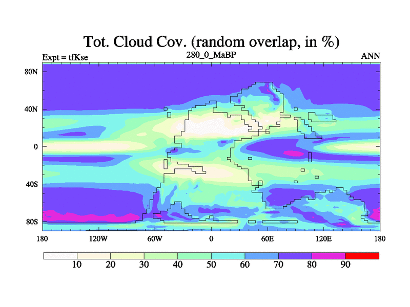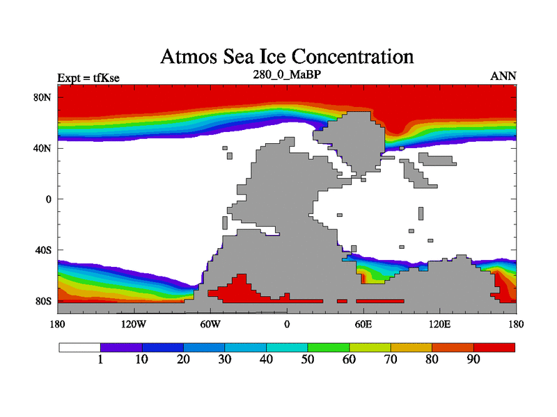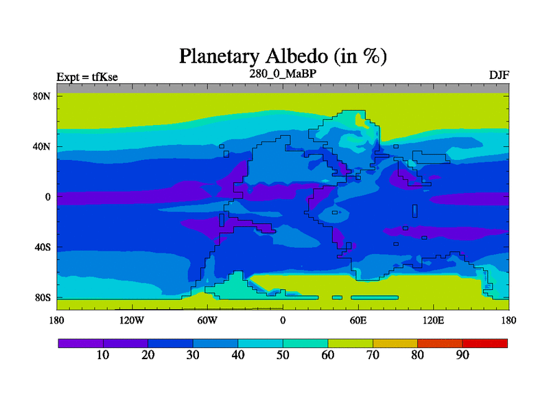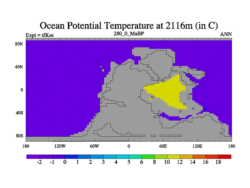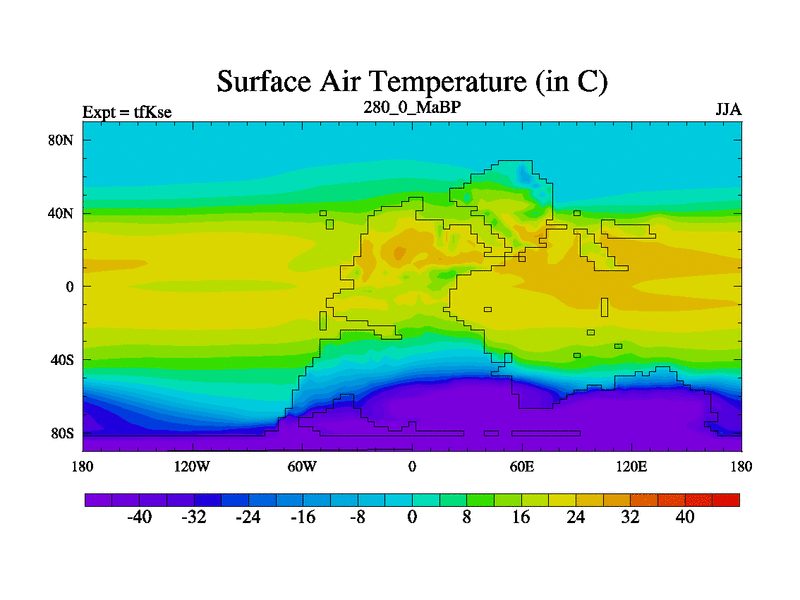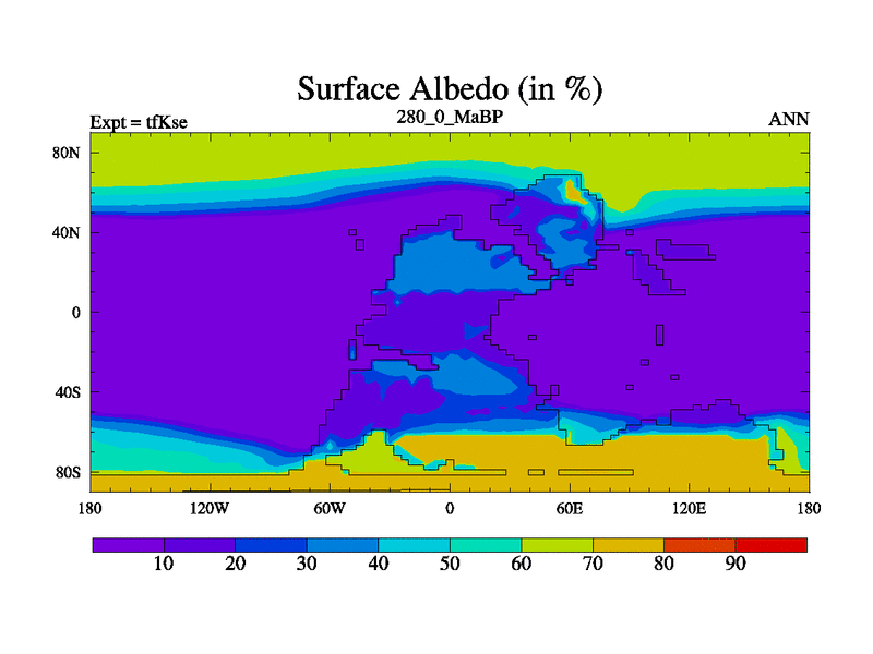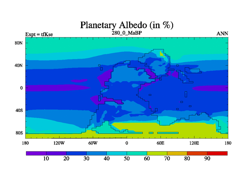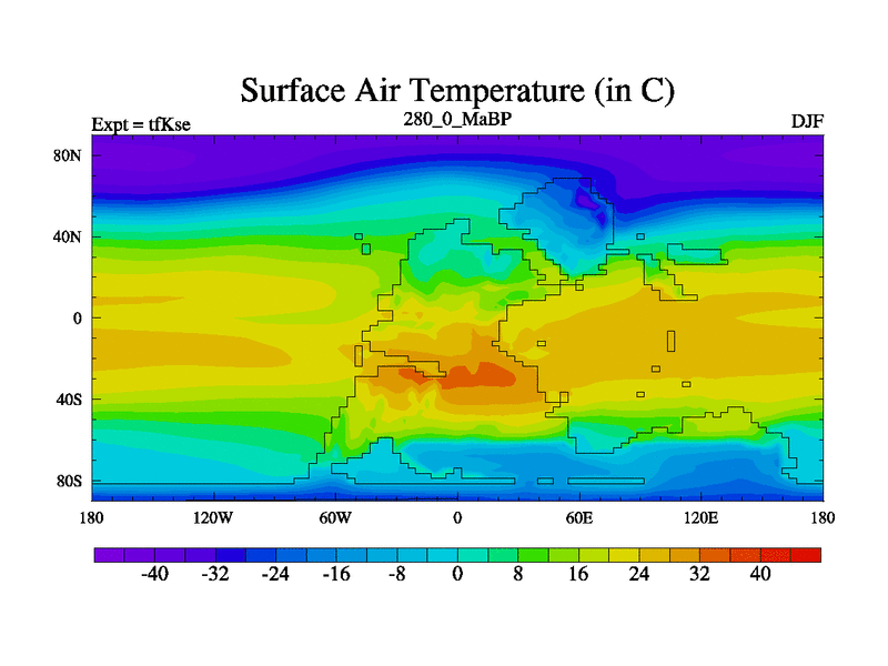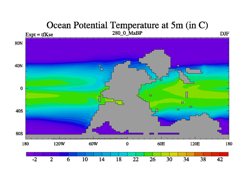 This is the 280.0 Ma simulation using the Scotese palaeogeographies and revised CCN etc. This version has islands and smoothing and desert albedo included. Tuned CO2 to give Scotese temperatures. Started from end of tfKee.