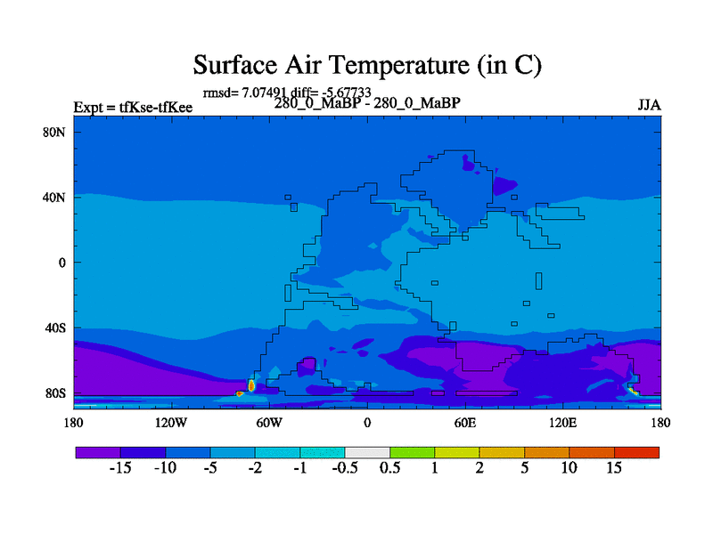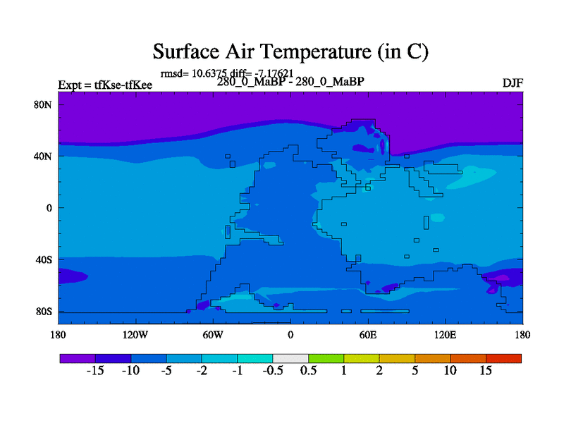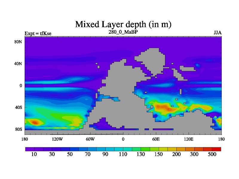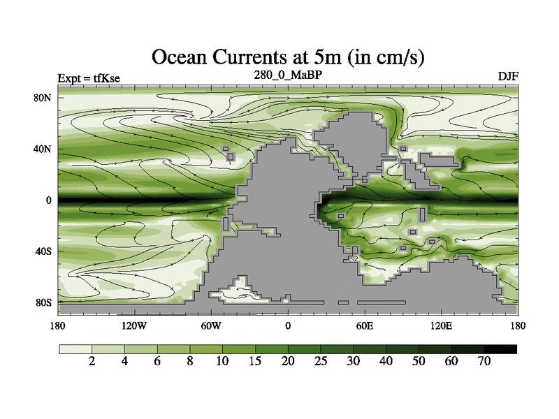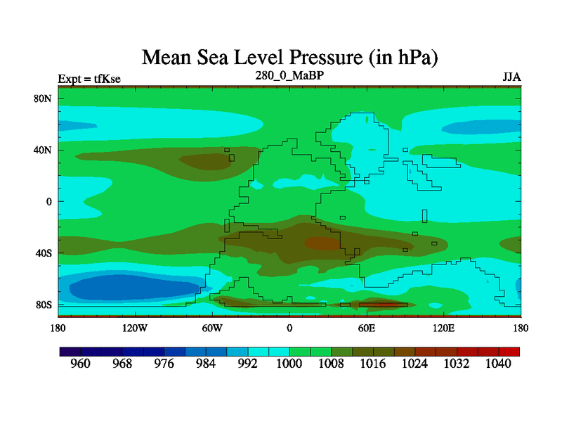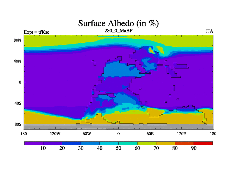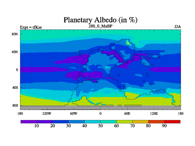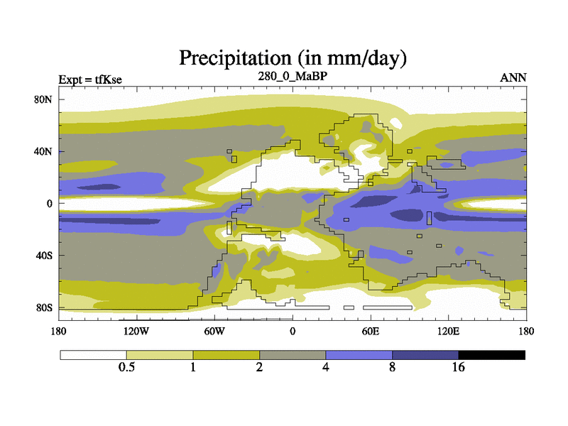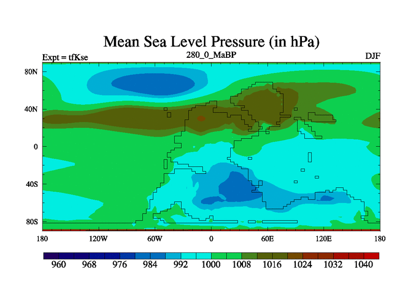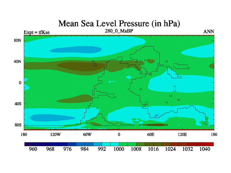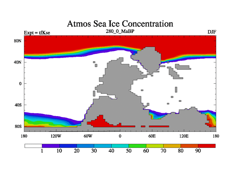 This is the 280.0 Ma simulation using the Scotese palaeogeographies and revised CCN etc. This version has islands and smoothing and desert albedo included. Tuned CO2 to give Scotese temperatures. Started from end of tfKee.