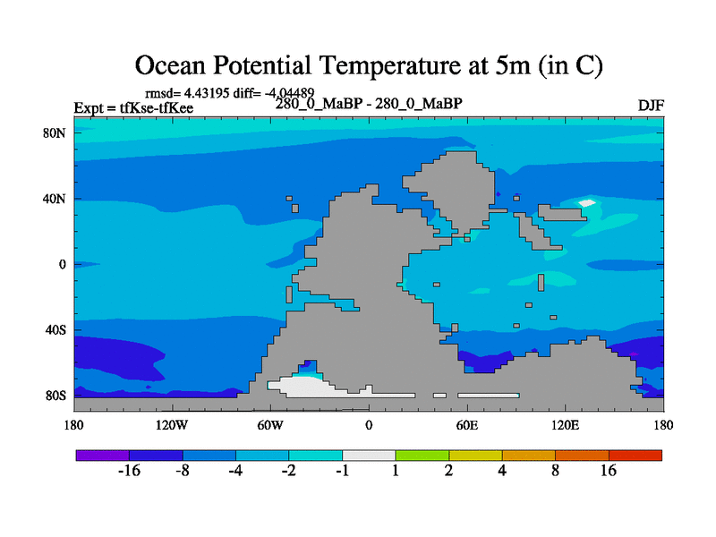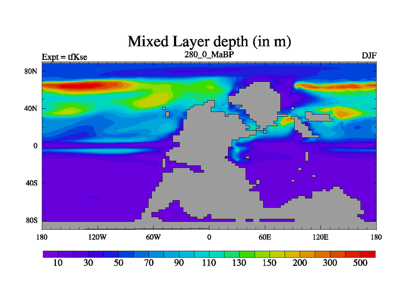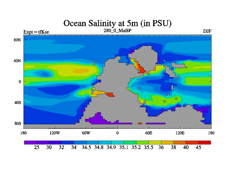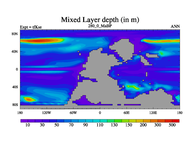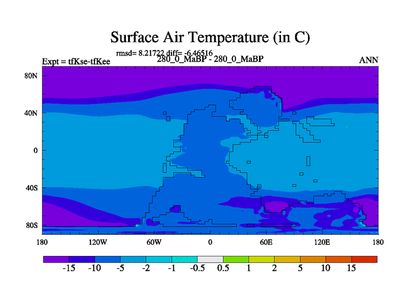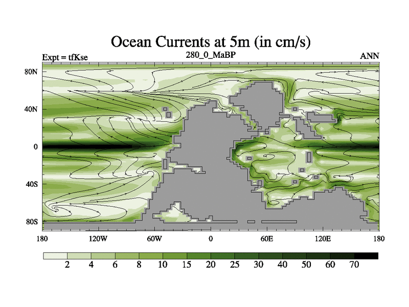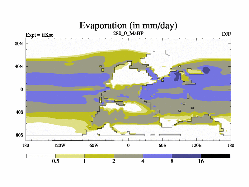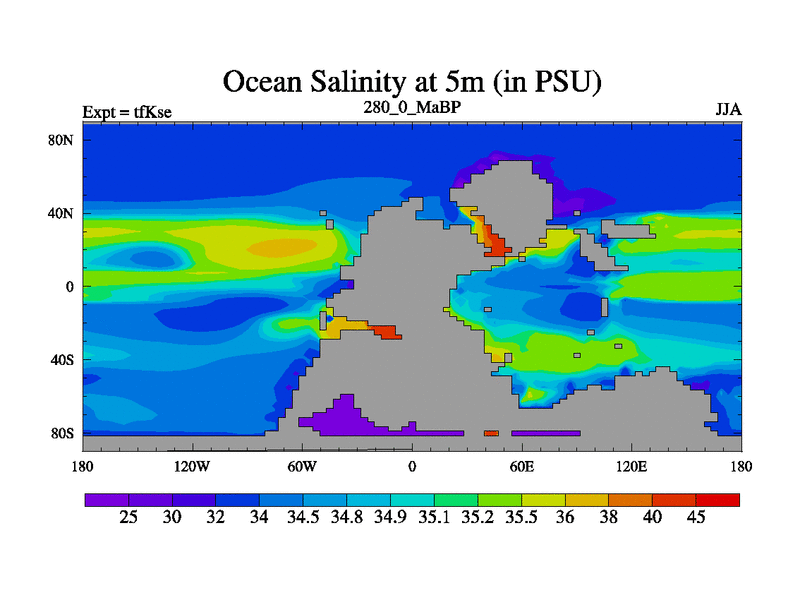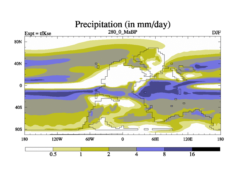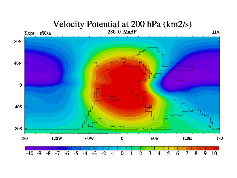 This is the 280.0 Ma simulation using the Scotese palaeogeographies and revised CCN etc. This version has islands and smoothing and desert albedo included. Tuned CO2 to give Scotese temperatures. Started from end of tfKee.