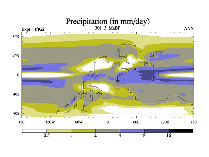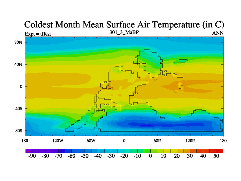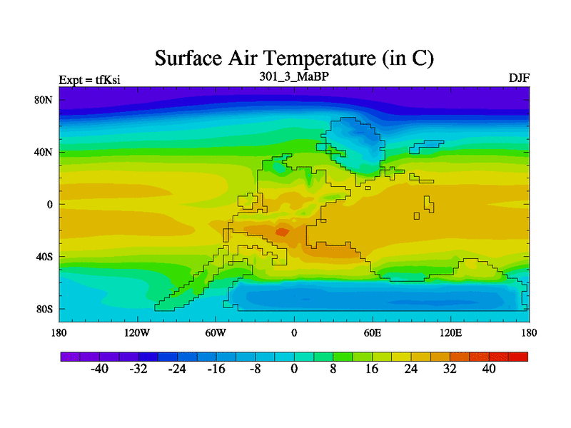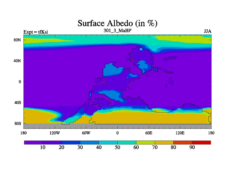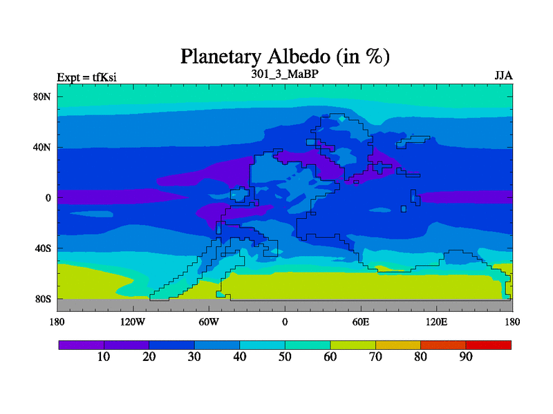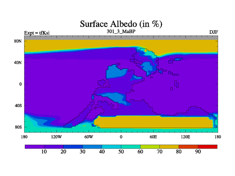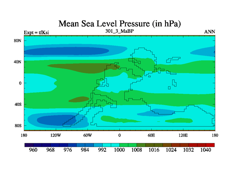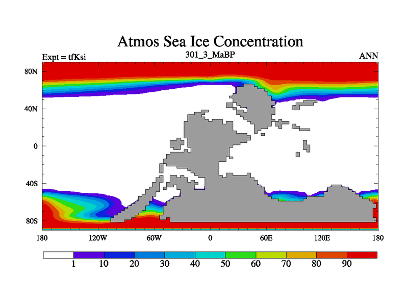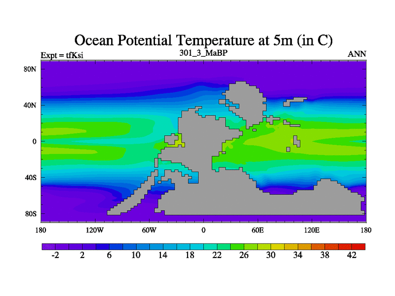 This is the 301.3 Ma simulation using the Scotese palaeogeographies and revised CCN etc. This version has islands and smoothing and desert albedo included. Tuned CO2 to give Scotese temperatures. Started from end of tfKei.