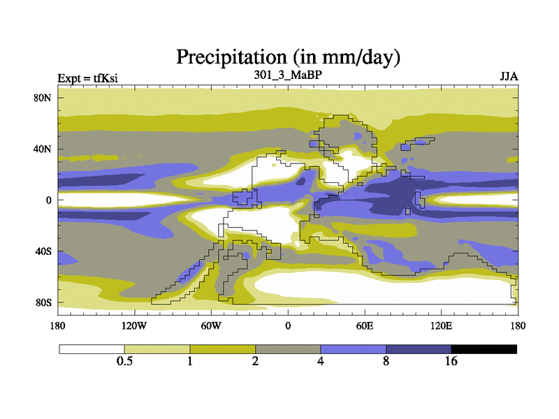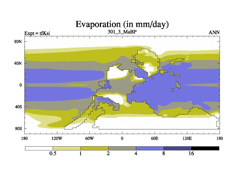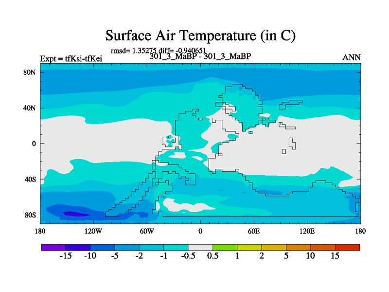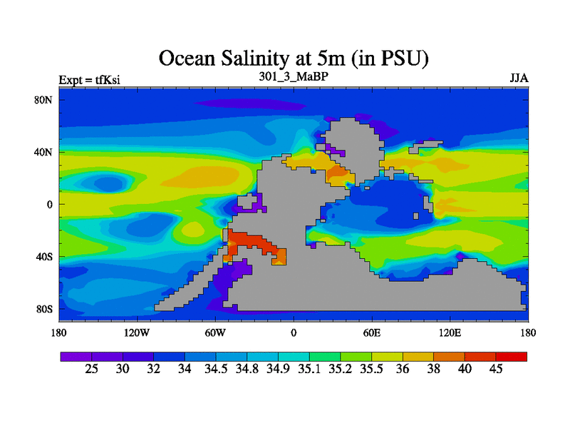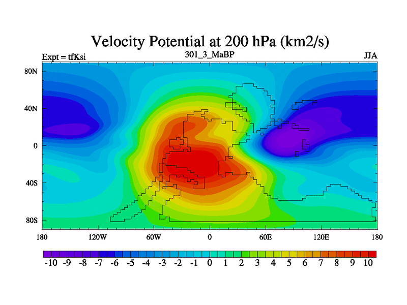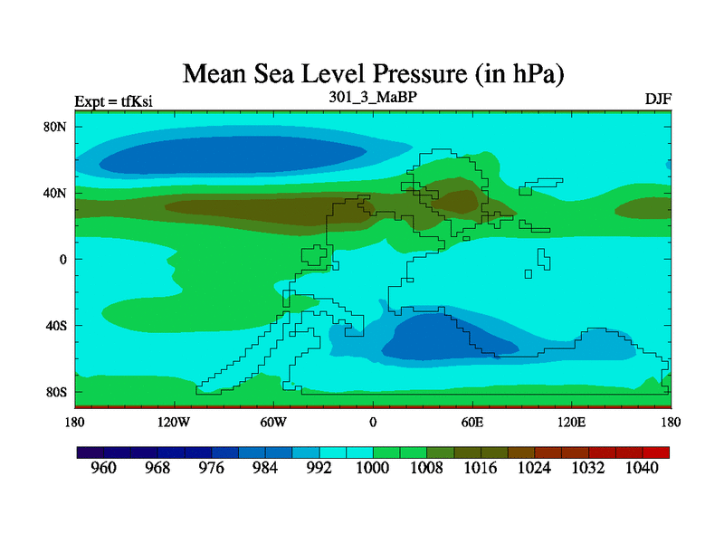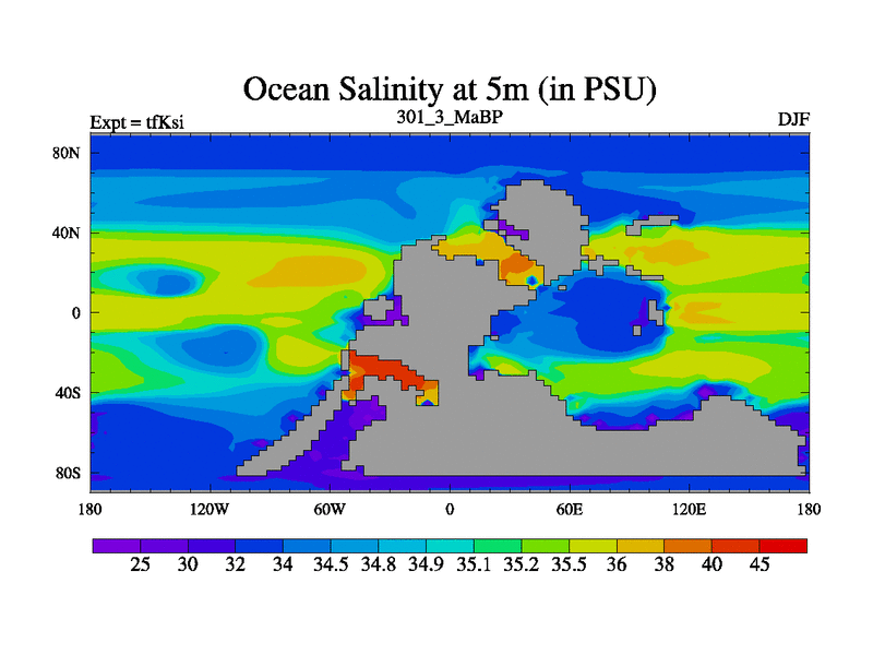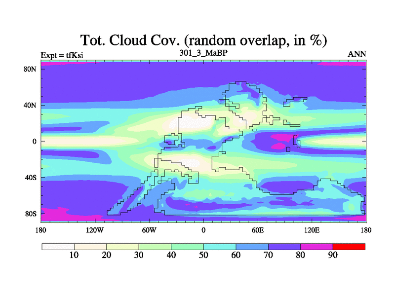 This is the 301.3 Ma simulation using the Scotese palaeogeographies and revised CCN etc. This version has islands and smoothing and desert albedo included. Tuned CO2 to give Scotese temperatures. Started from end of tfKei.
