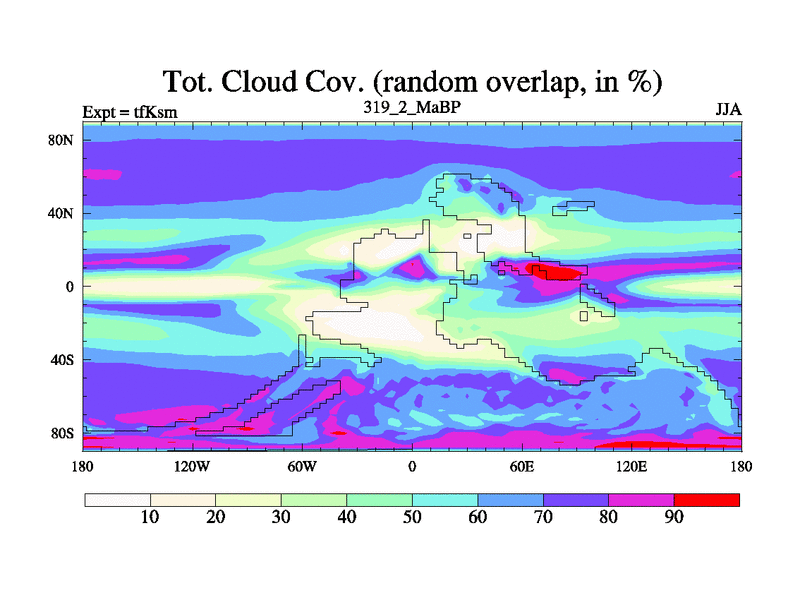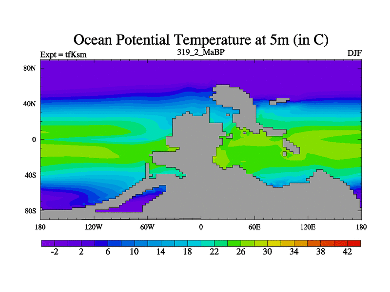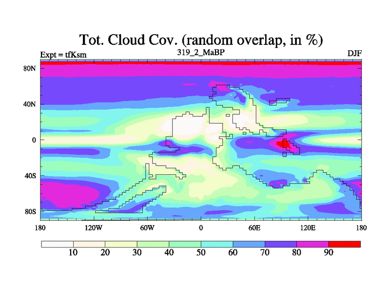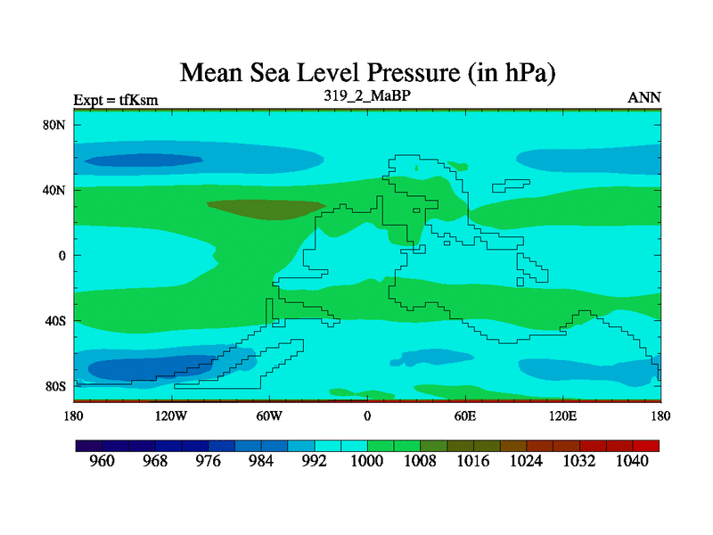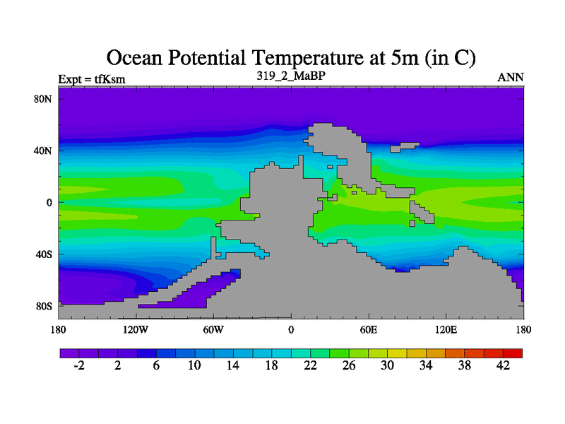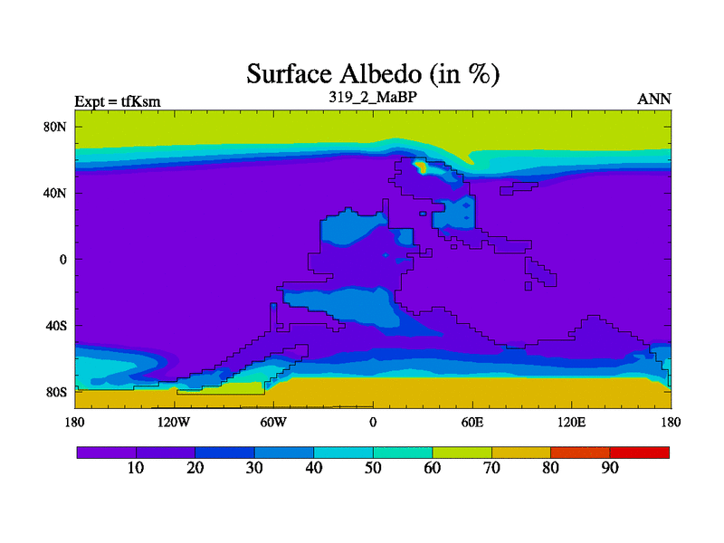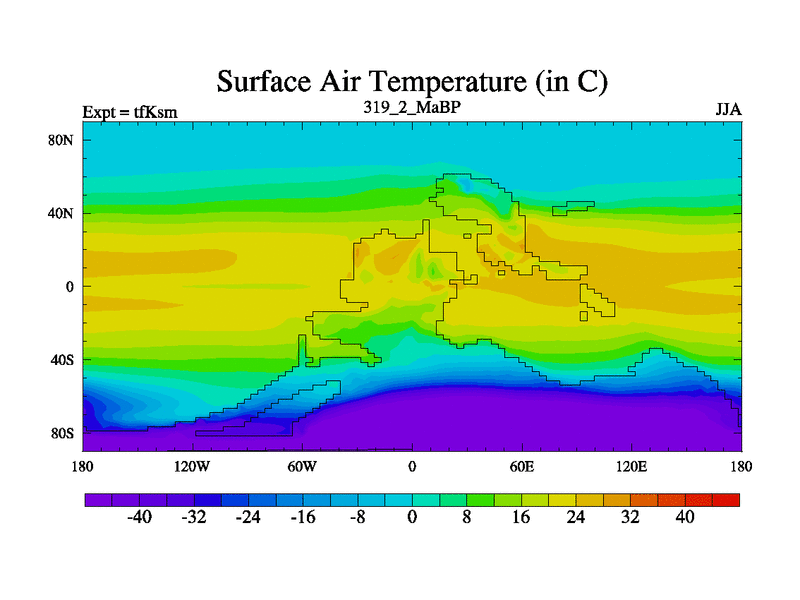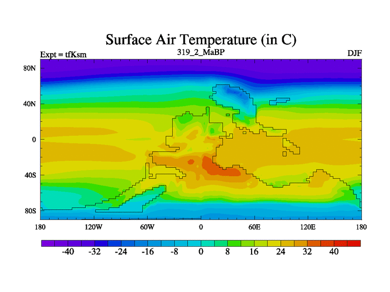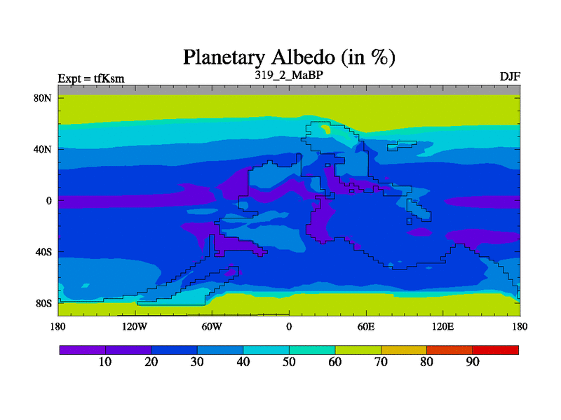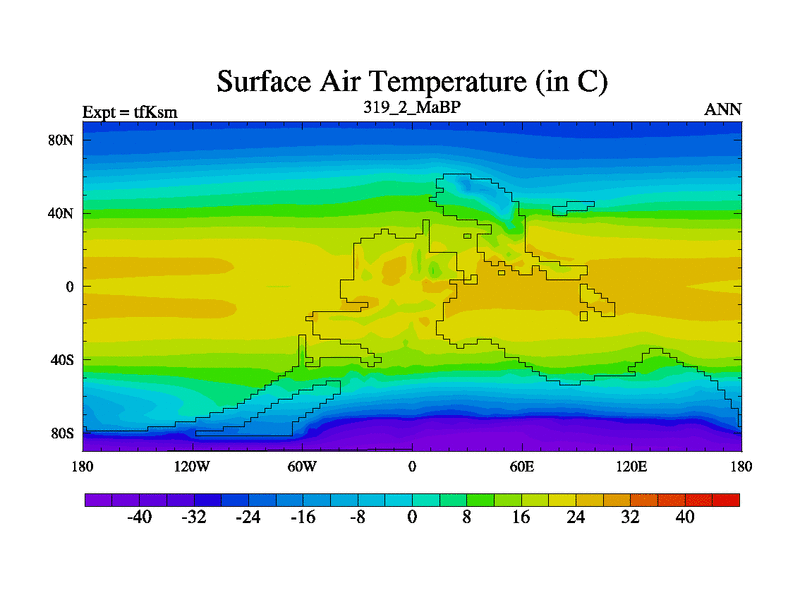 This is the 319.2 Ma simulation using the Scotese palaeogeographies and revised CCN etc. This version has islands and smoothing and desert albedo included. Tuned CO2 to give Scotese temperatures. Started from end of tfKem.
