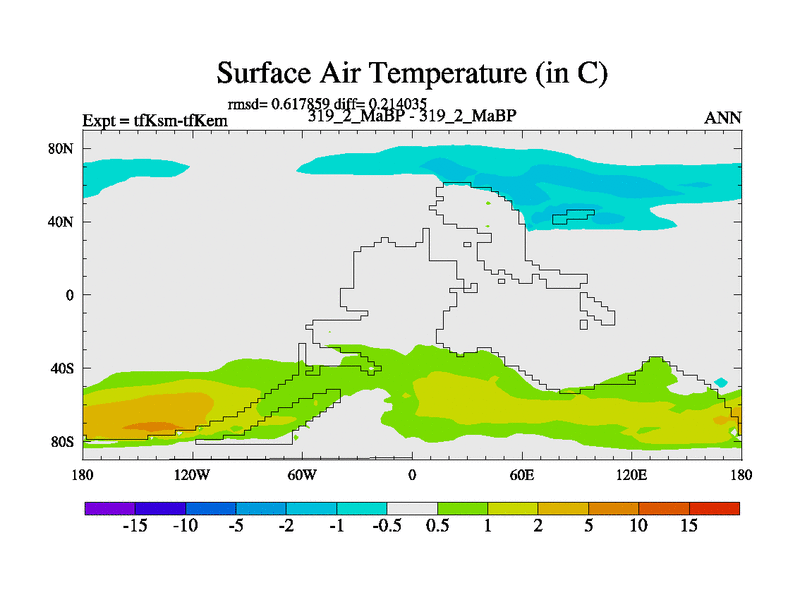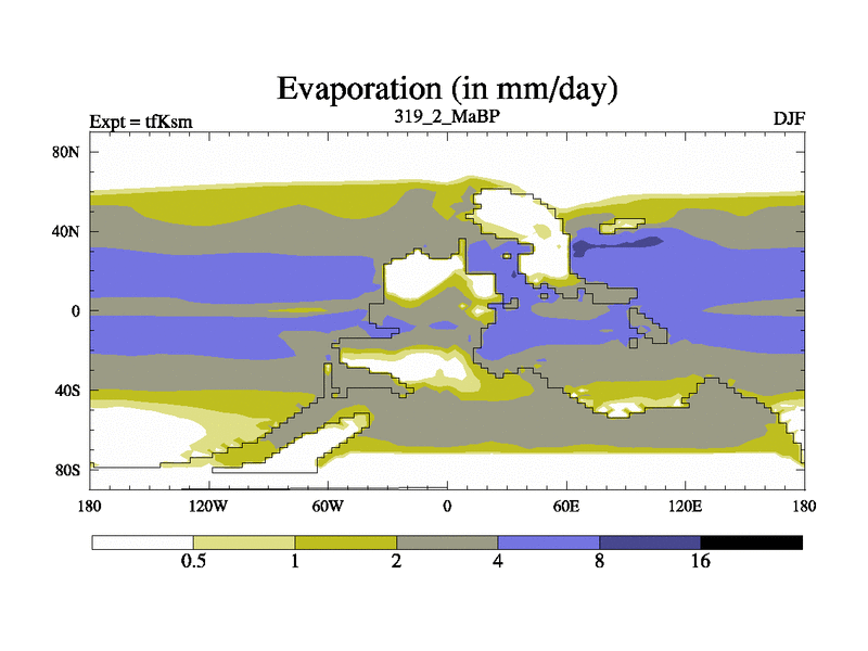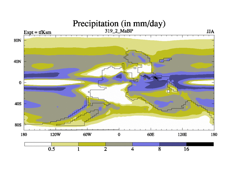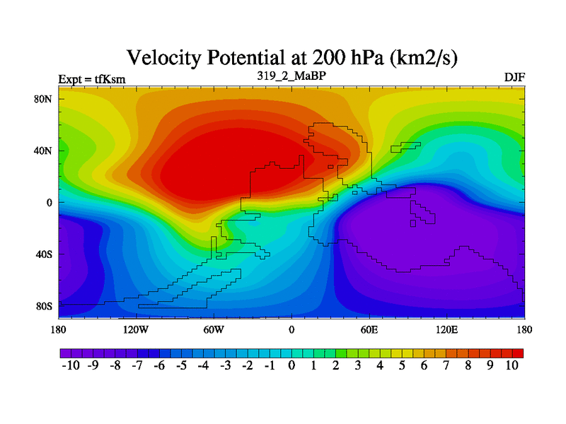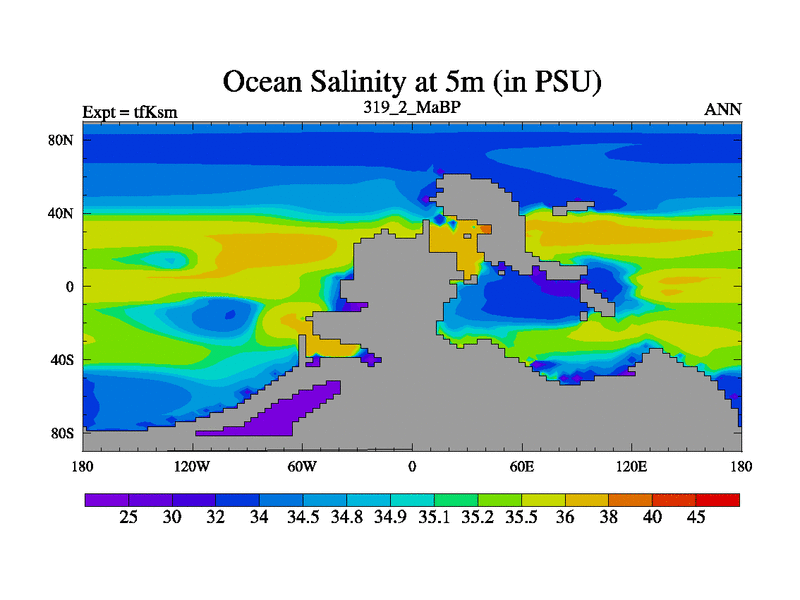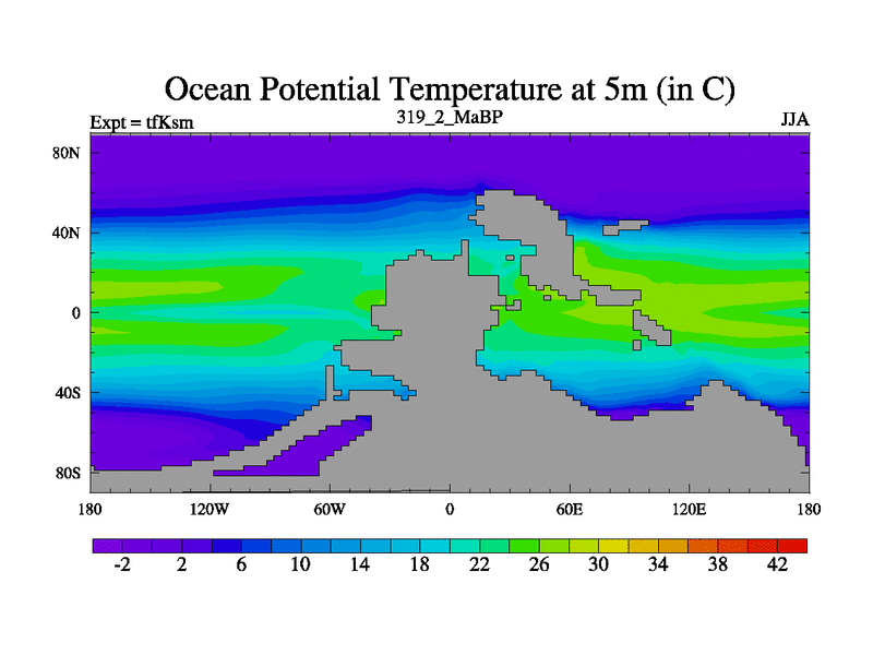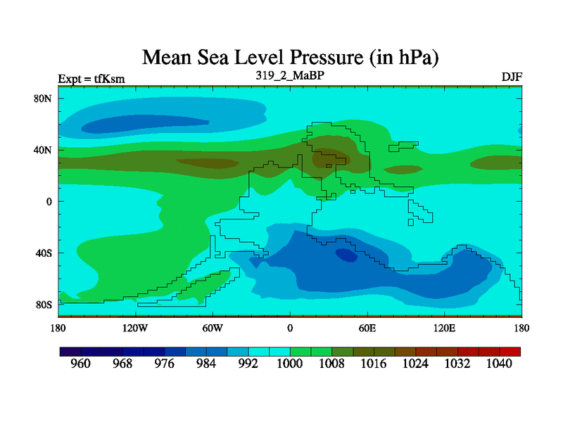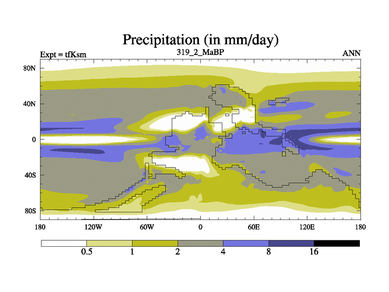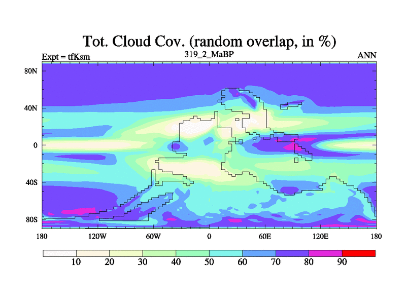 This is the 319.2 Ma simulation using the Scotese palaeogeographies and revised CCN etc. This version has islands and smoothing and desert albedo included. Tuned CO2 to give Scotese temperatures. Started from end of tfKem.