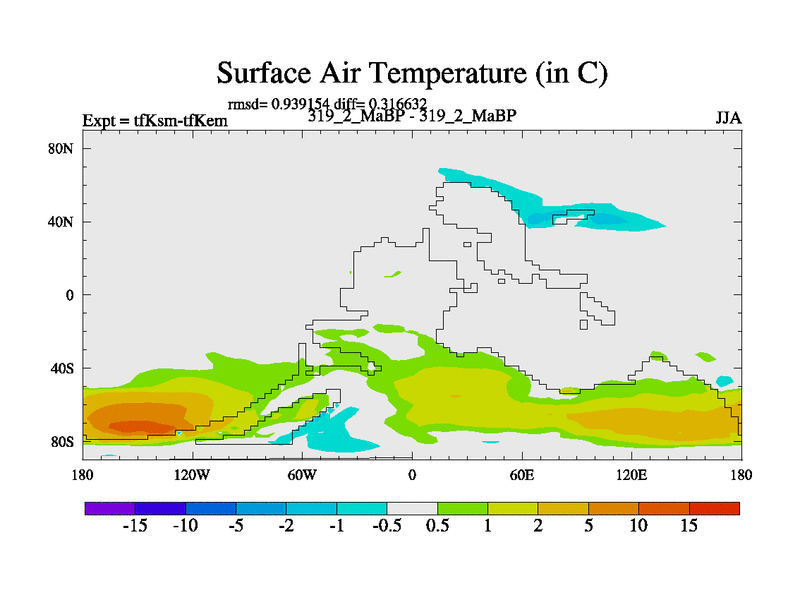 Scientifically as benchmark except using water age update, dark respiration, salinity conservation and revised ozone. Also using new orbital and solar update, and outputting leaf CO2. This version has islands included and atmospheric smoothing and desert albedo. Tuned CO2 to give Scotese temperatures. Started from end of tfKem.