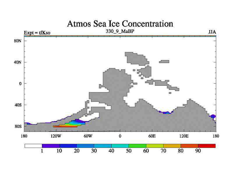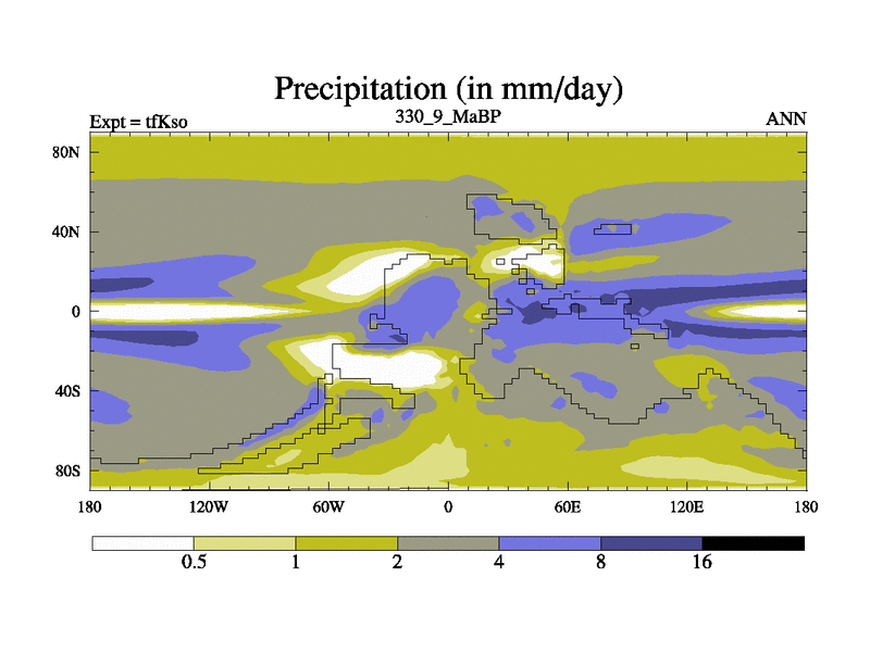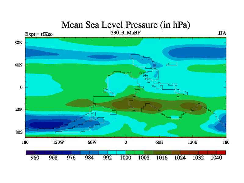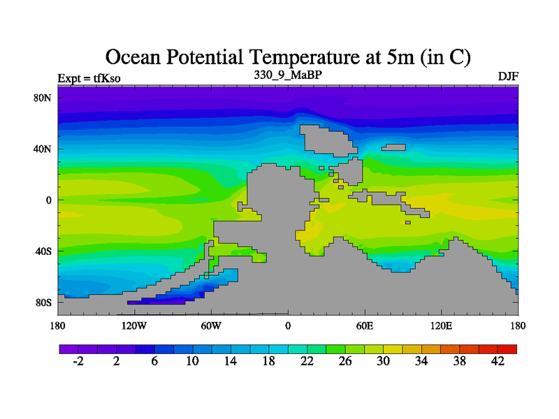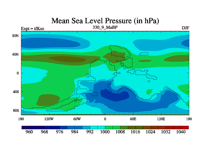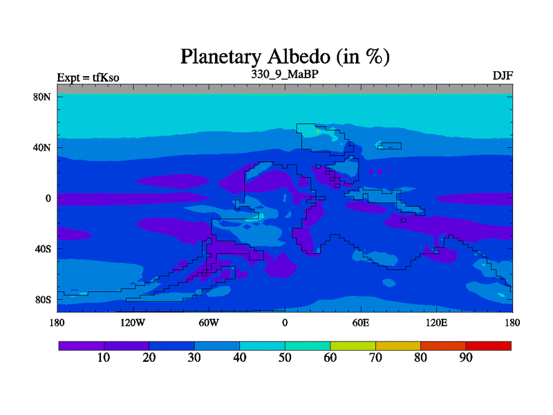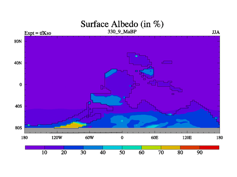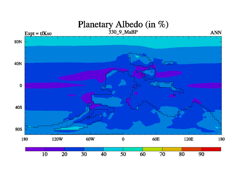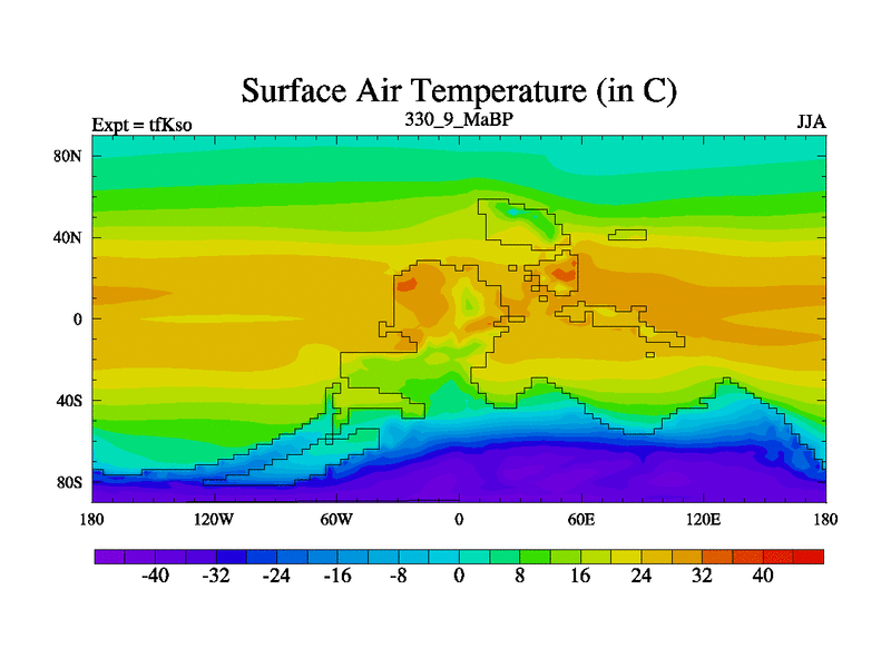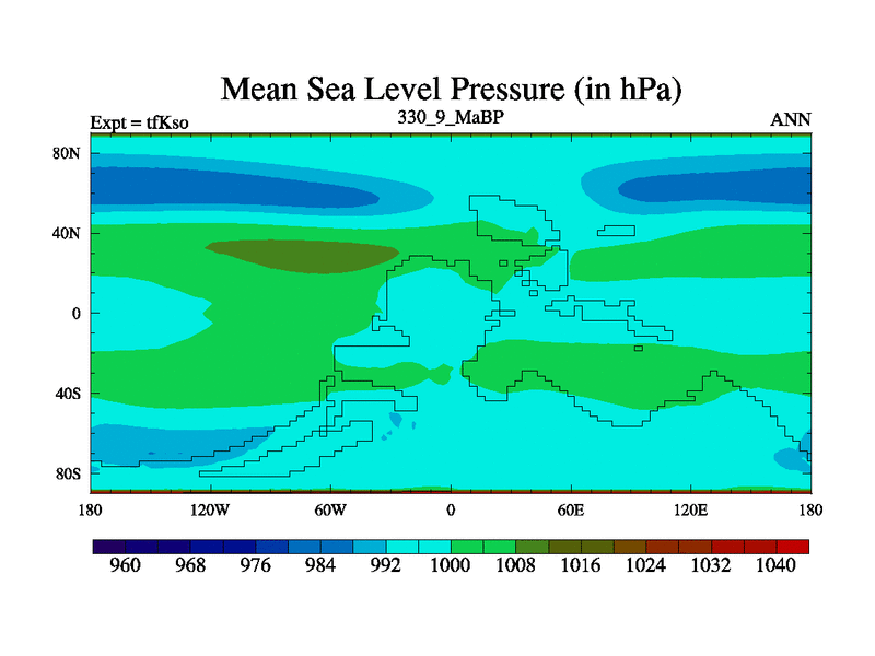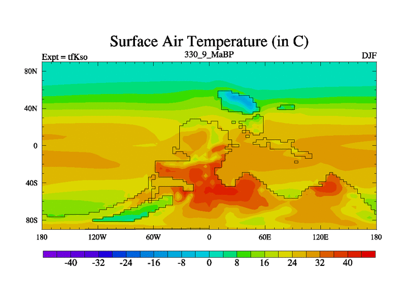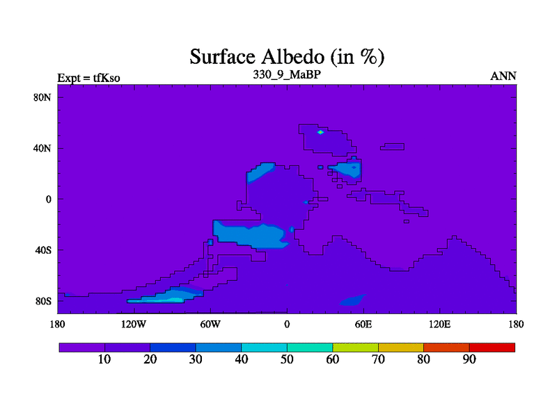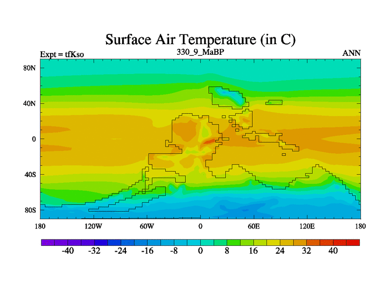 This is the 330.9 Ma simulation using the Scotese palaeogeographies and revised CCN etc. This version has islands and smoothing and desert albedo included. Tuned CO2 to give Scotese temperatures. Started from end of tfKeo.