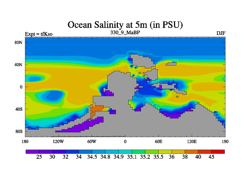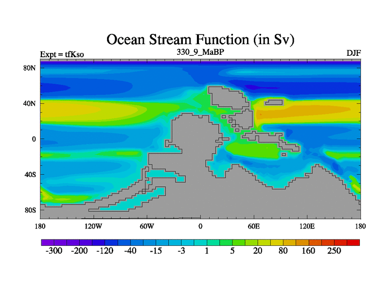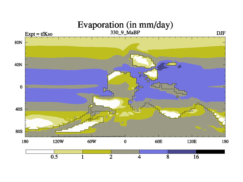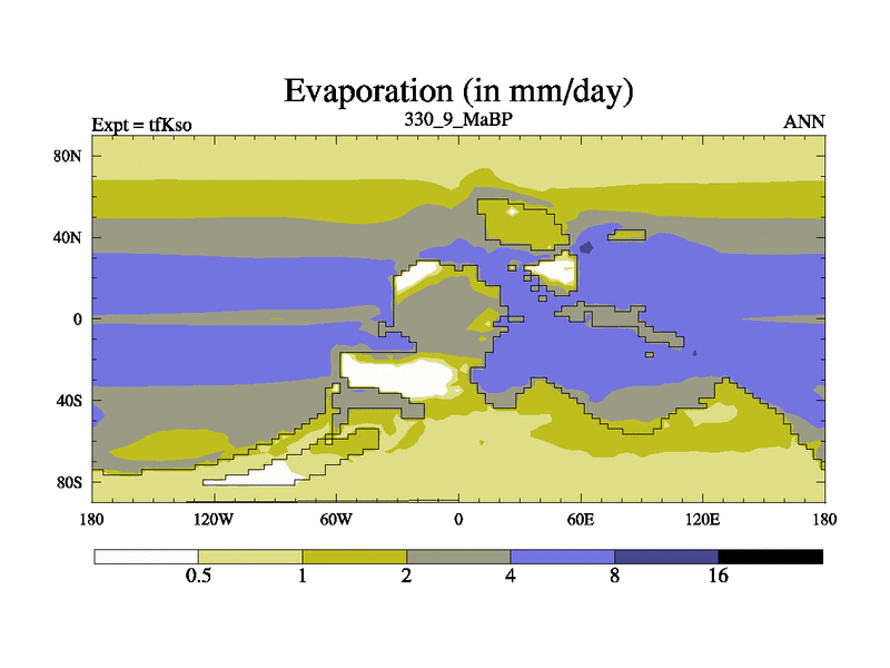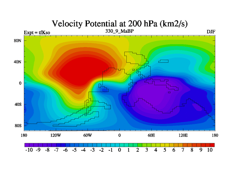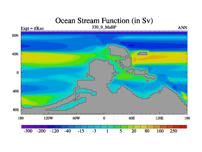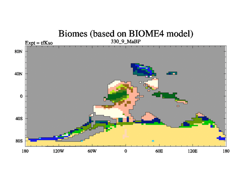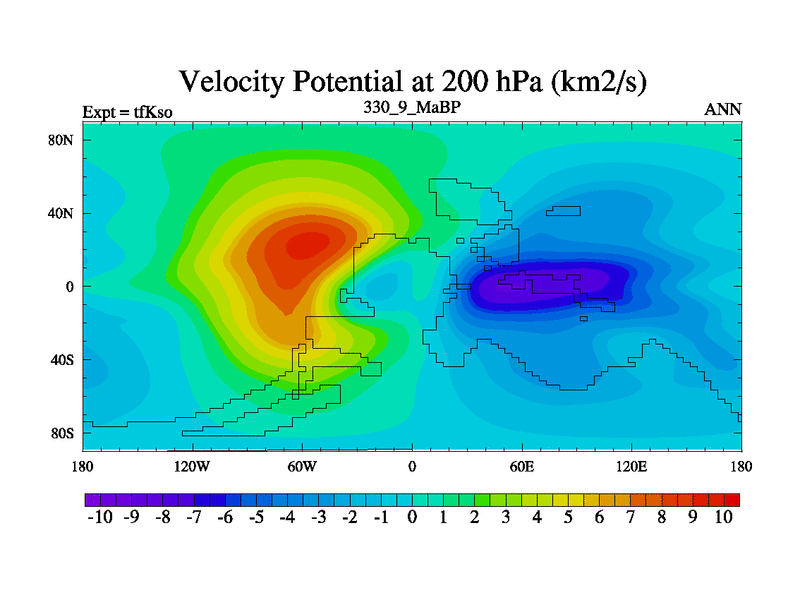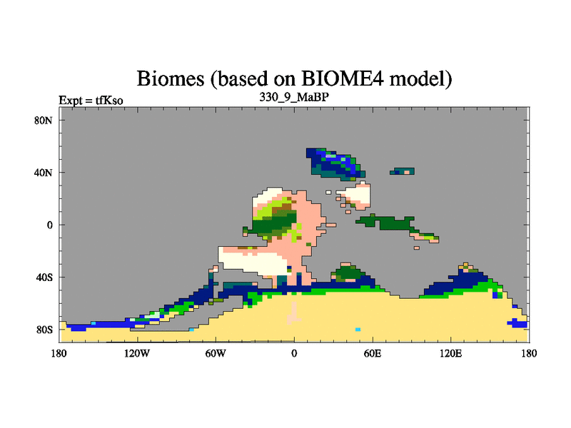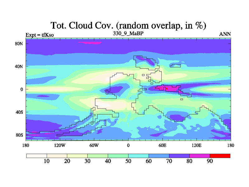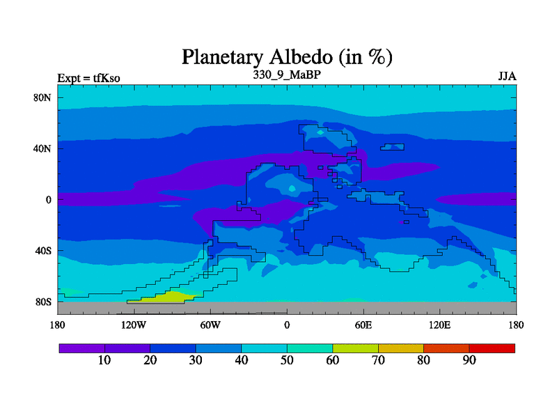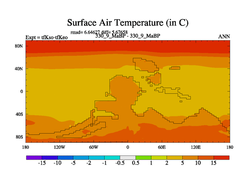 This is the 330.9 Ma simulation using the Scotese palaeogeographies and revised CCN etc. This version has islands and smoothing and desert albedo included. Tuned CO2 to give Scotese temperatures. Started from end of tfKeo.
