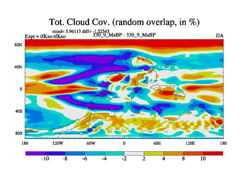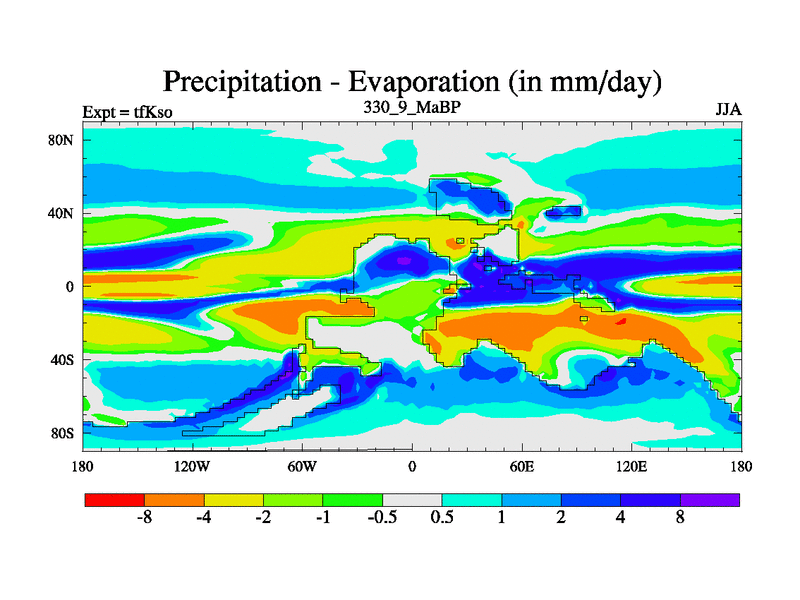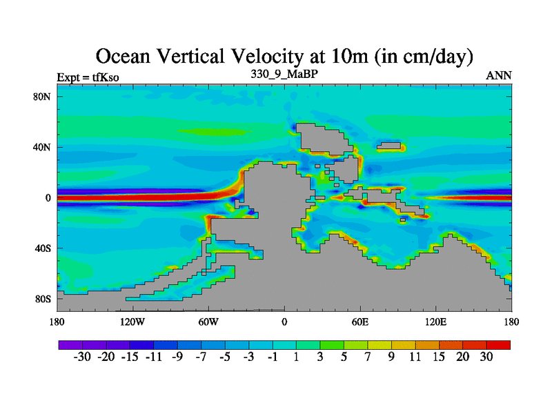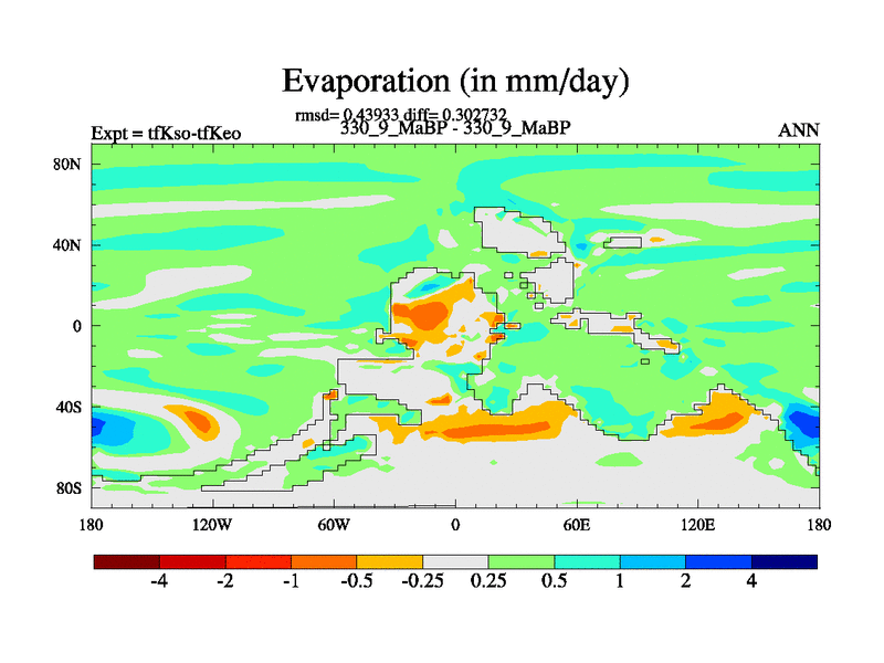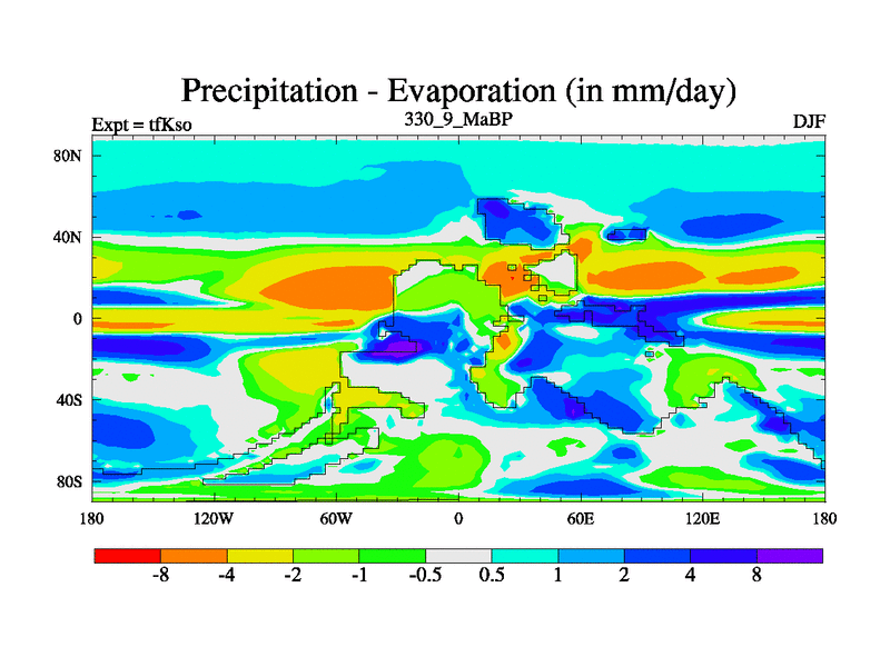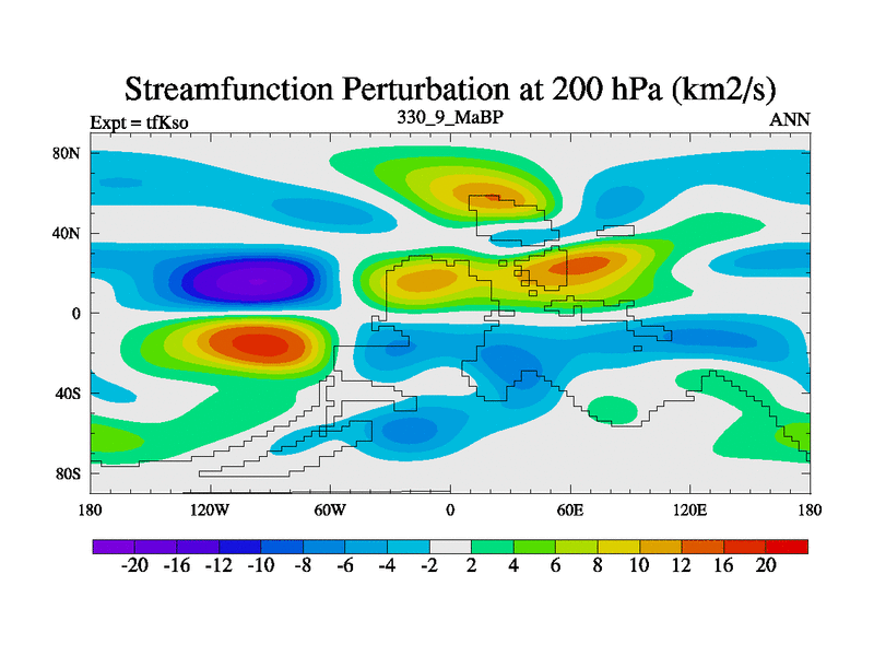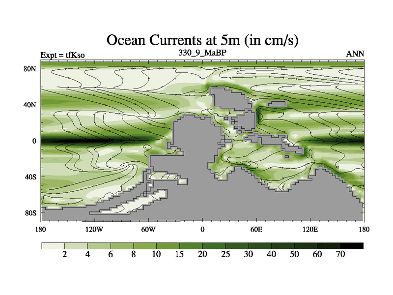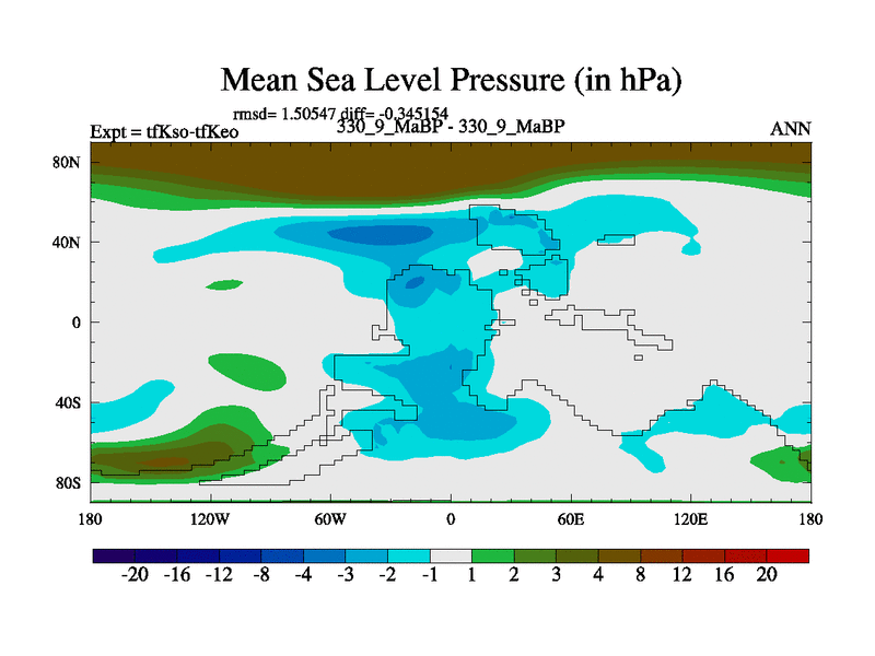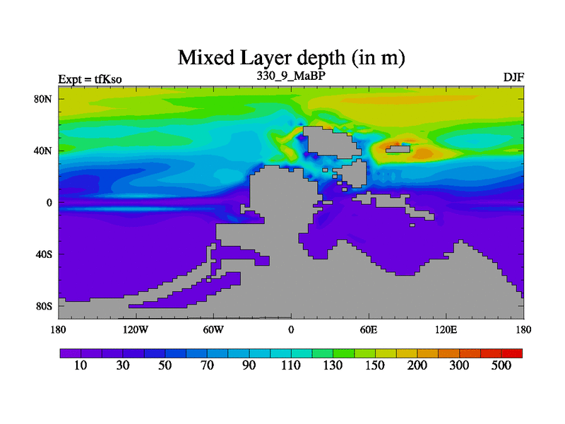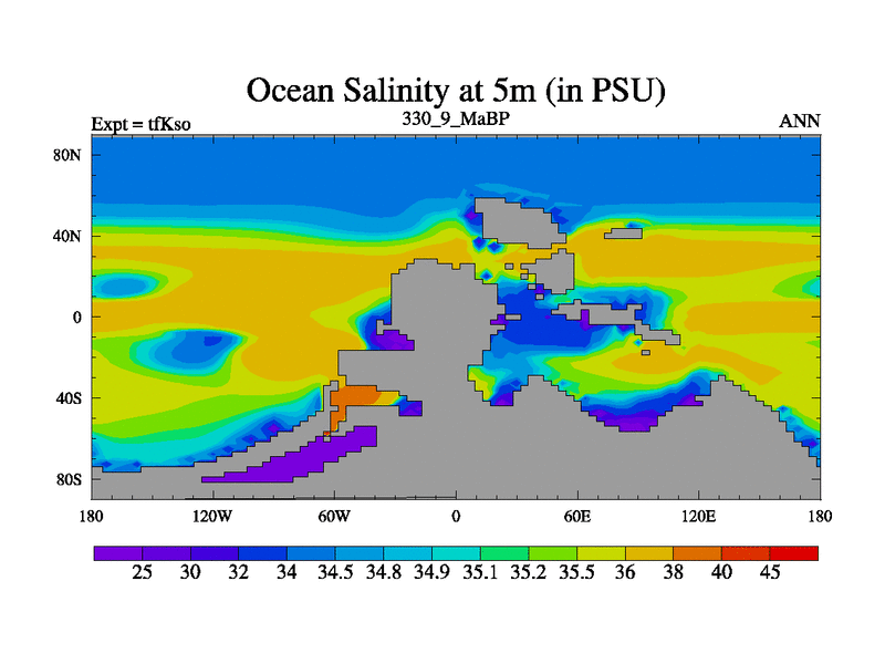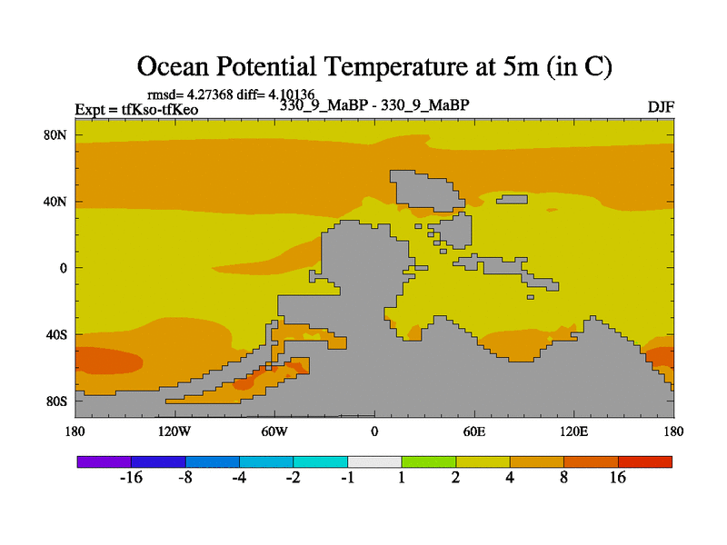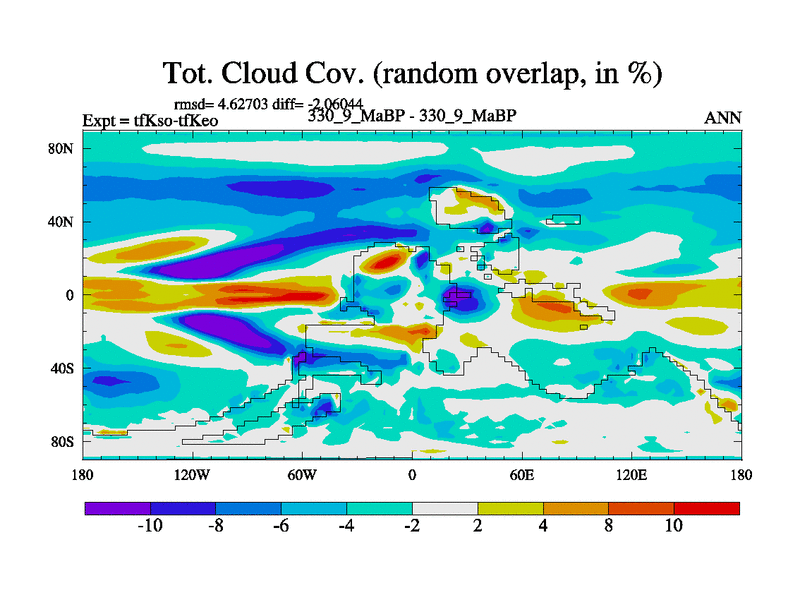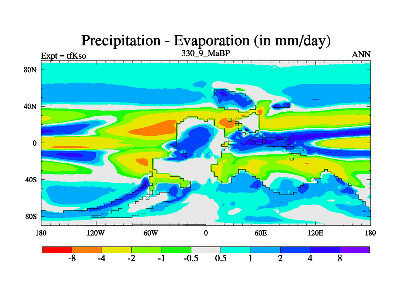 This is the 330.9 Ma simulation using the Scotese palaeogeographies and revised CCN etc. This version has islands and smoothing and desert albedo included. Tuned CO2 to give Scotese temperatures. Started from end of tfKeo.
