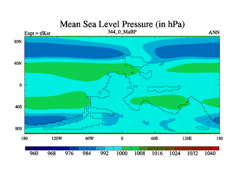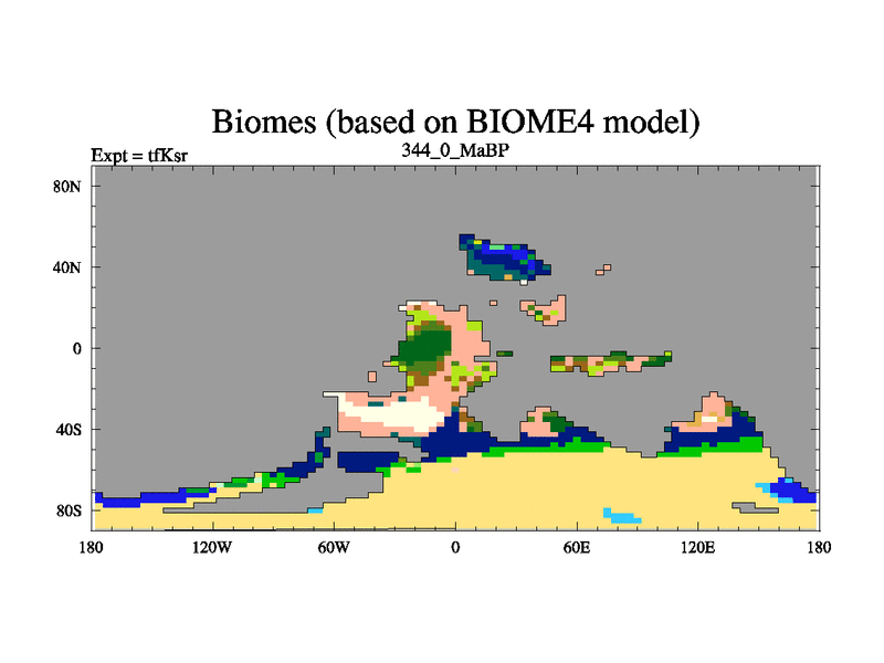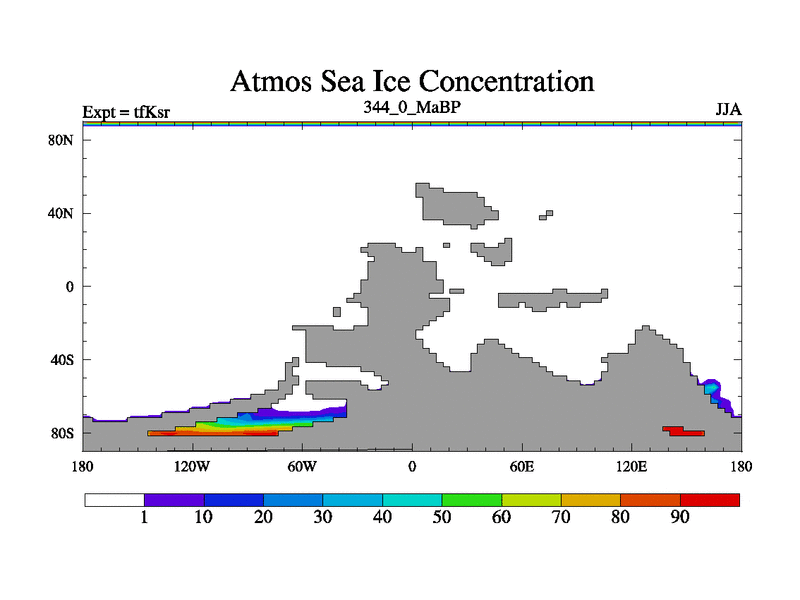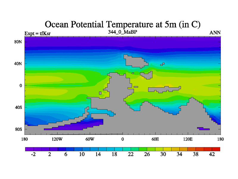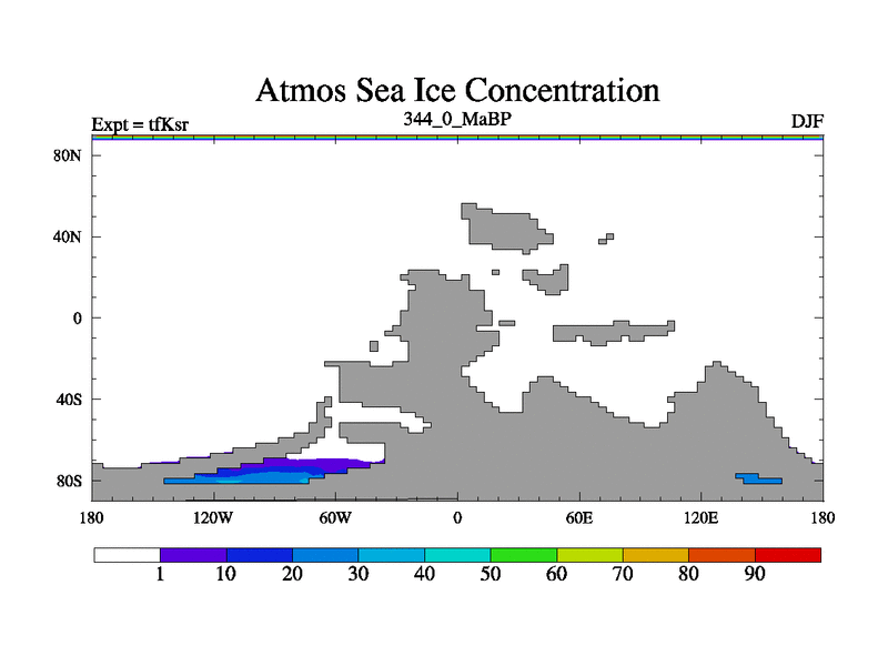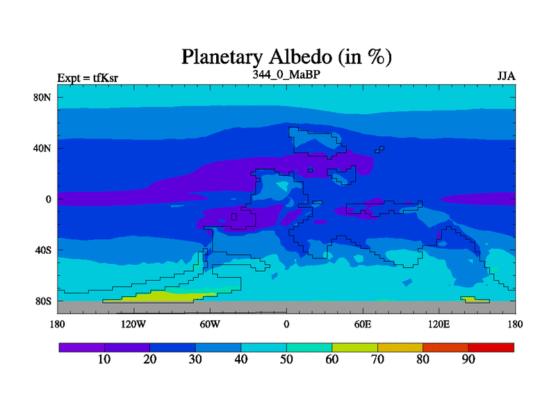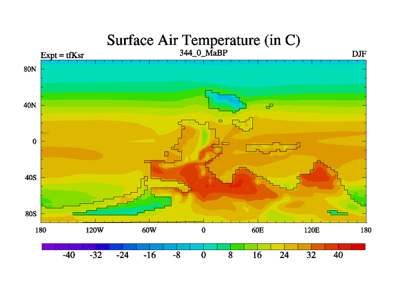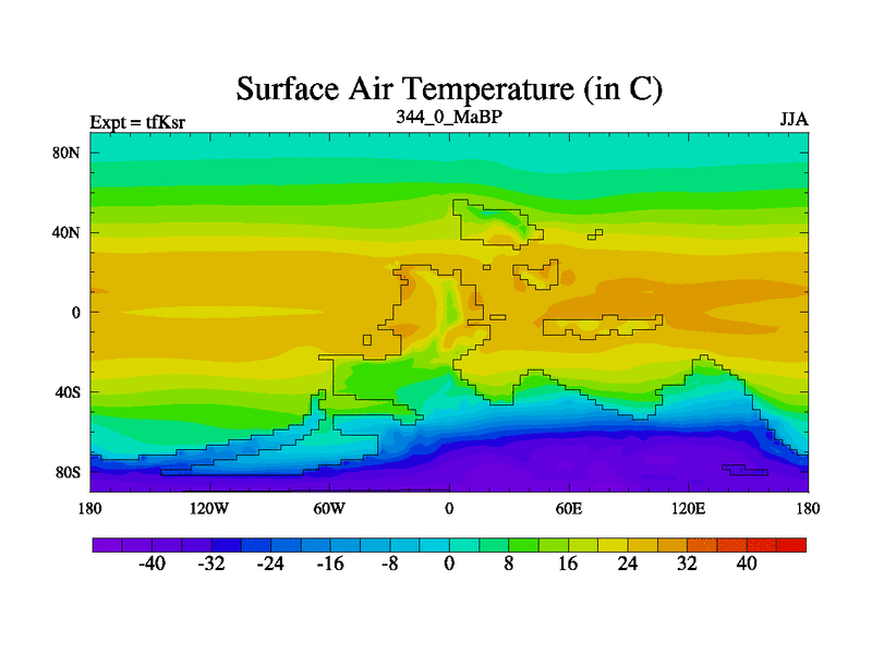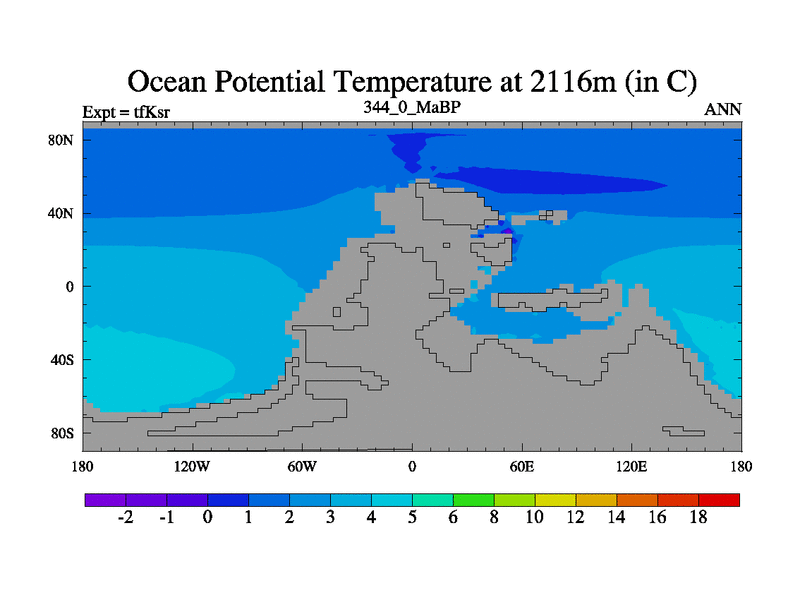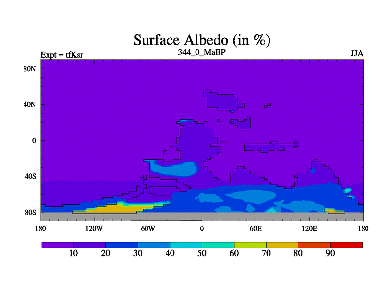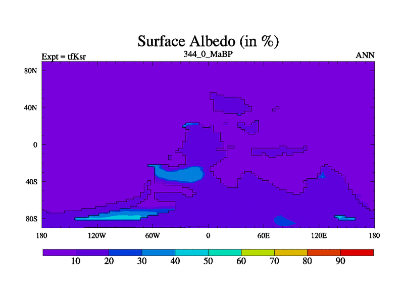 This is the 344.0 Ma simulation using the Scotese palaeogeographies and revised CCN etc. This version has islands and smoothing and desert albedo included. Tuned CO2 to give Scotese temperatures. Started from end of tfKer.