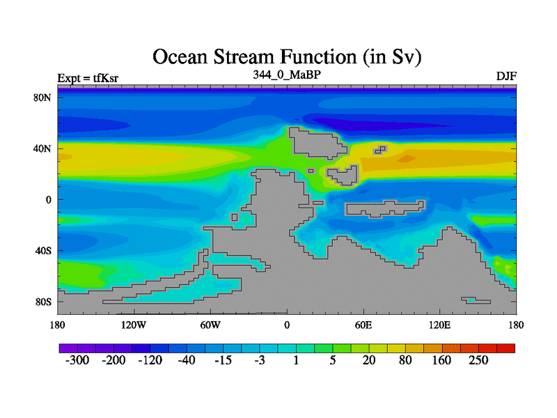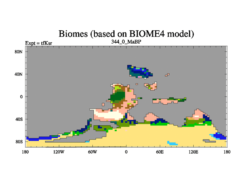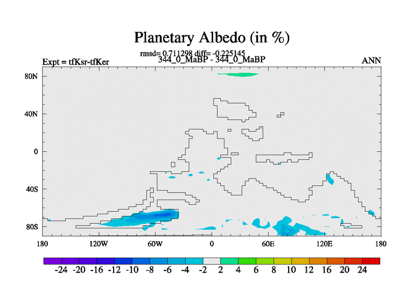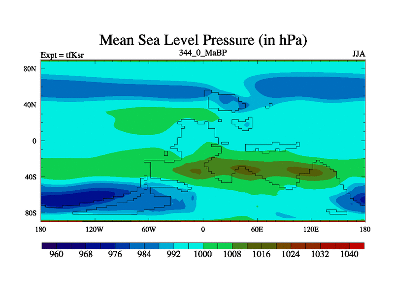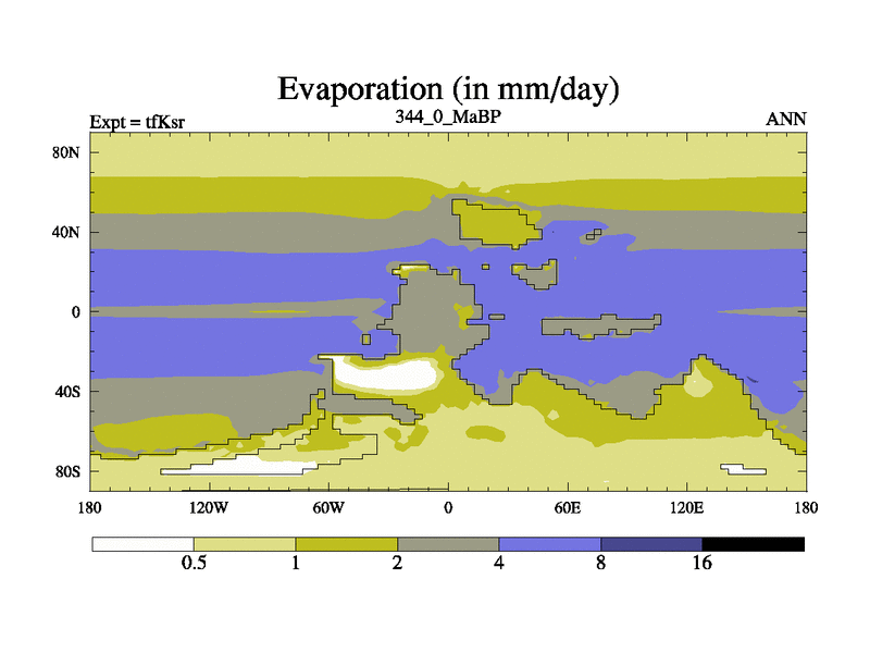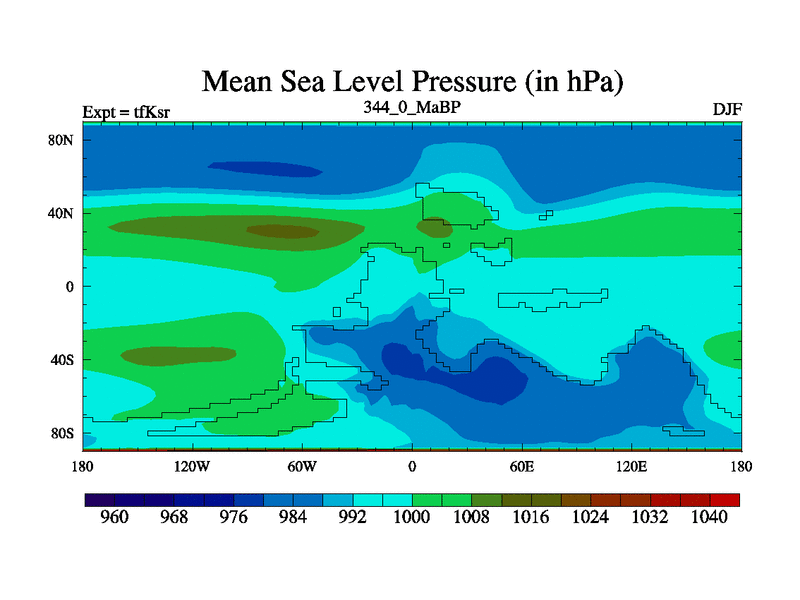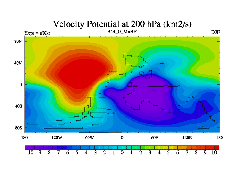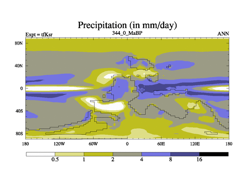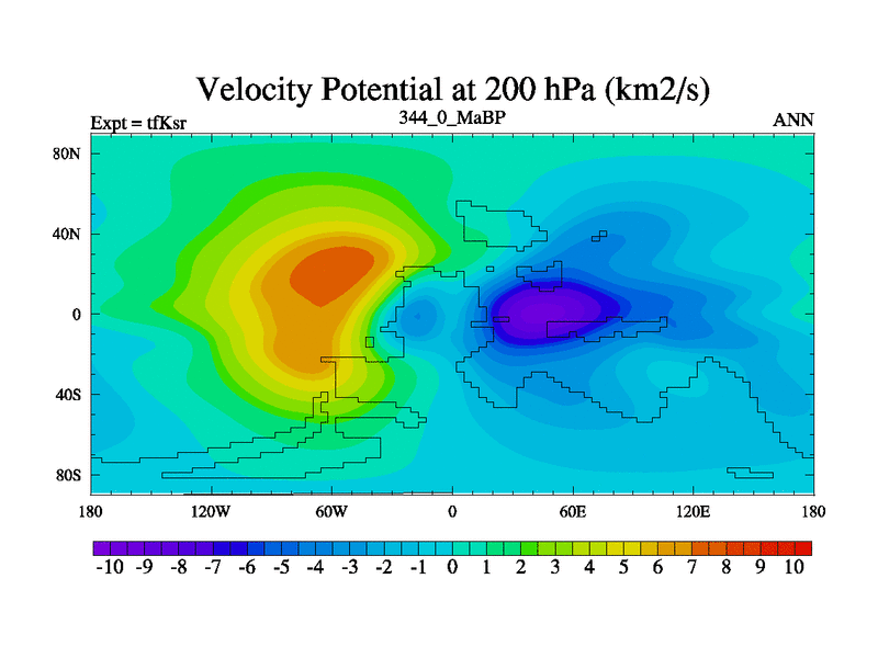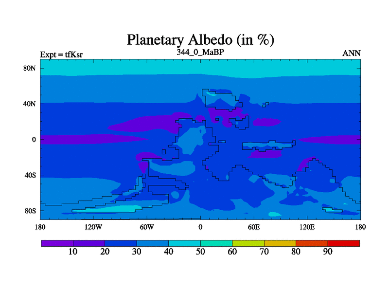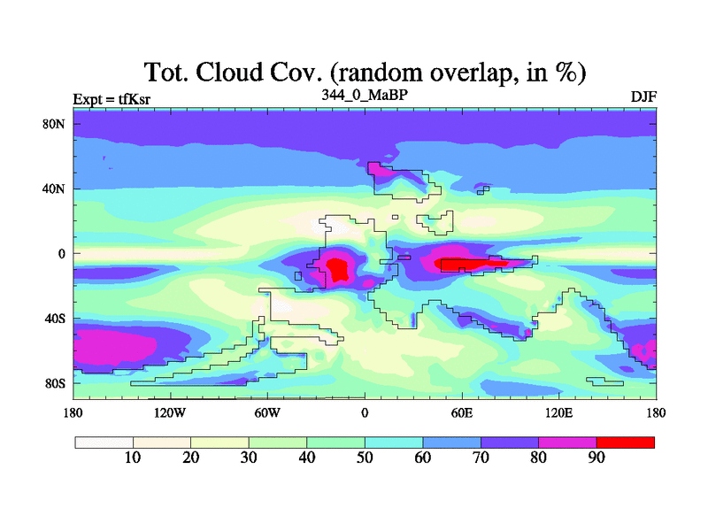 This is the 344.0 Ma simulation using the Scotese palaeogeographies and revised CCN etc. This version has islands and smoothing and desert albedo included. Tuned CO2 to give Scotese temperatures. Started from end of tfKer.