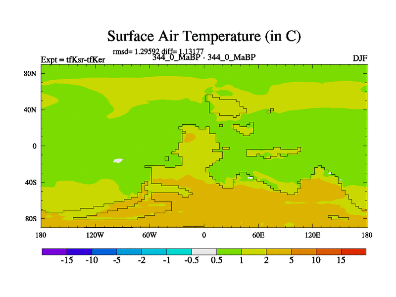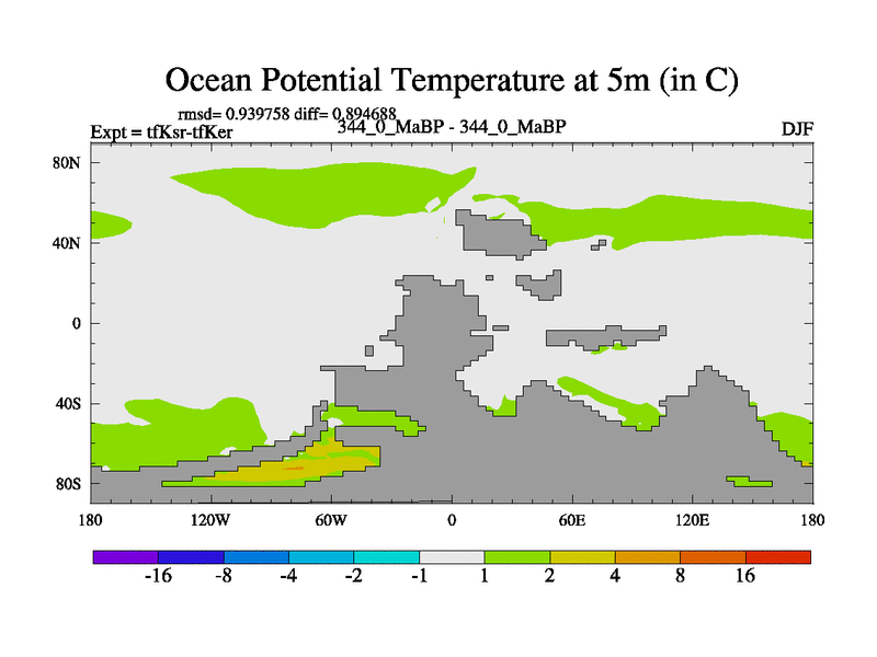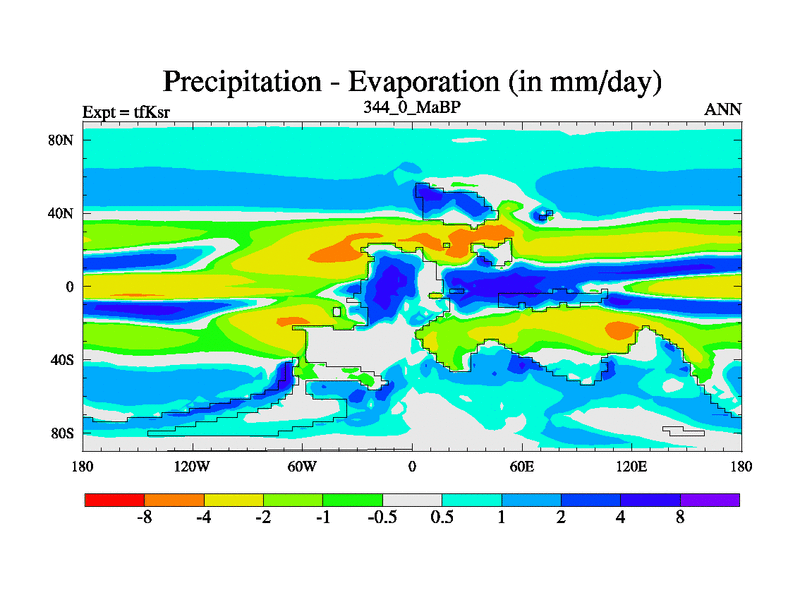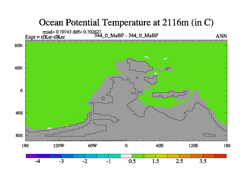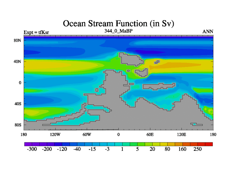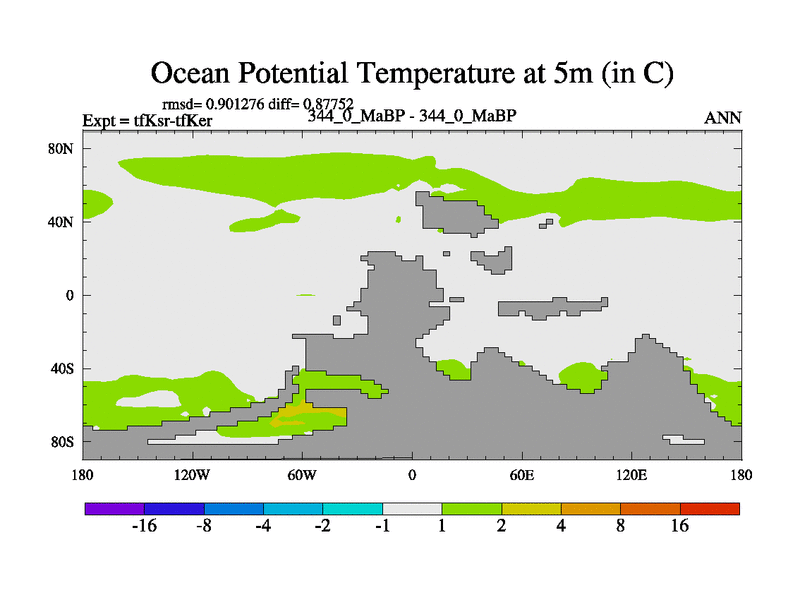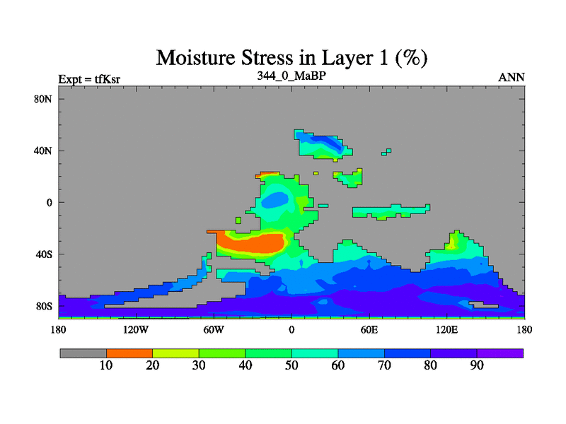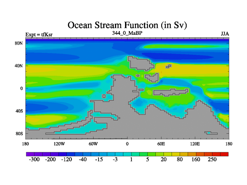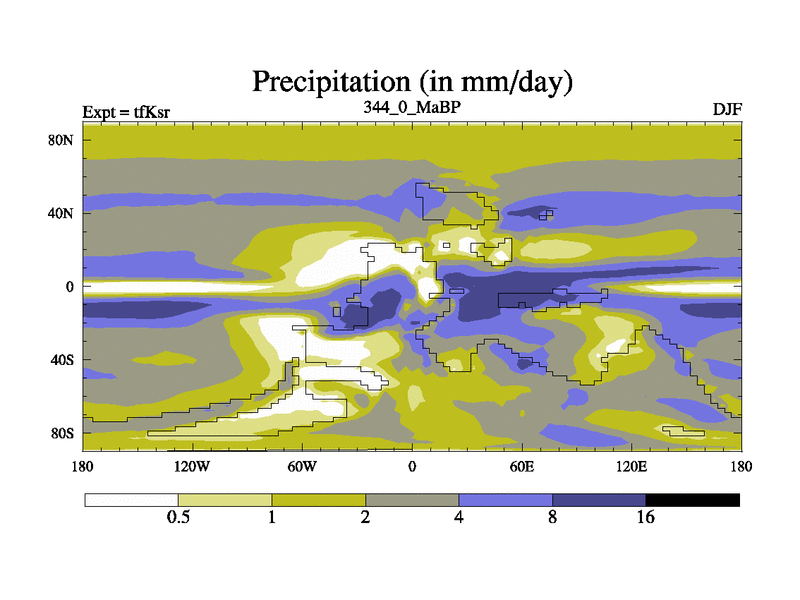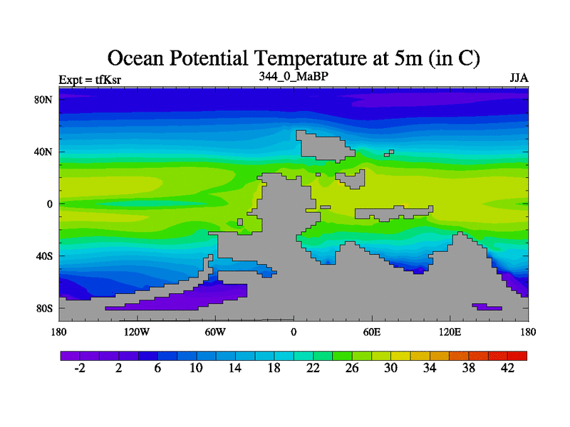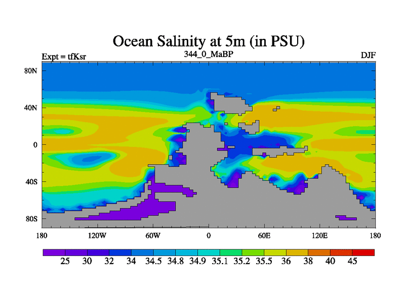 This is the 344.0 Ma simulation using the Scotese palaeogeographies and revised CCN etc. This version has islands and smoothing and desert albedo included. Tuned CO2 to give Scotese temperatures. Started from end of tfKer.