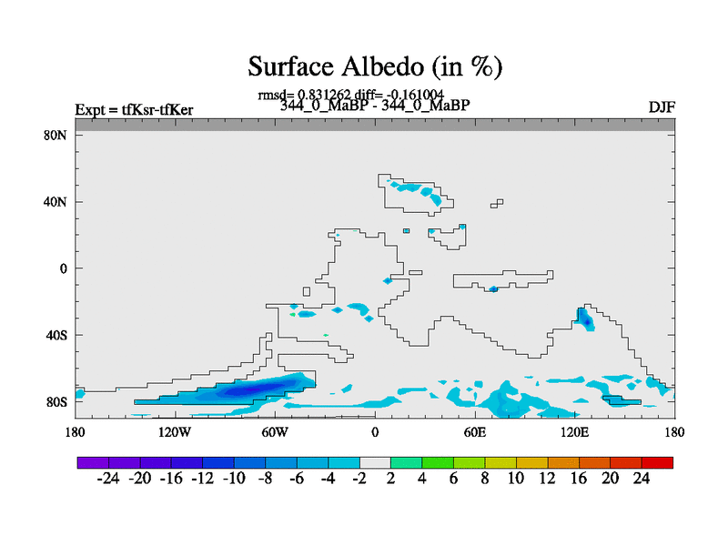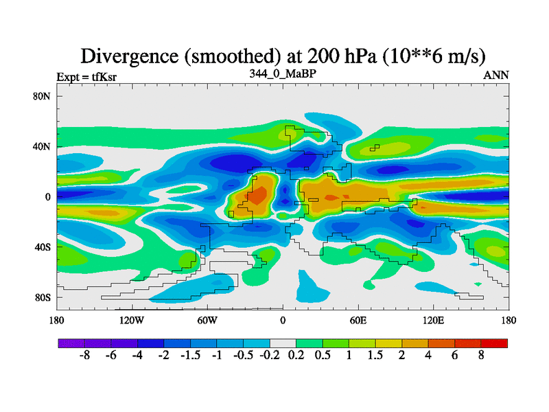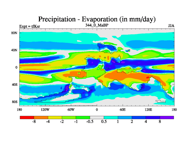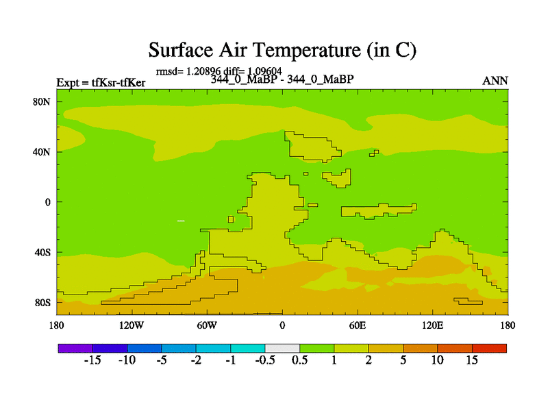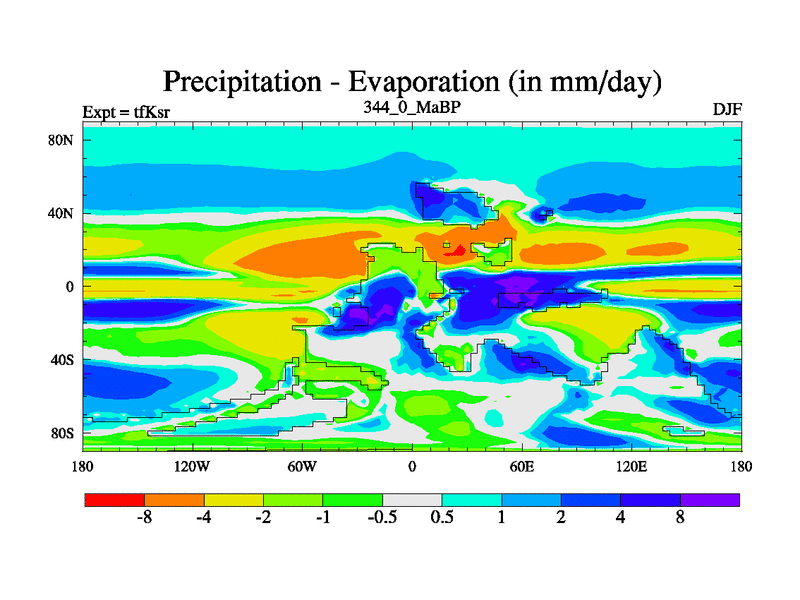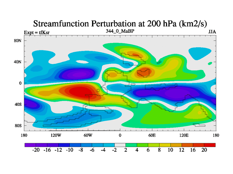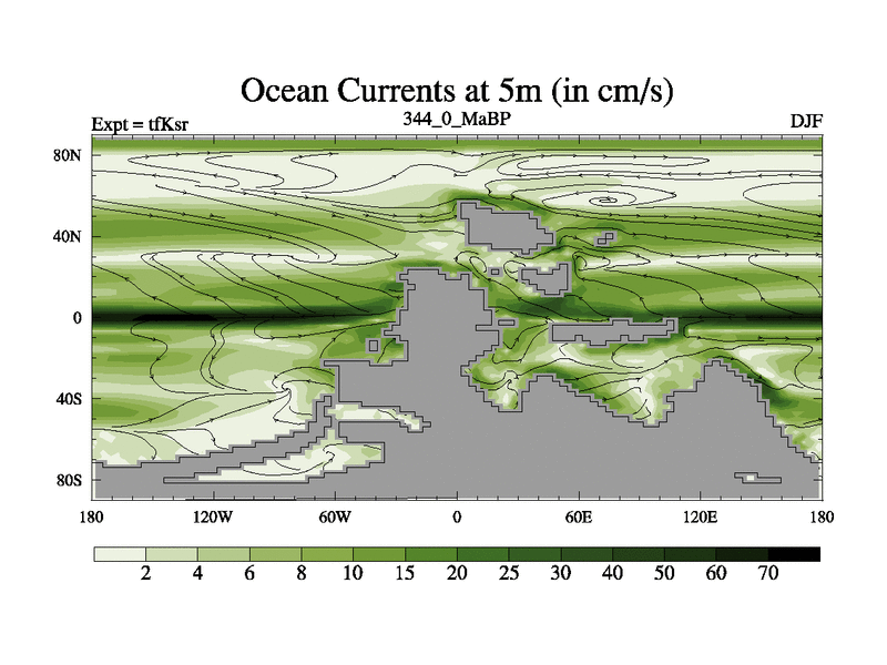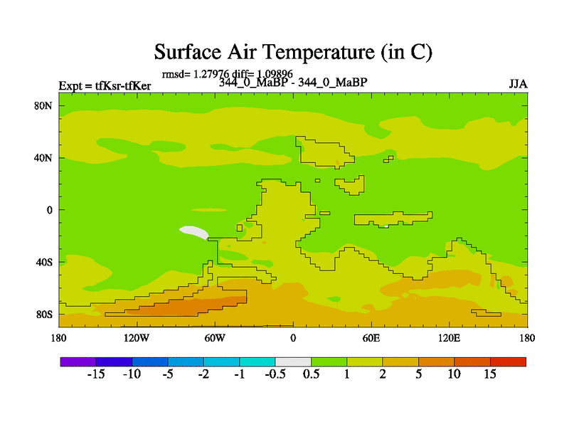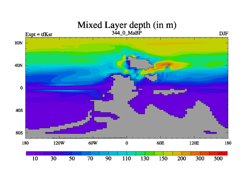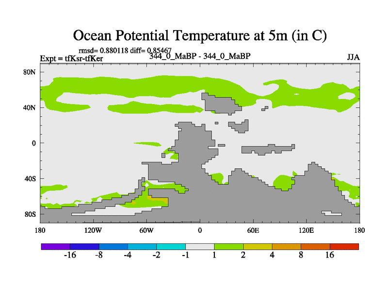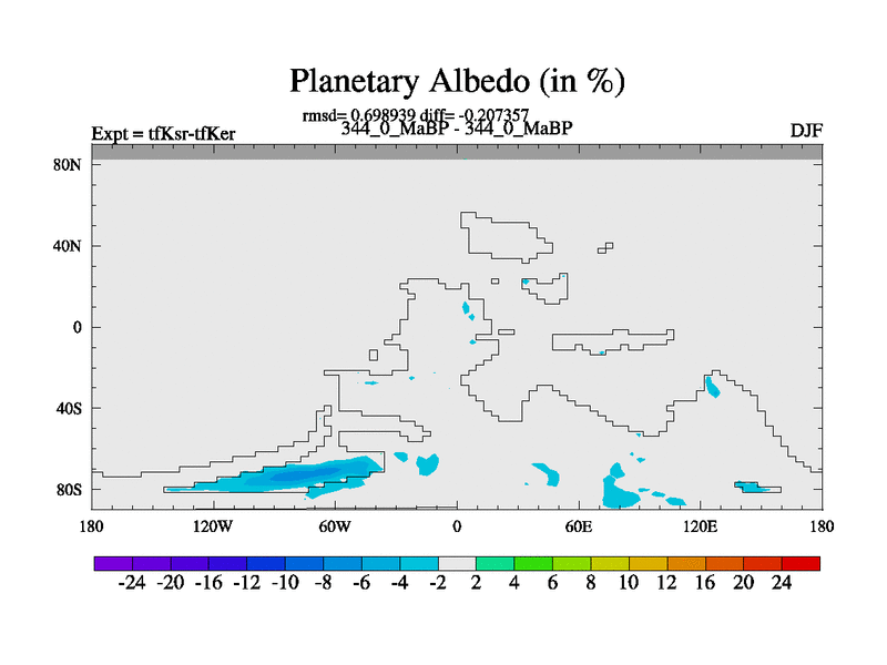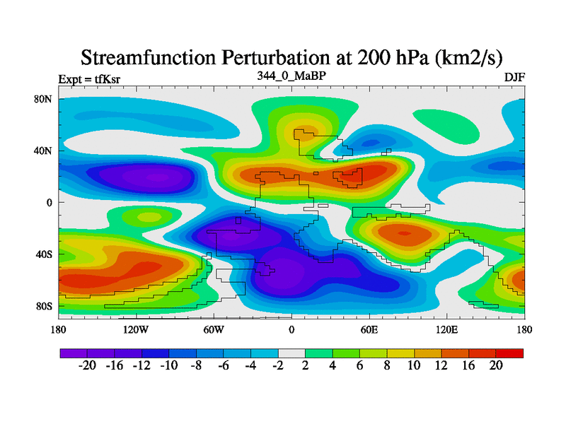 This is the 344.0 Ma simulation using the Scotese palaeogeographies and revised CCN etc. This version has islands and smoothing and desert albedo included. Tuned CO2 to give Scotese temperatures. Started from end of tfKer.