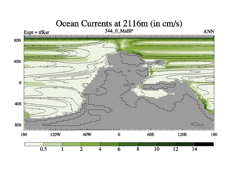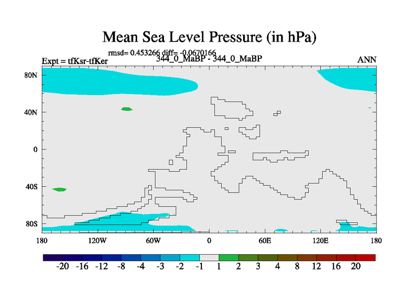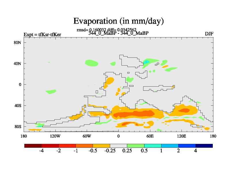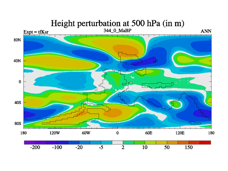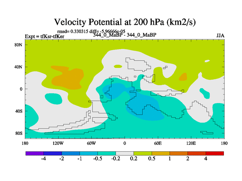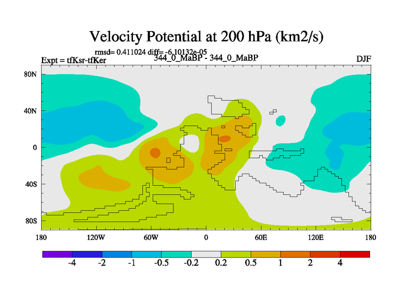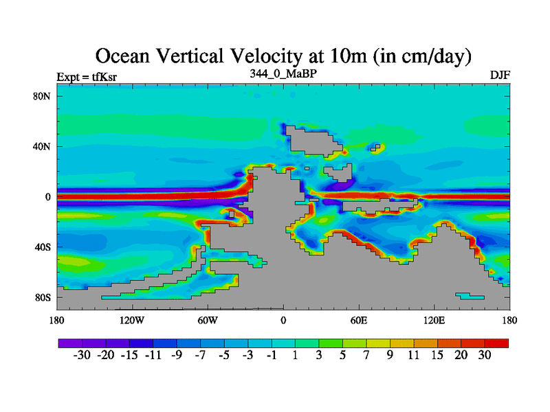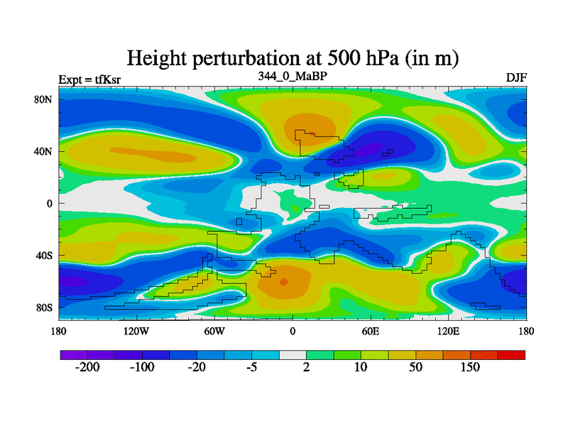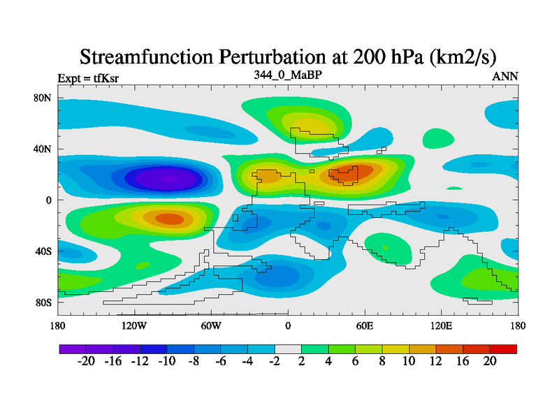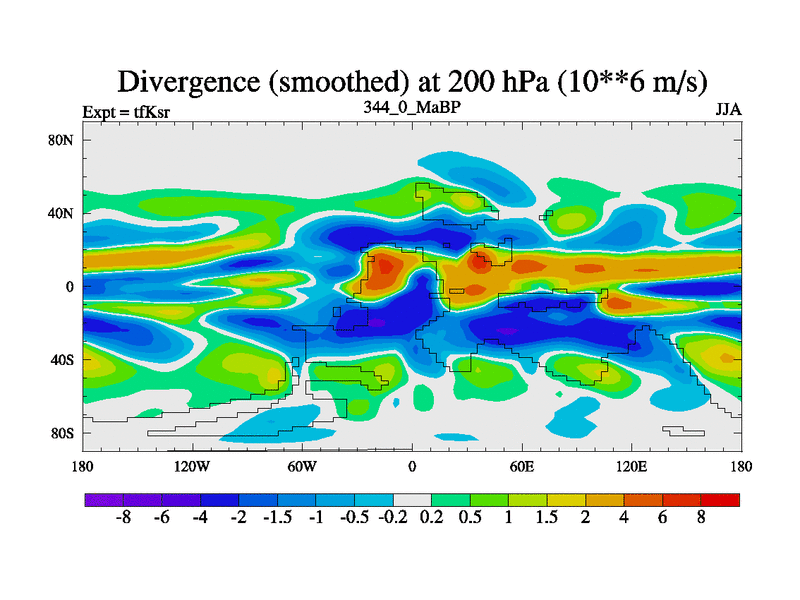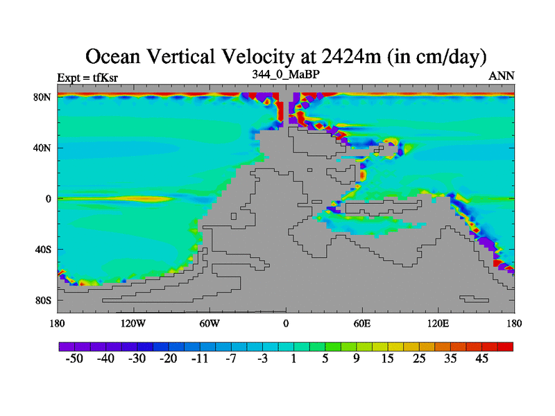 This is the 344.0 Ma simulation using the Scotese palaeogeographies and revised CCN etc. This version has islands and smoothing and desert albedo included. Tuned CO2 to give Scotese temperatures. Started from end of tfKer.