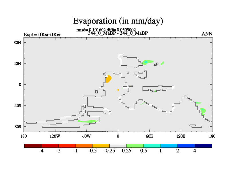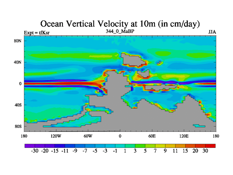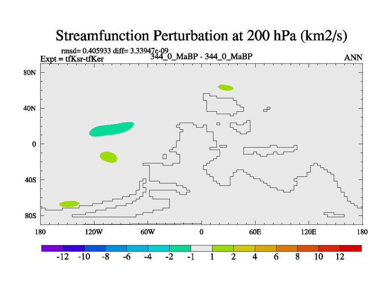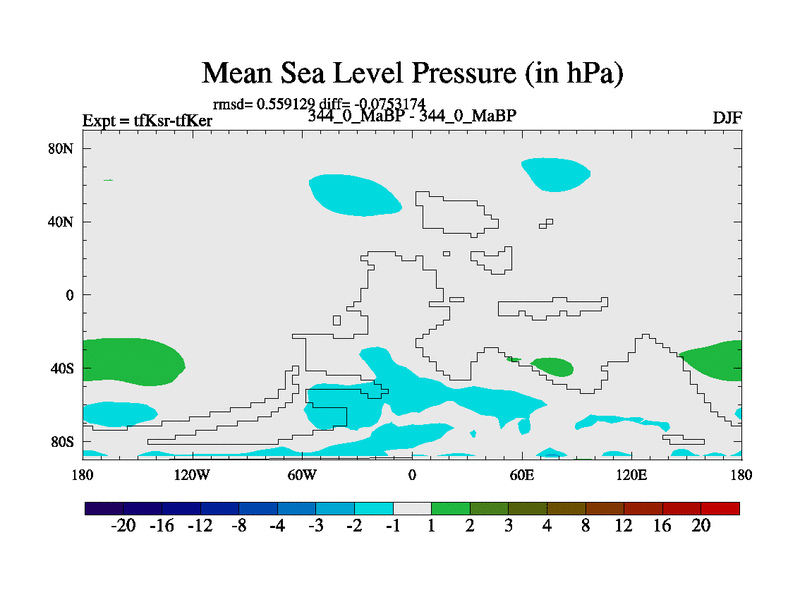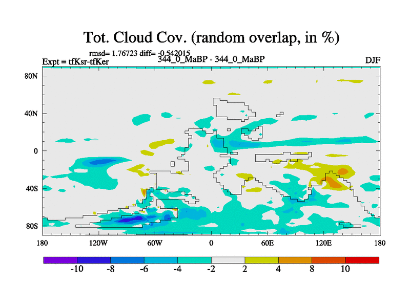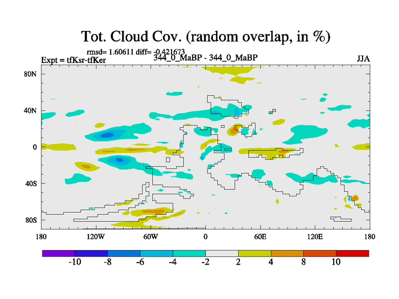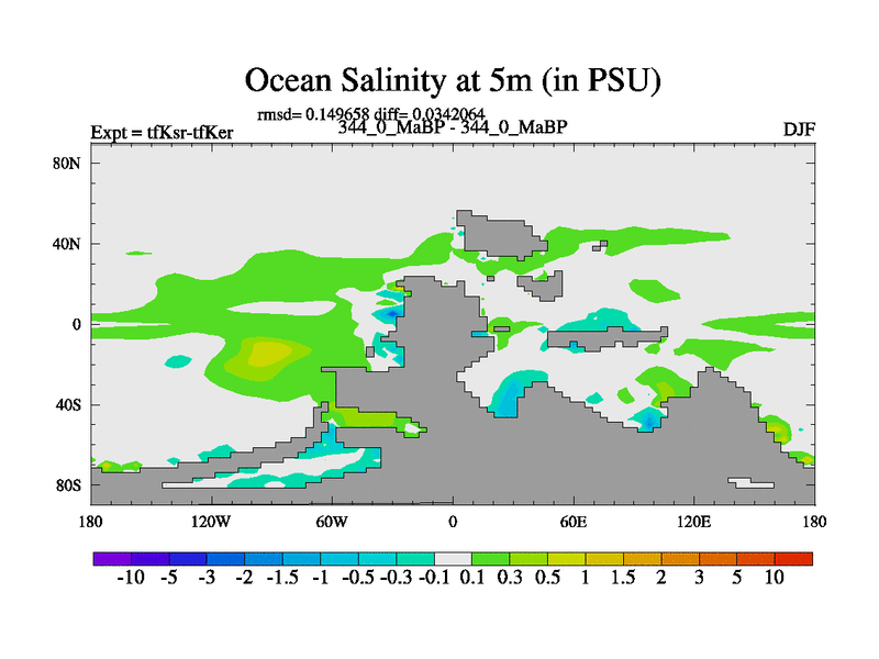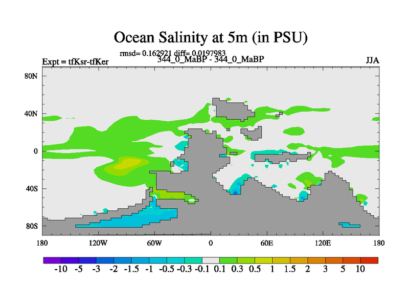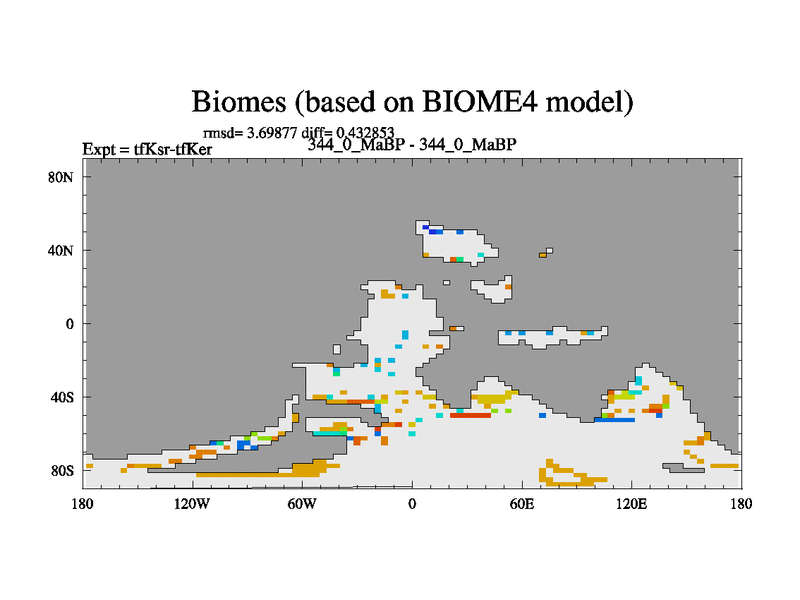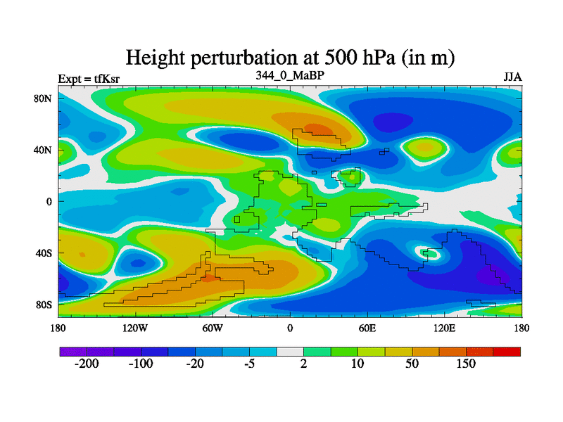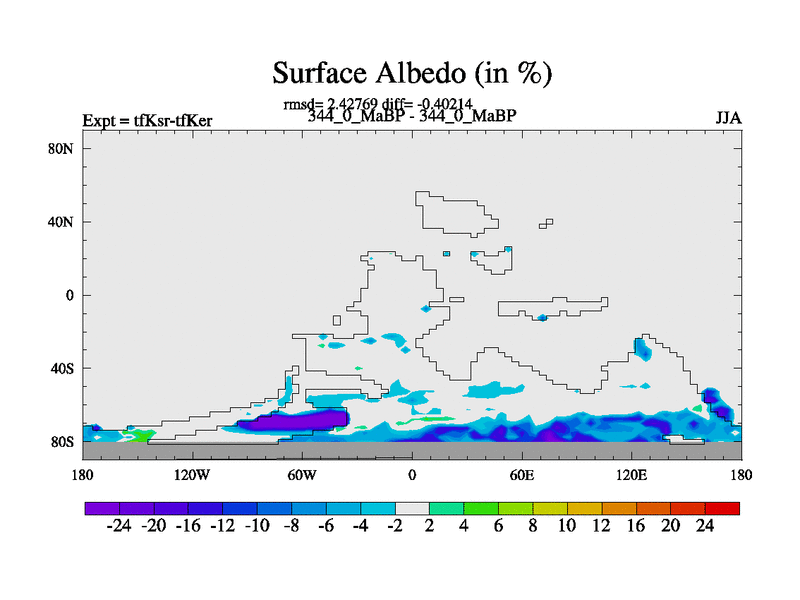 This is the 344.0 Ma simulation using the Scotese palaeogeographies and revised CCN etc. This version has islands and smoothing and desert albedo included. Tuned CO2 to give Scotese temperatures. Started from end of tfKer.