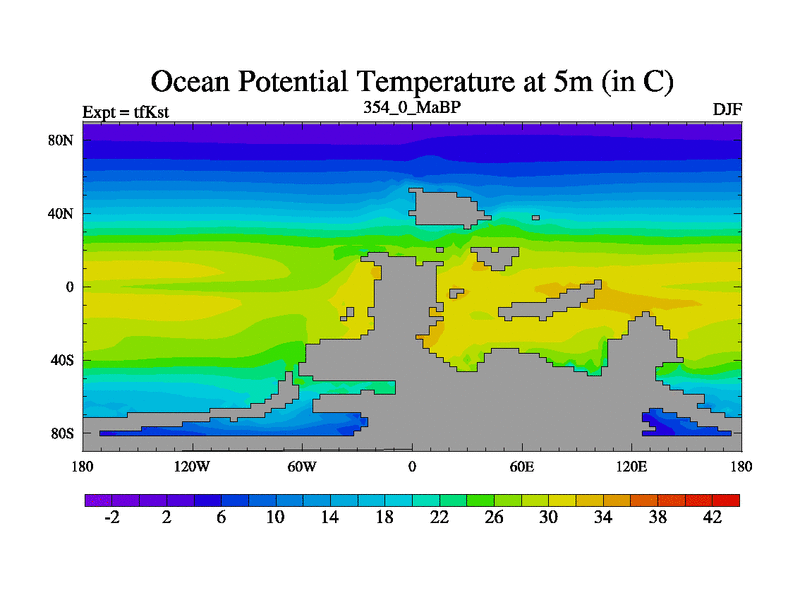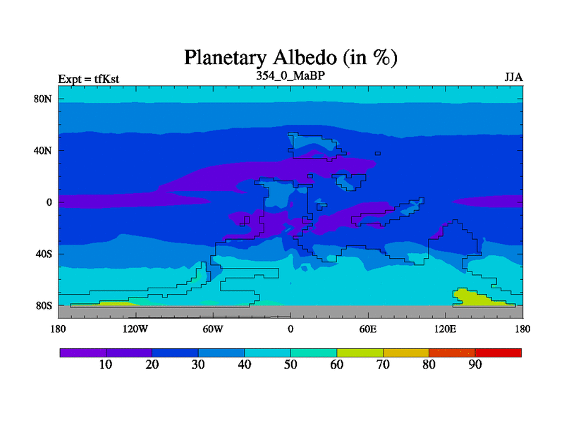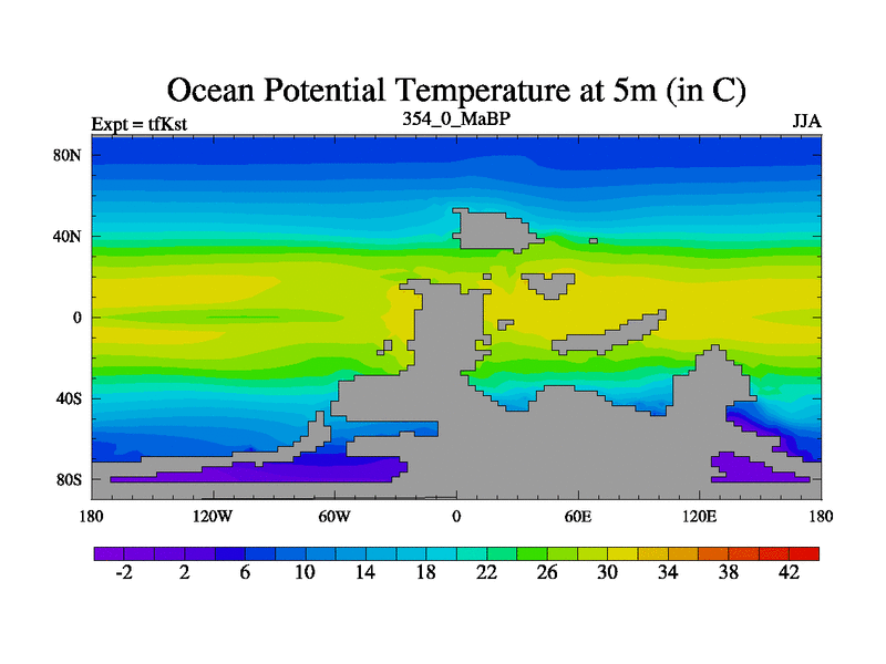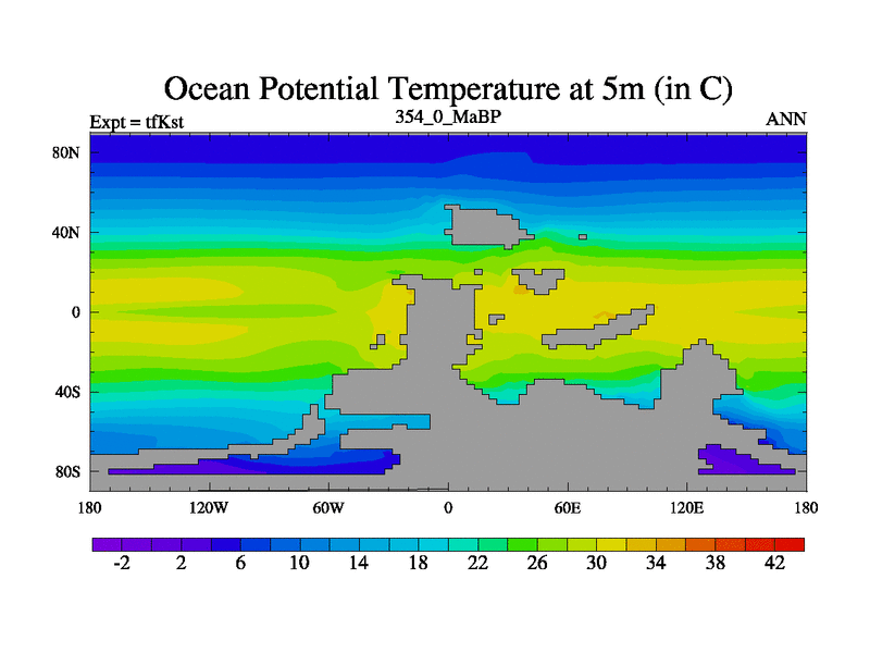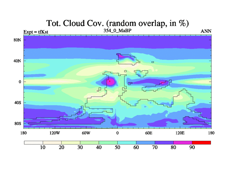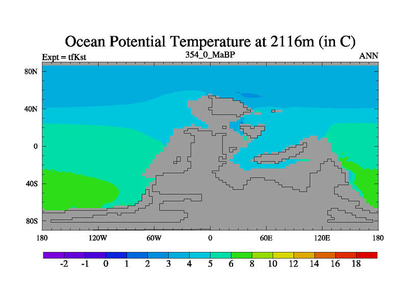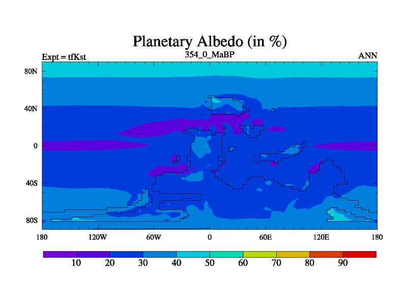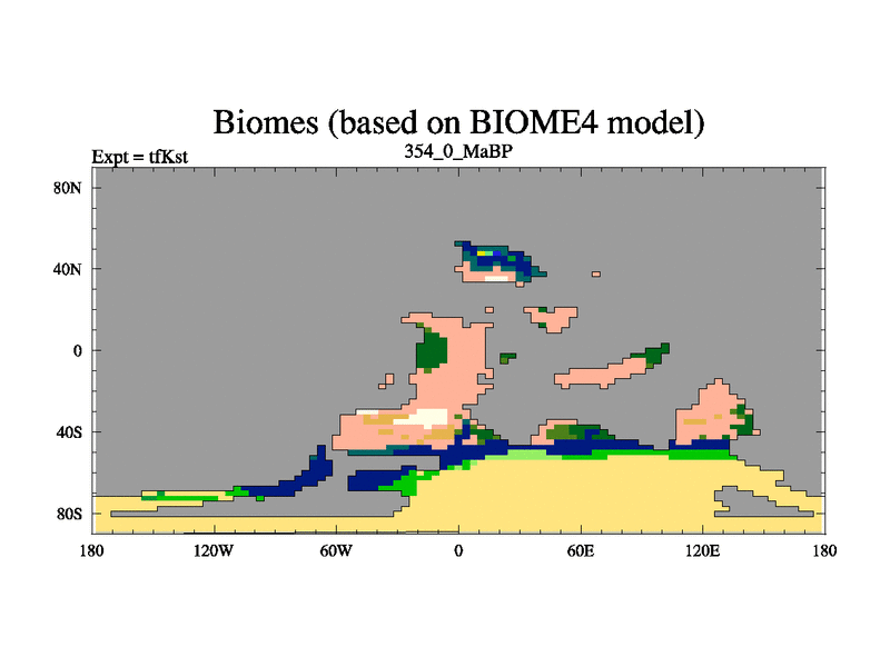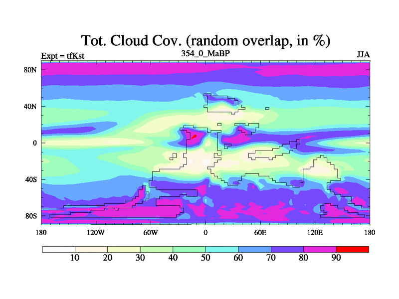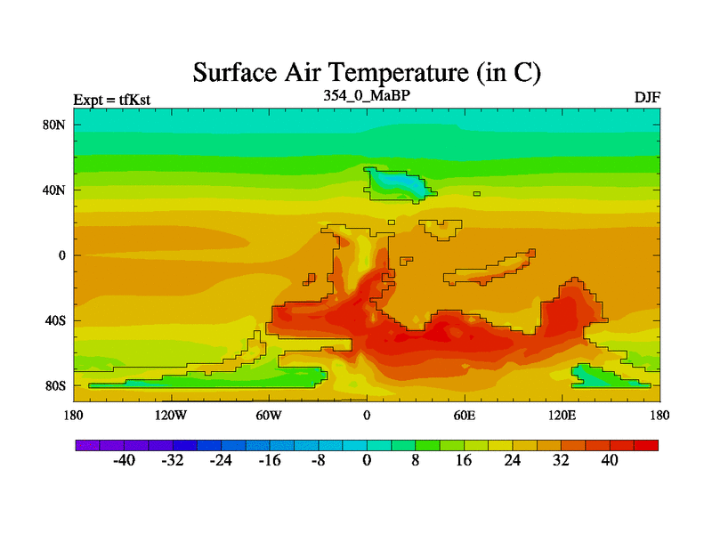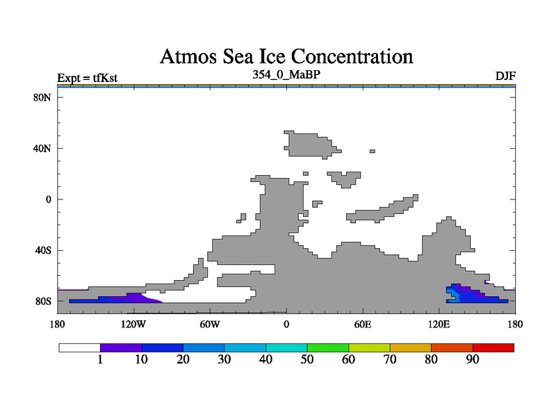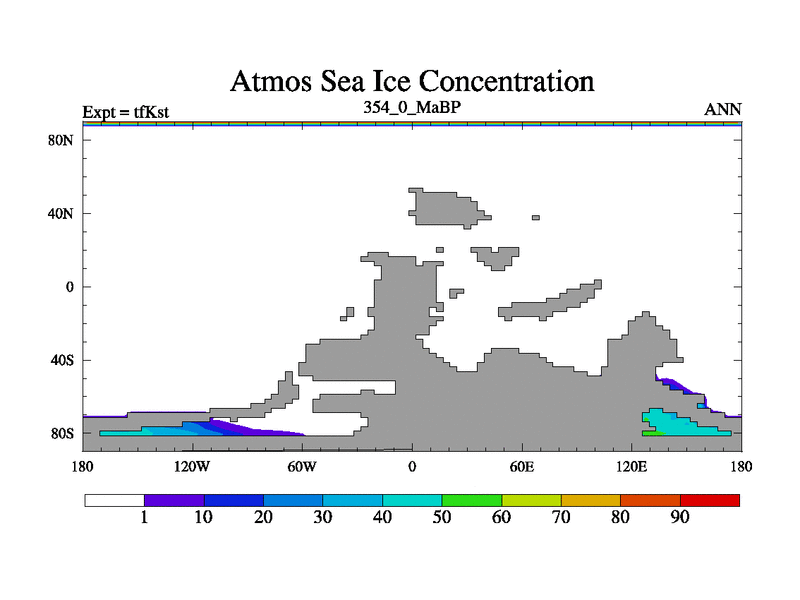 This is the 354.0 Ma simulation using the Scotese palaeogeographies and revised CCN etc. This version has islands and smoothing and desert albedo included. Tuned CO2 to give Scotese temperatures. Started from end of tfKet.