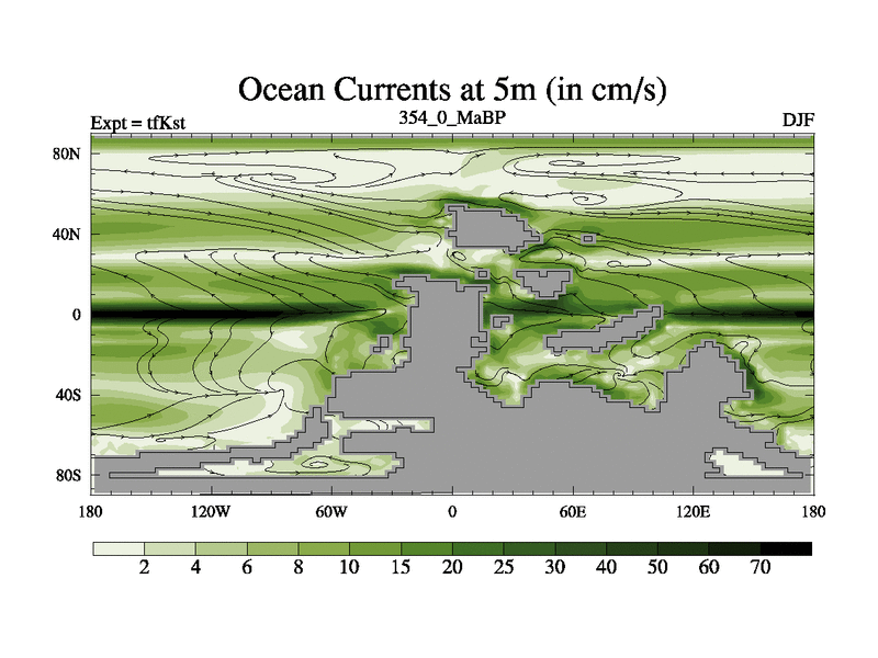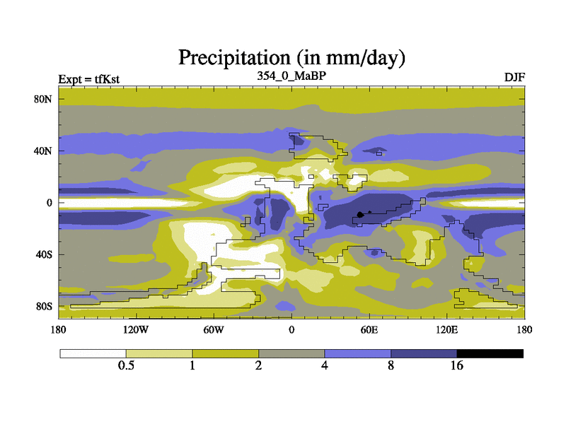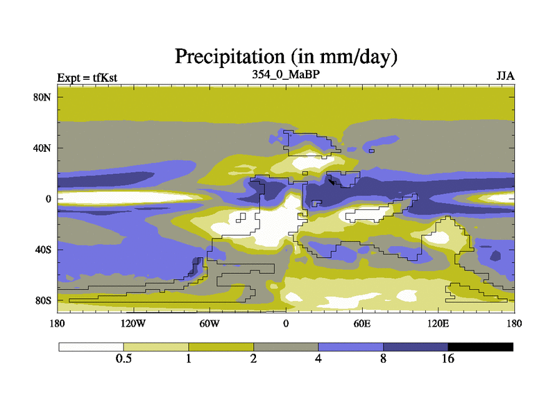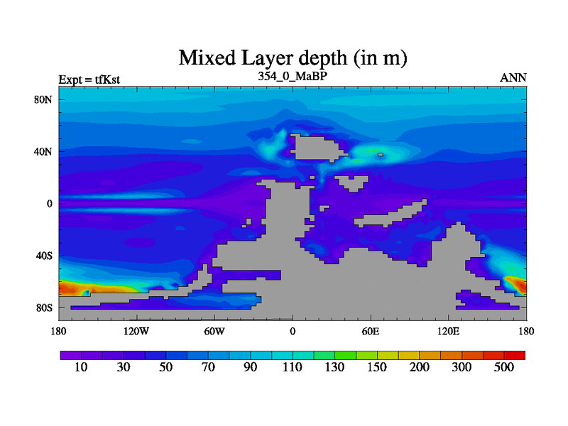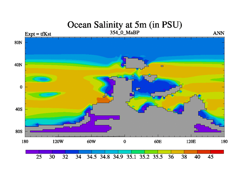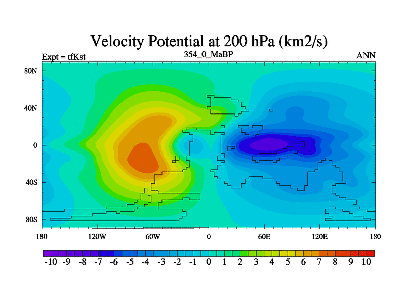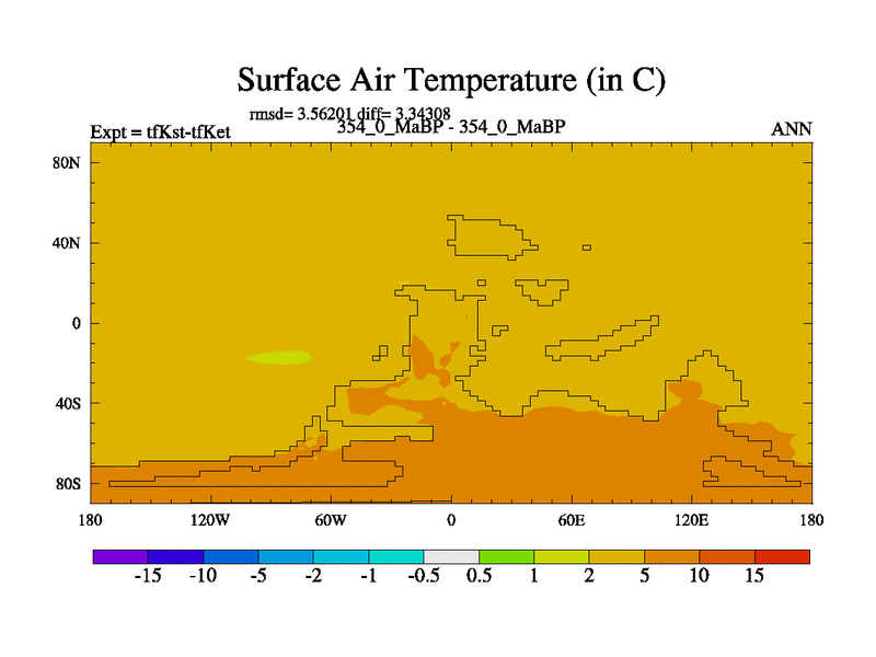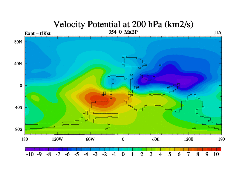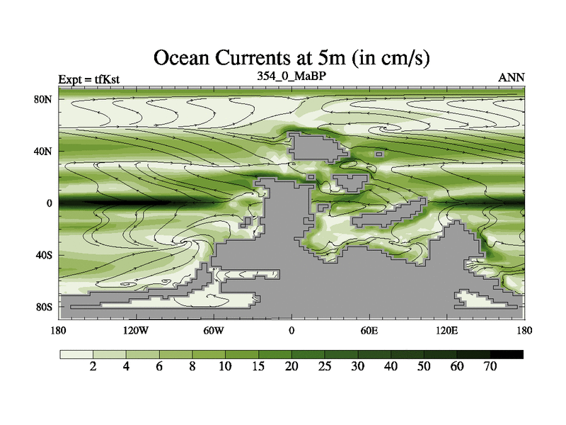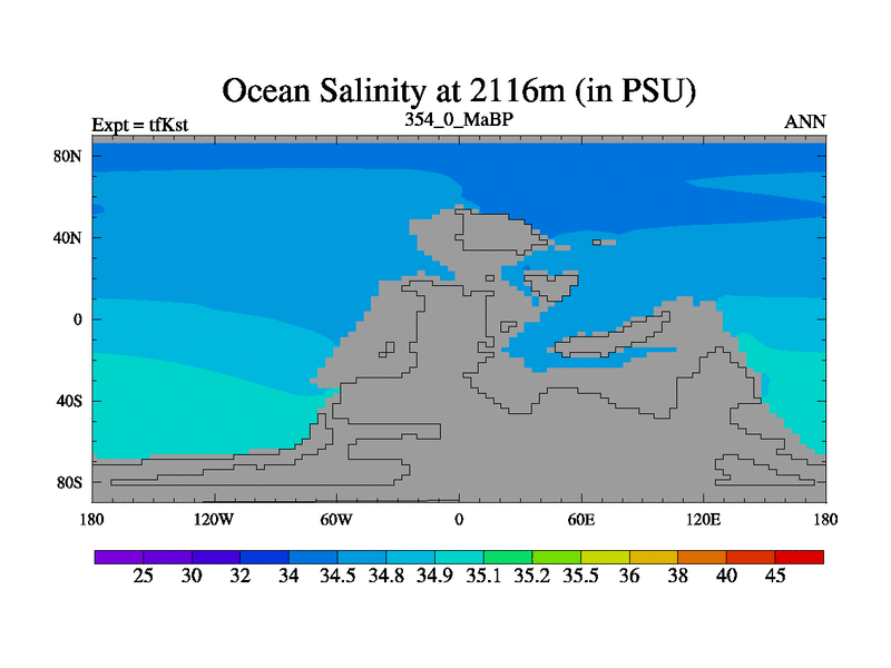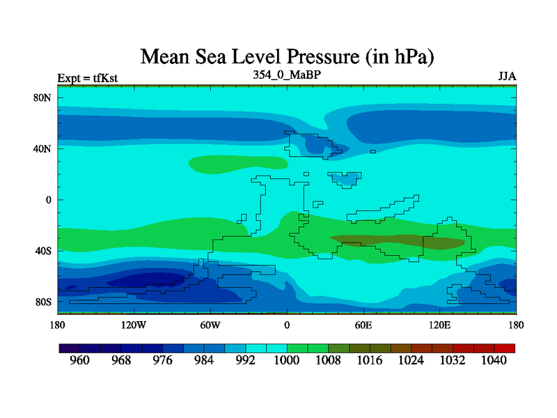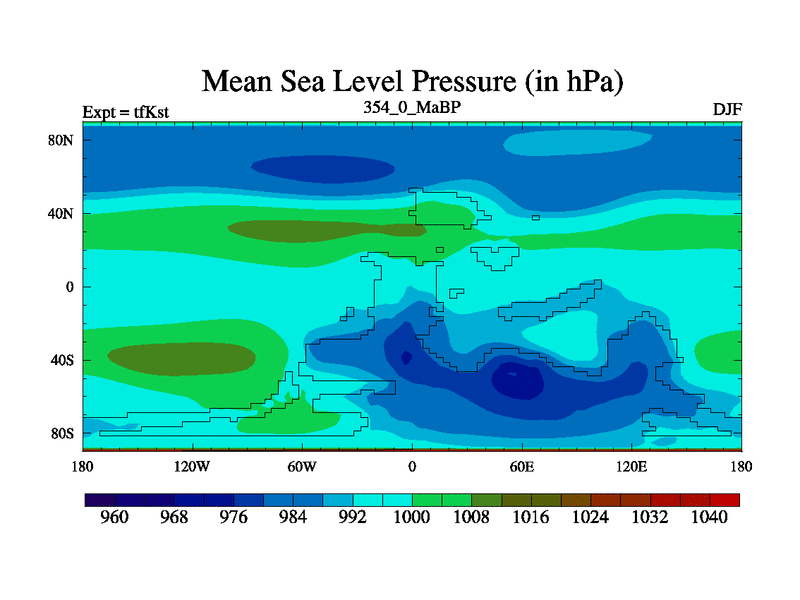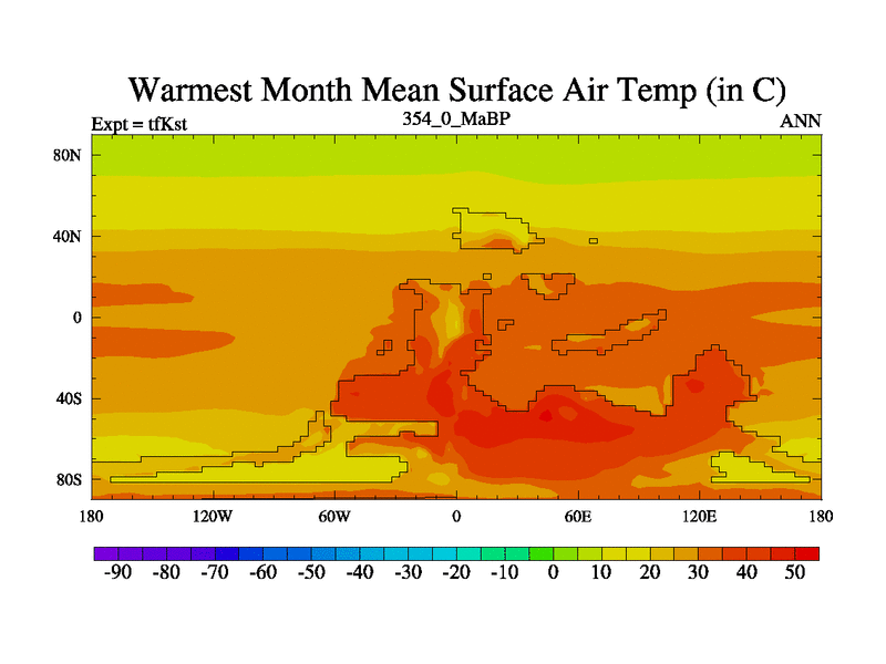 This is the 354.0 Ma simulation using the Scotese palaeogeographies and revised CCN etc. This version has islands and smoothing and desert albedo included. Tuned CO2 to give Scotese temperatures. Started from end of tfKet.