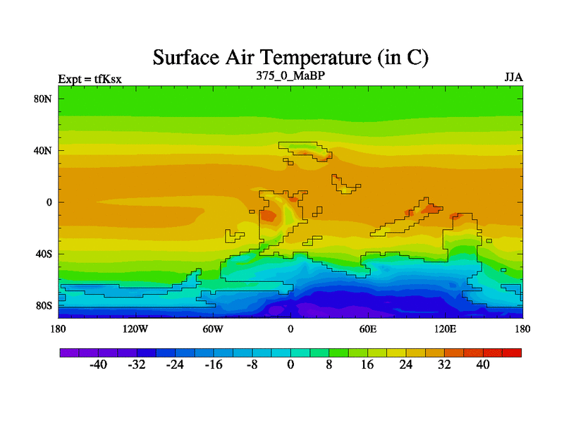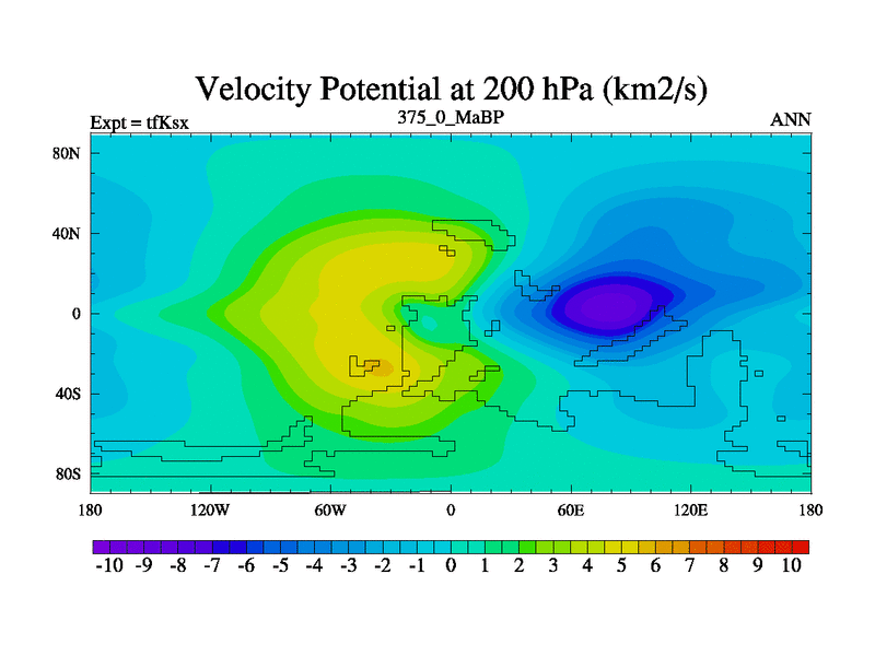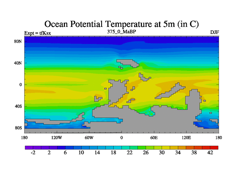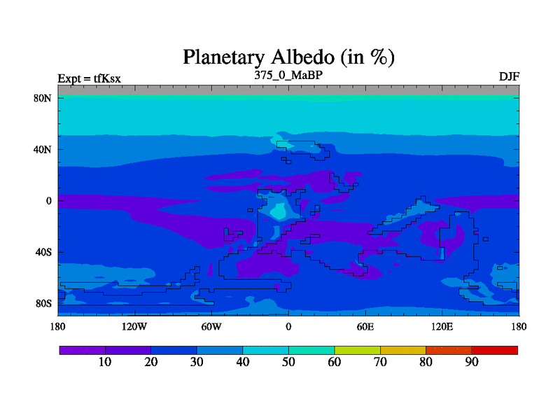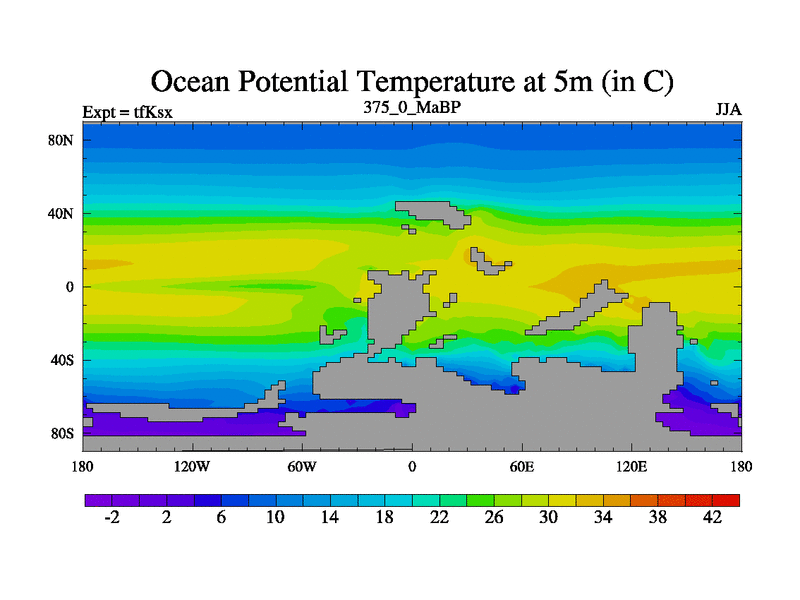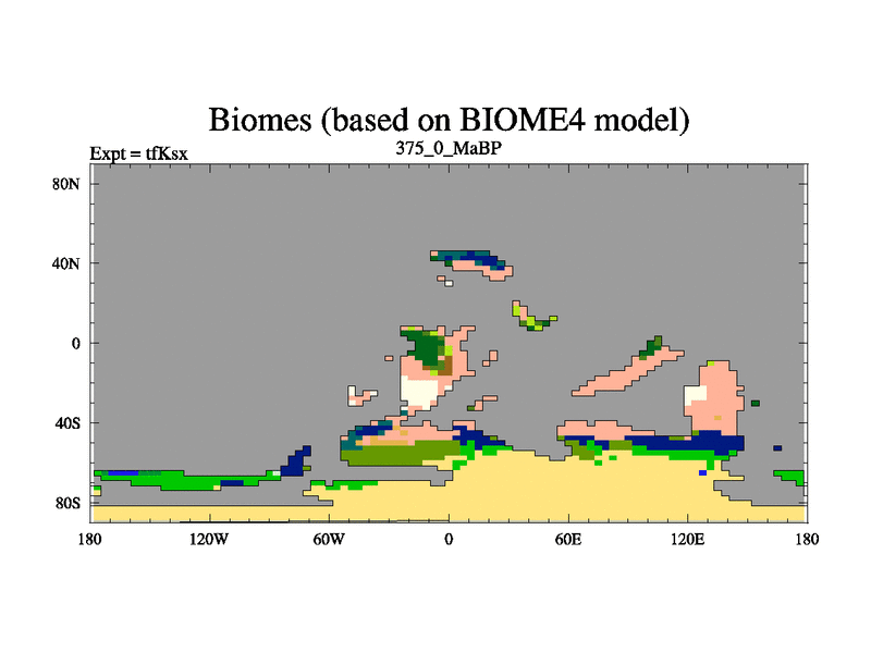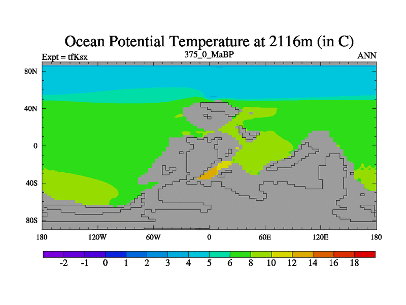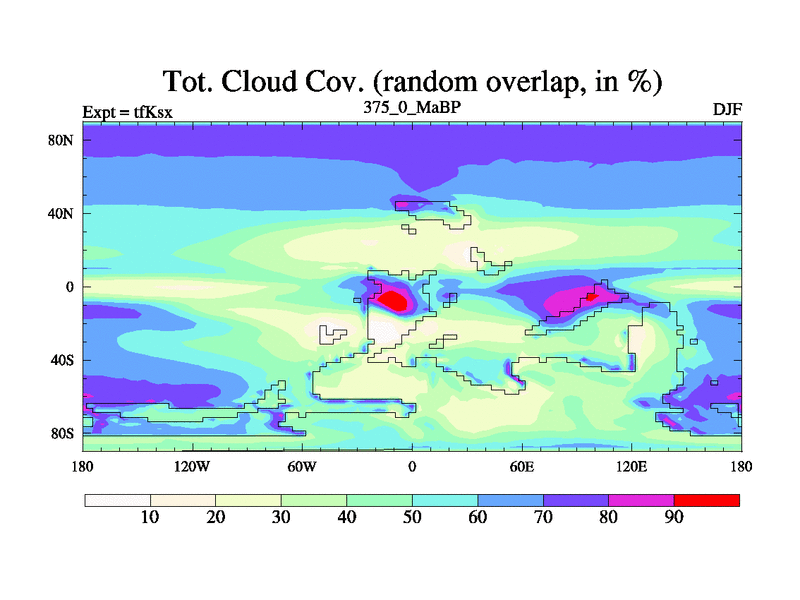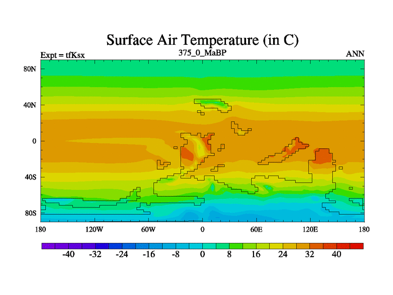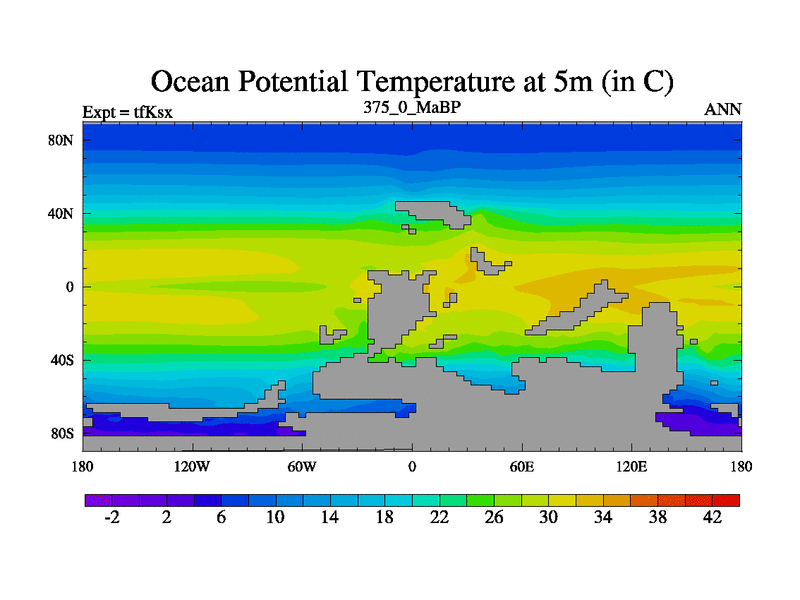 This is the 375.0 Ma simulation using the Scotese palaeogeographies and revised CCN etc. This version has islands and smoothing and desert albedo included. Tuned CO2 to give Scotese temperatures. Started from end of tfKex.