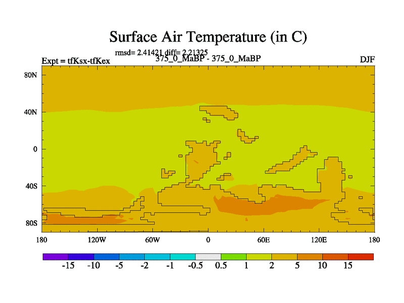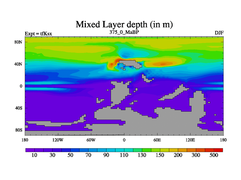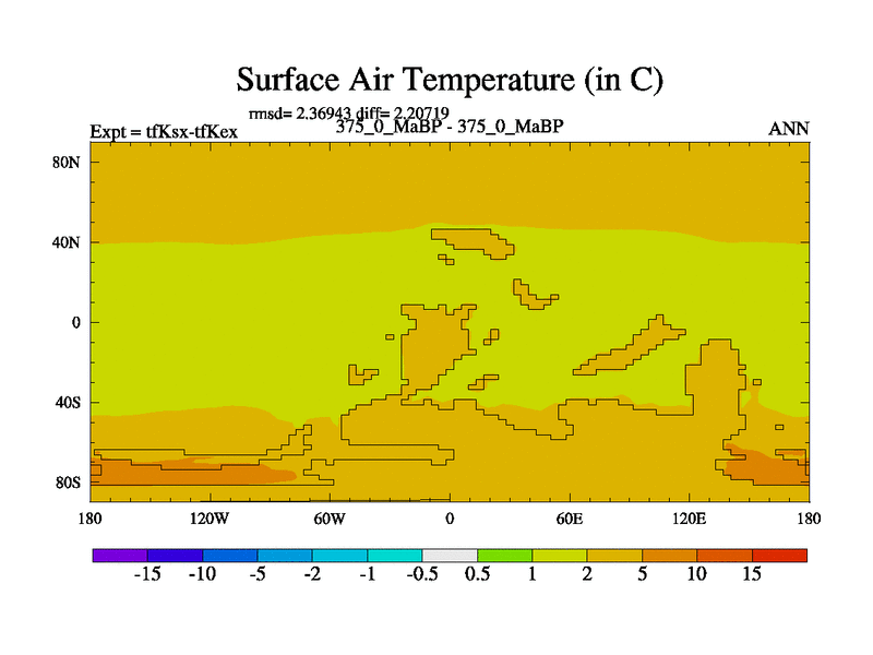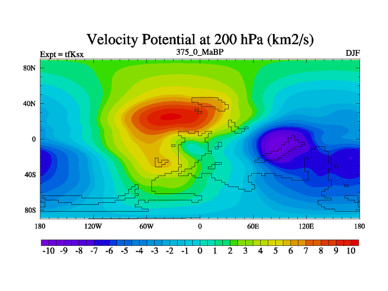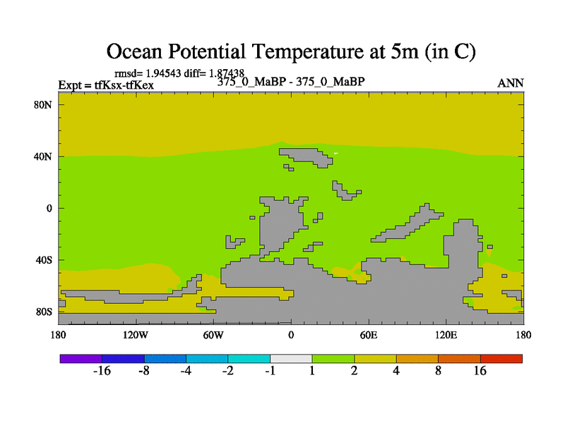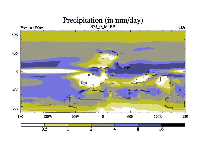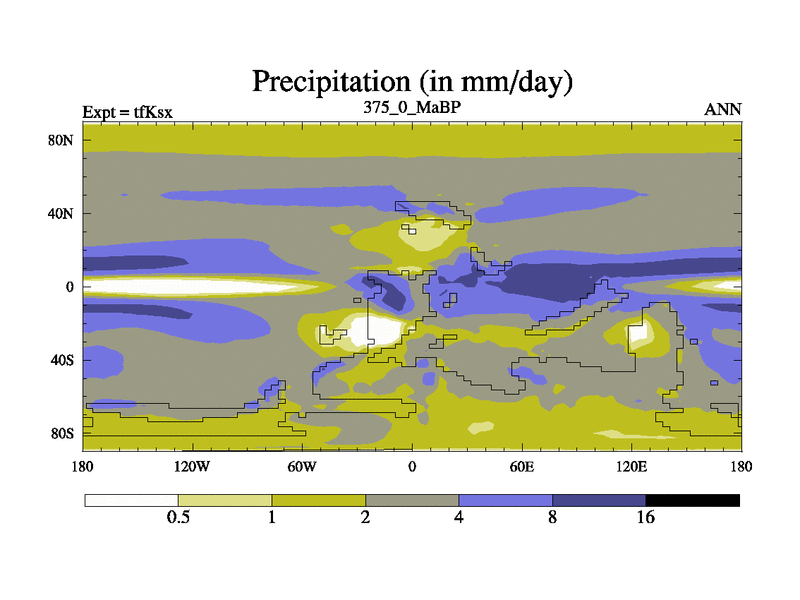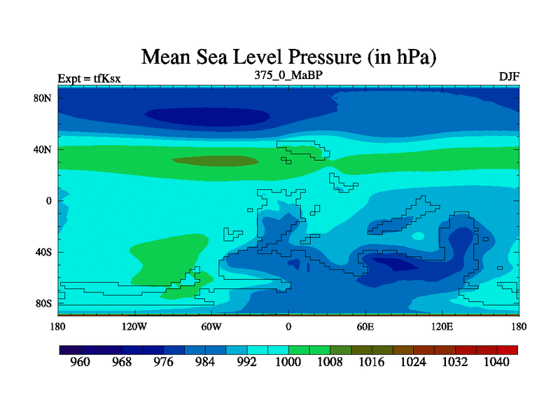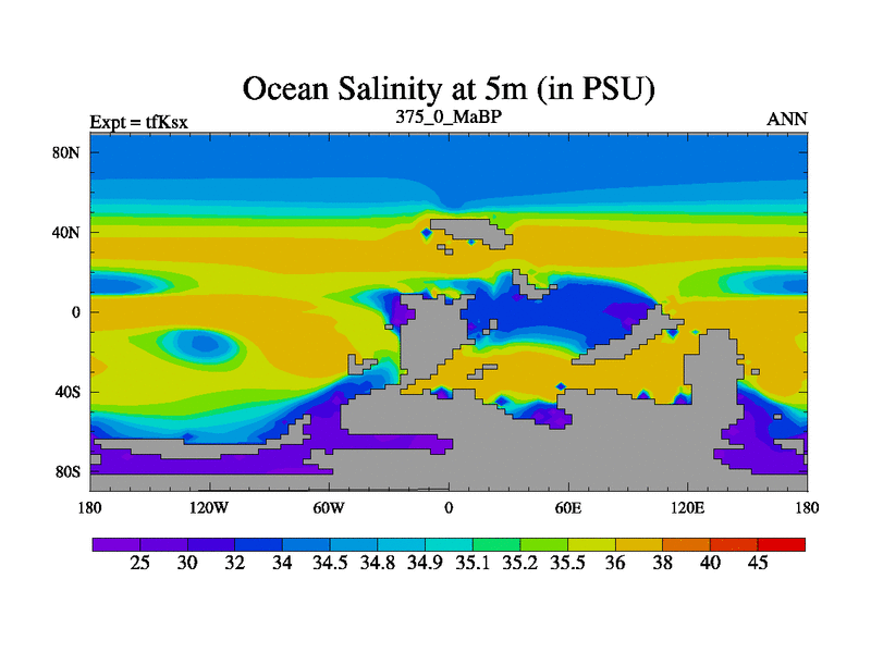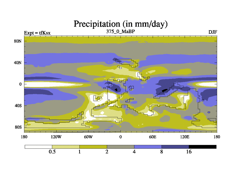 This is the 375.0 Ma simulation using the Scotese palaeogeographies and revised CCN etc. This version has islands and smoothing and desert albedo included. Tuned CO2 to give Scotese temperatures. Started from end of tfKex.
