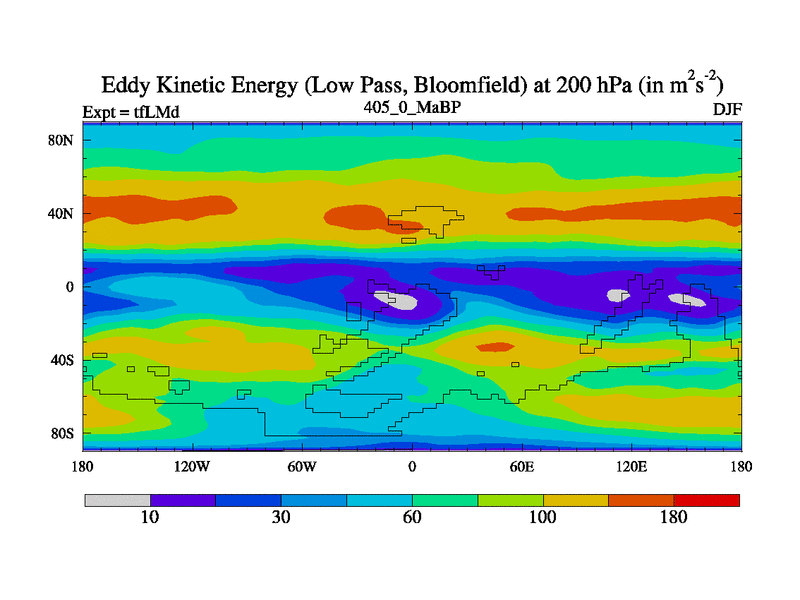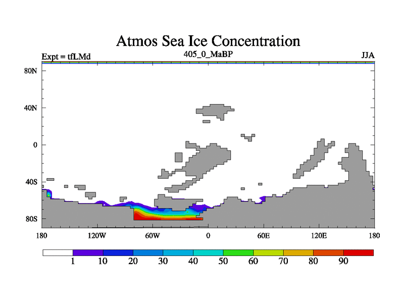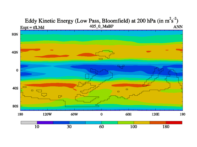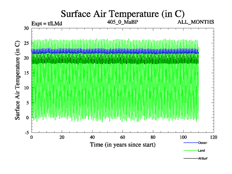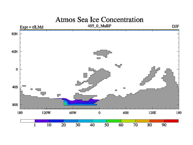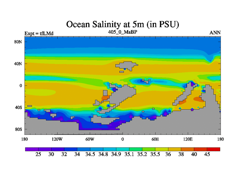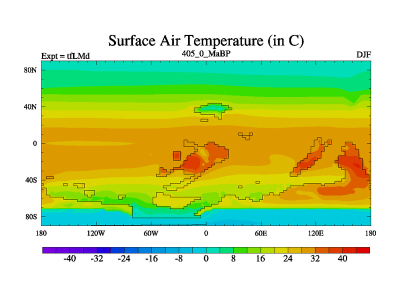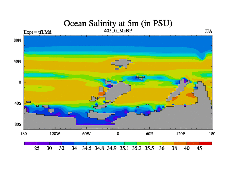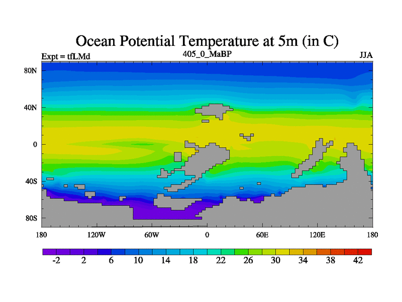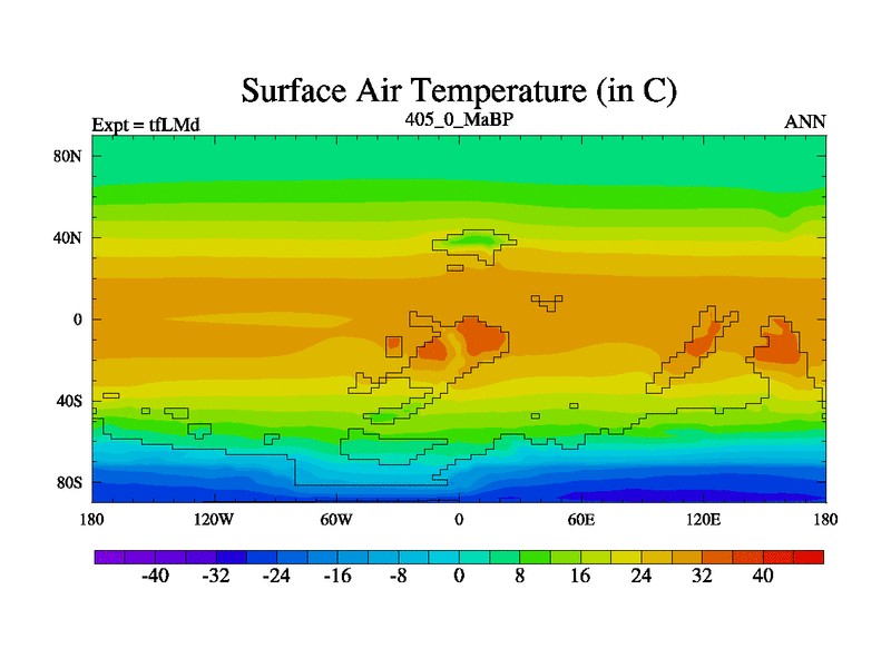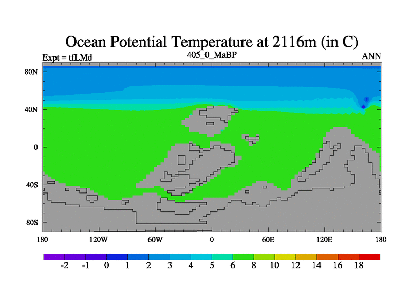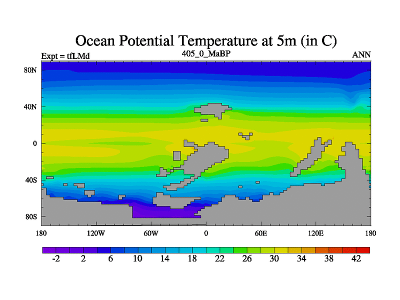 This is the 405.0 Ma simulation using the Scotese palaeogeographies and revised CCN etc. This version has islands and smoothing and desert albedo included. Tuned CO2 to give Scotese temperatures. Started from end of tfKSd. With JEDI output.