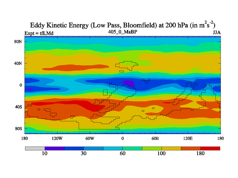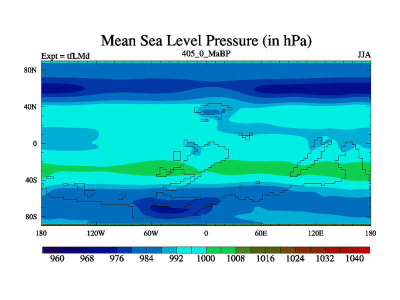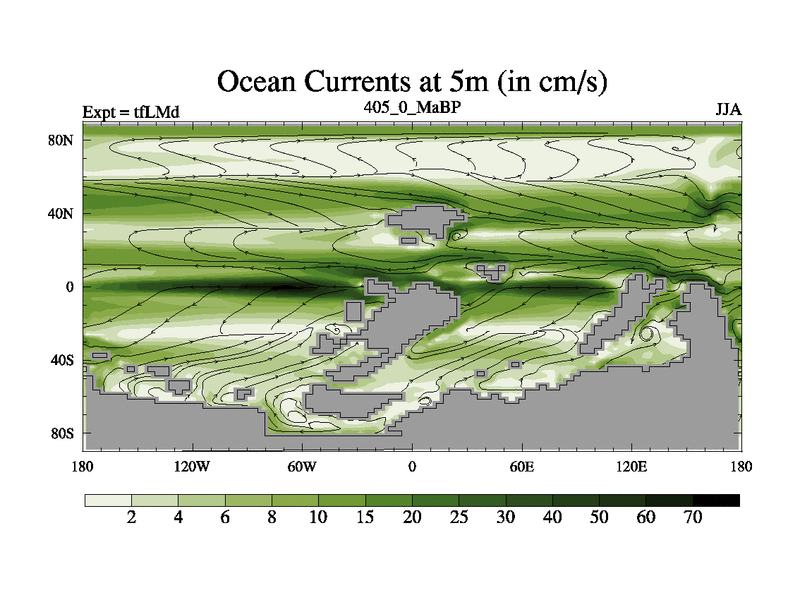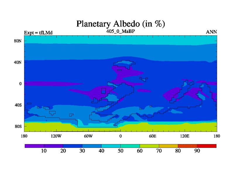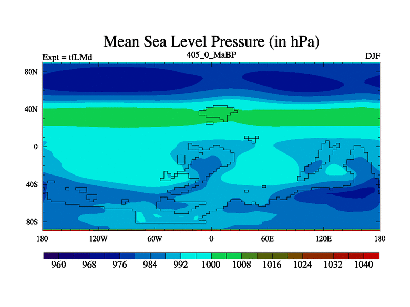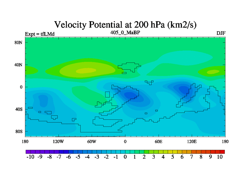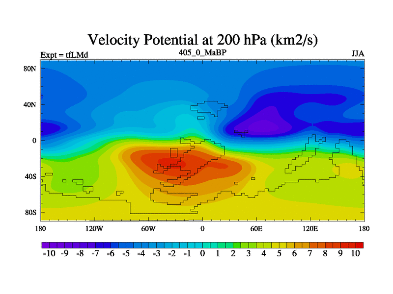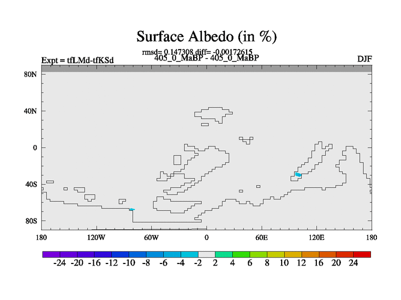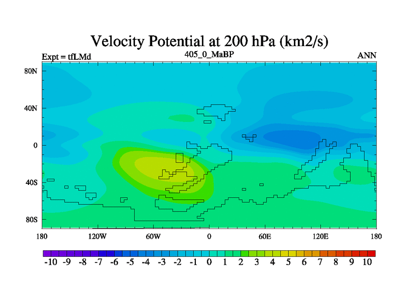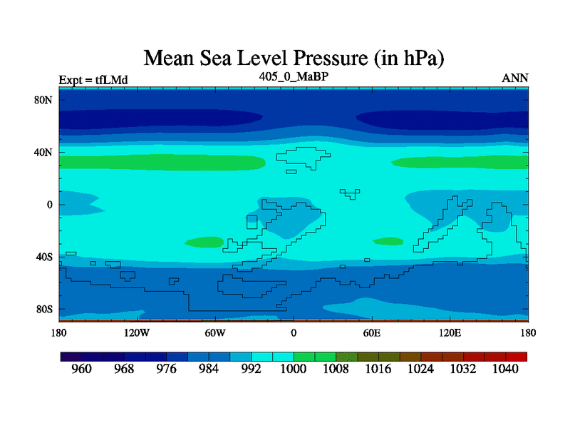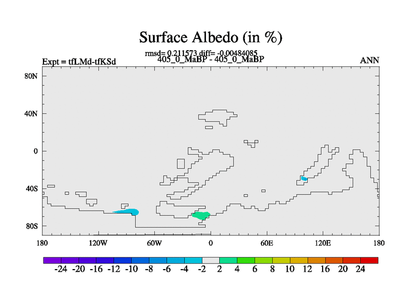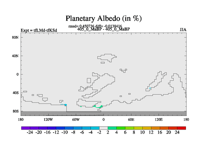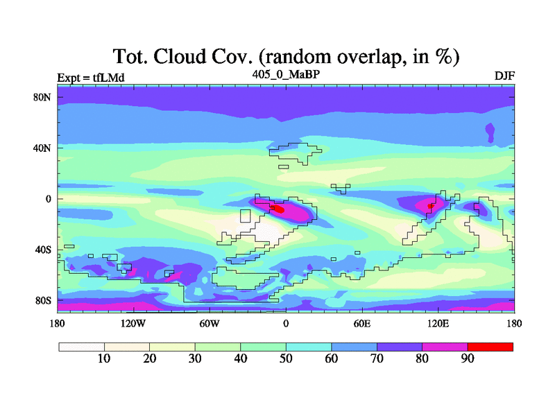This is the 405.0 Ma simulation using the Scotese palaeogeographies and revised CCN etc. This version has islands and smoothing and desert albedo included. Tuned CO2 to give Scotese temperatures. Started from end of tfKSd. With JEDI output.
