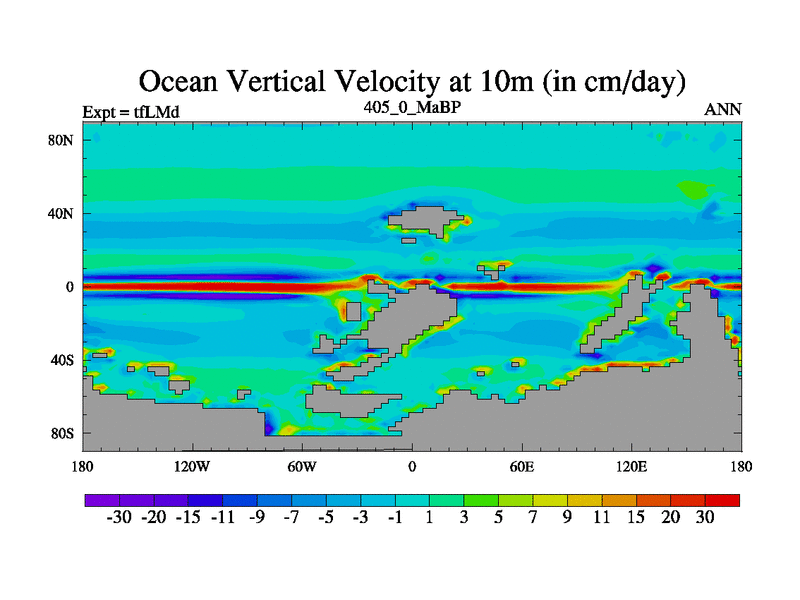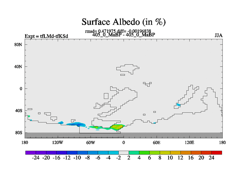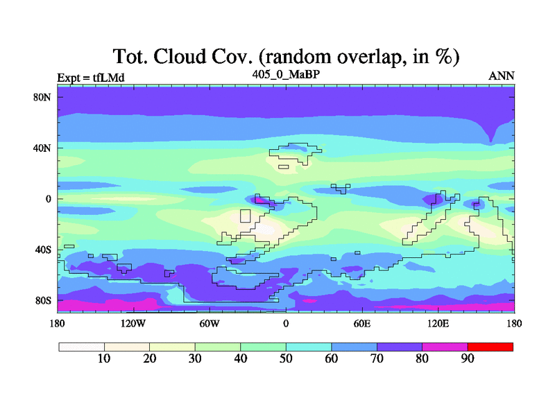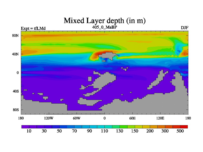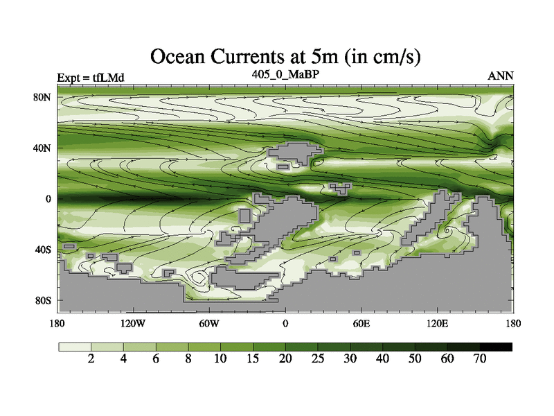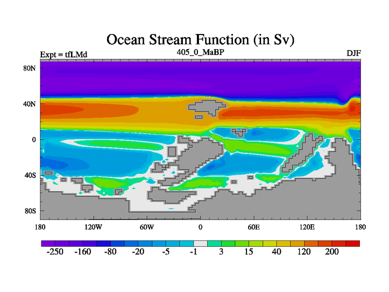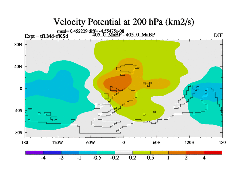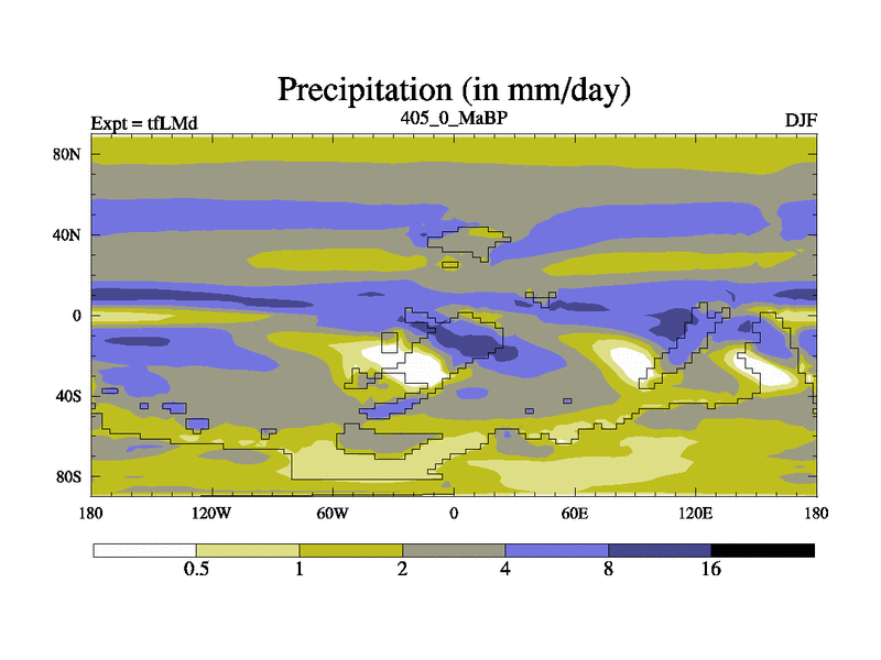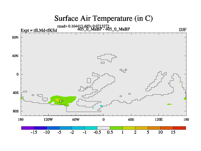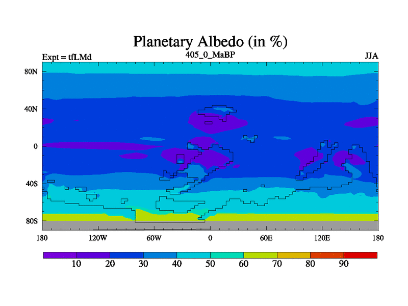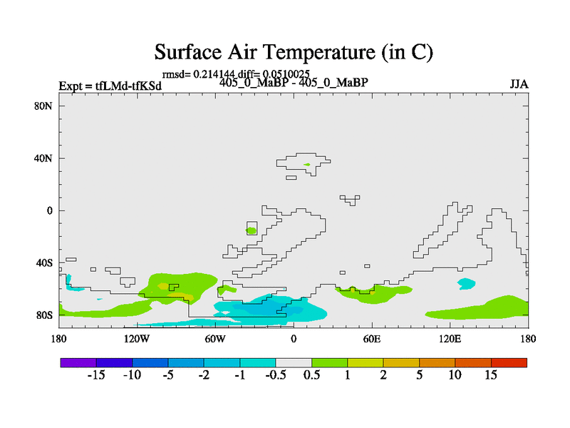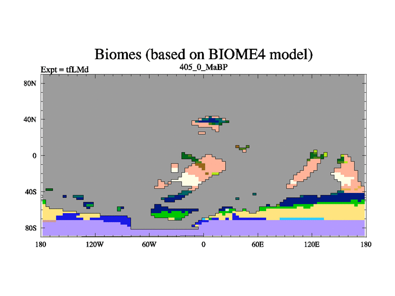 This is the 405.0 Ma simulation using the Scotese palaeogeographies and revised CCN etc. This version has islands and smoothing and desert albedo included. Tuned CO2 to give Scotese temperatures. Started from end of tfKSd. With JEDI output.