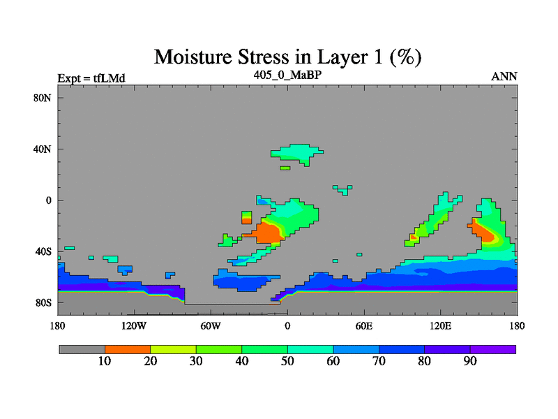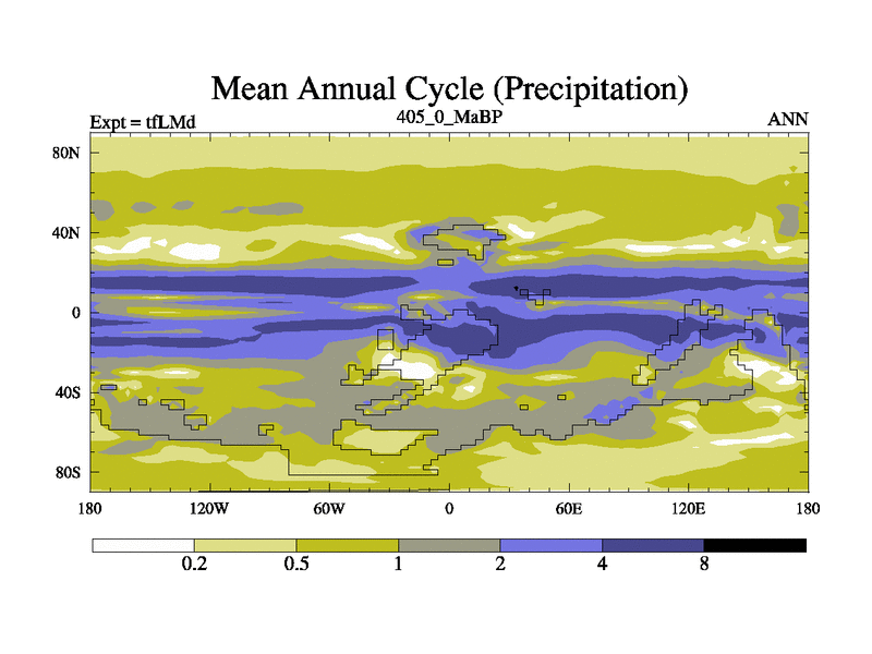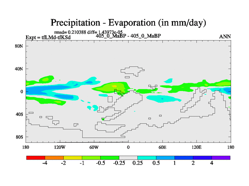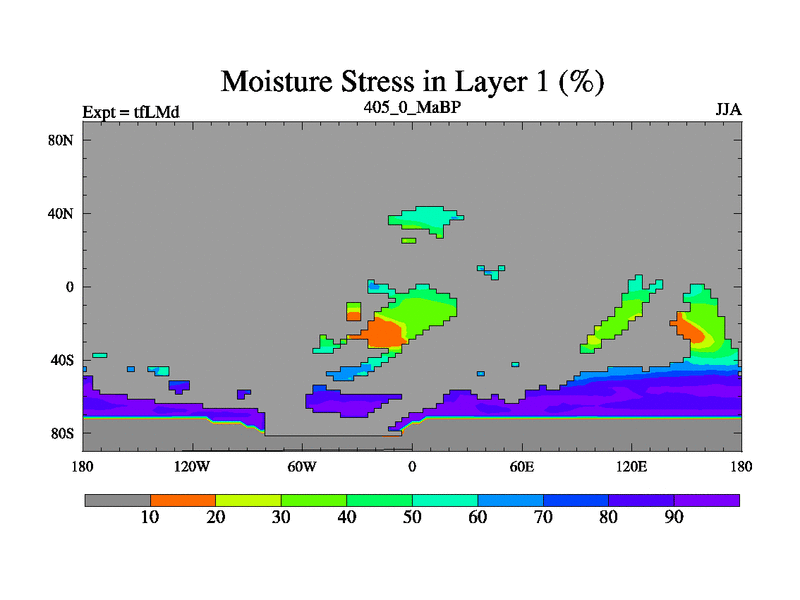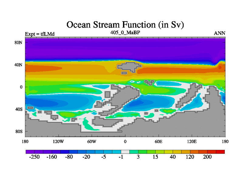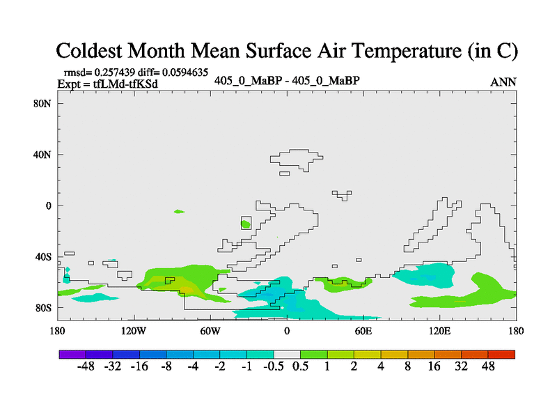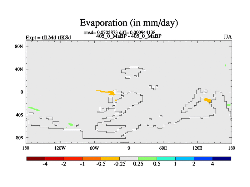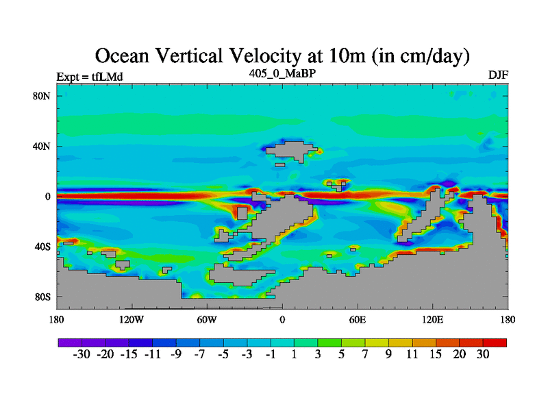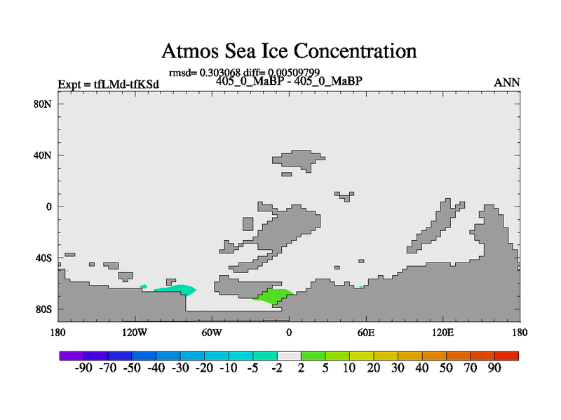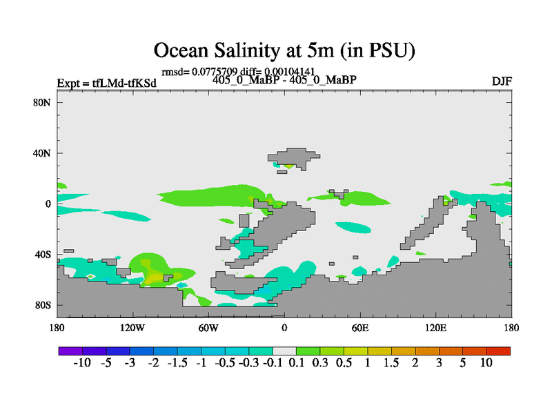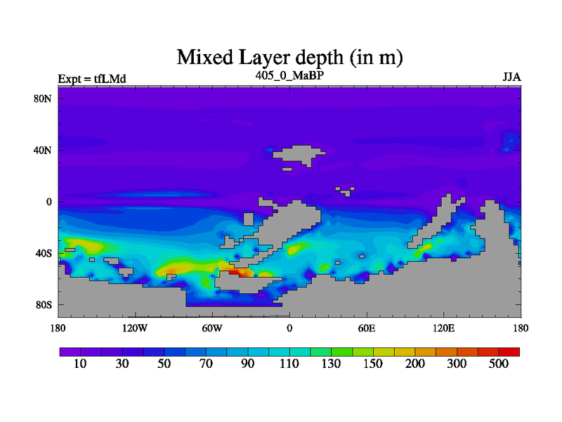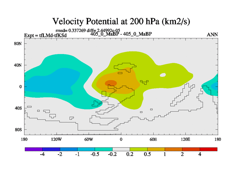 This is the 405.0 Ma simulation using the Scotese palaeogeographies and revised CCN etc. This version has islands and smoothing and desert albedo included. Tuned CO2 to give Scotese temperatures. Started from end of tfKSd. With JEDI output.