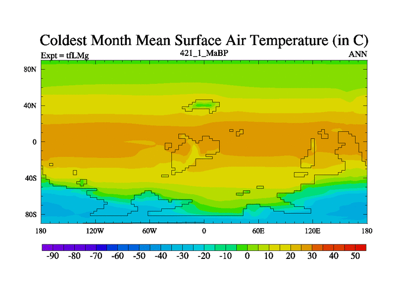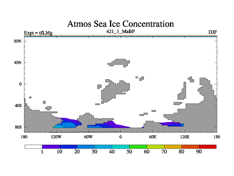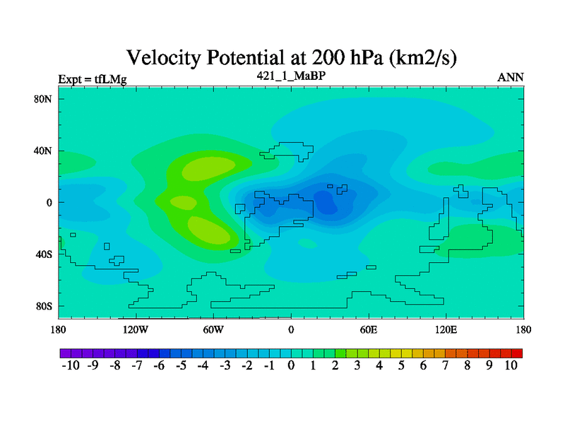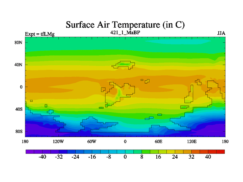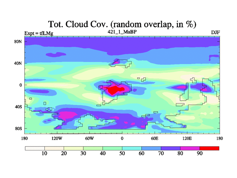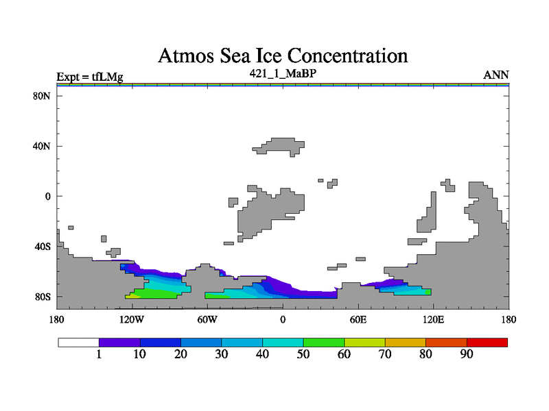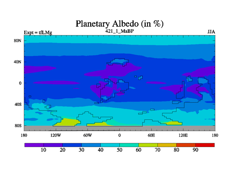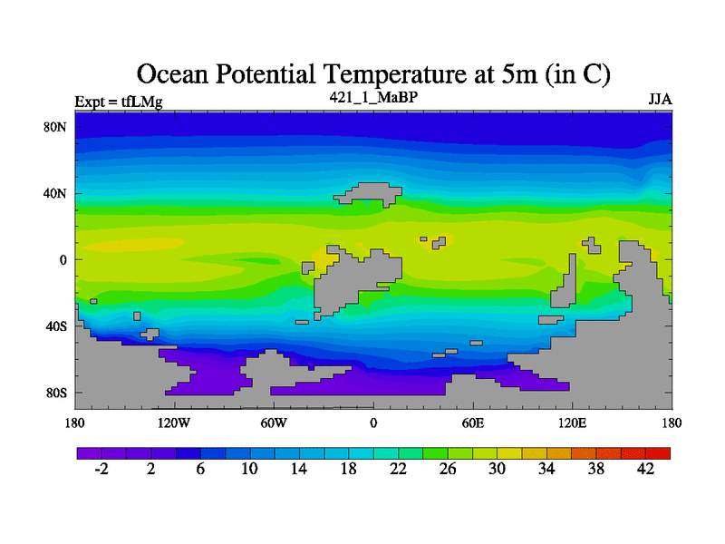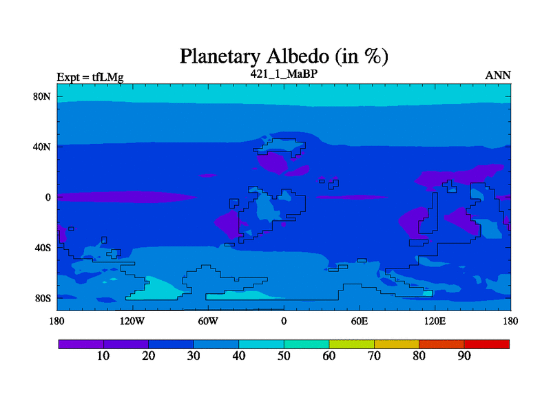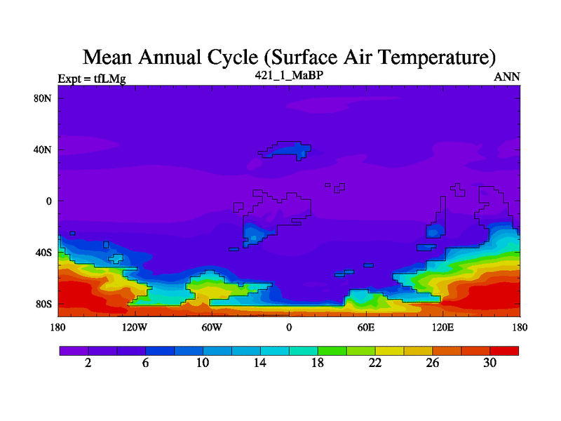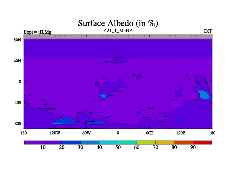 This is the 421.1 Ma simulation using the Scotese palaeogeographies and revised CCN etc. This version has islands and smoothing and desert albedo included. Tuned CO2 to give Scotese temperatures. Started from end of tfKSg. With JEDI output.
