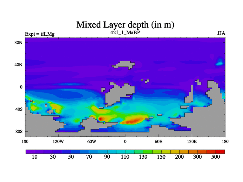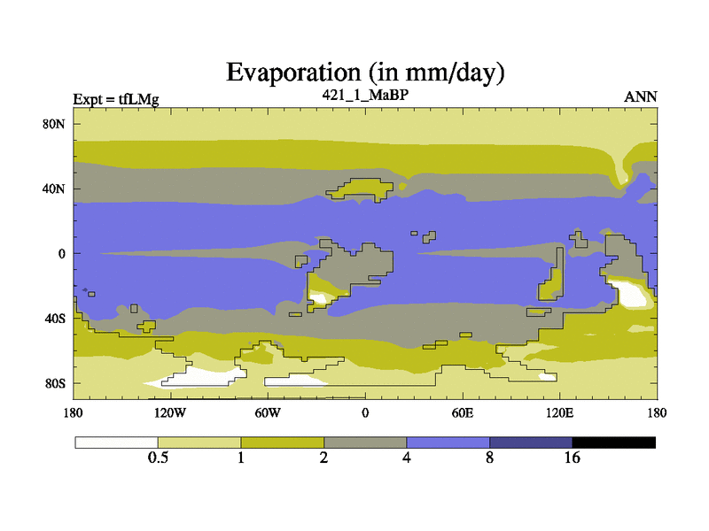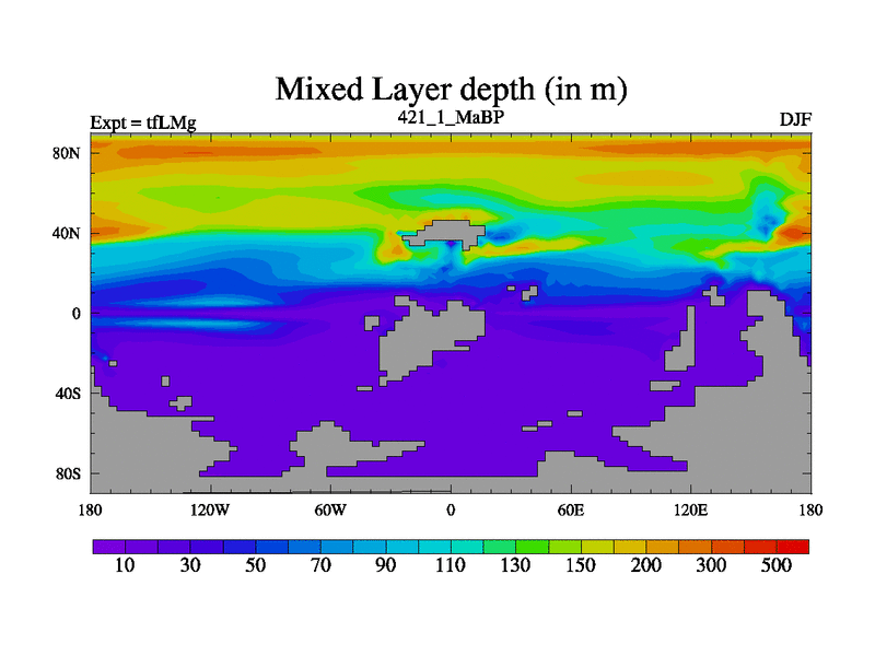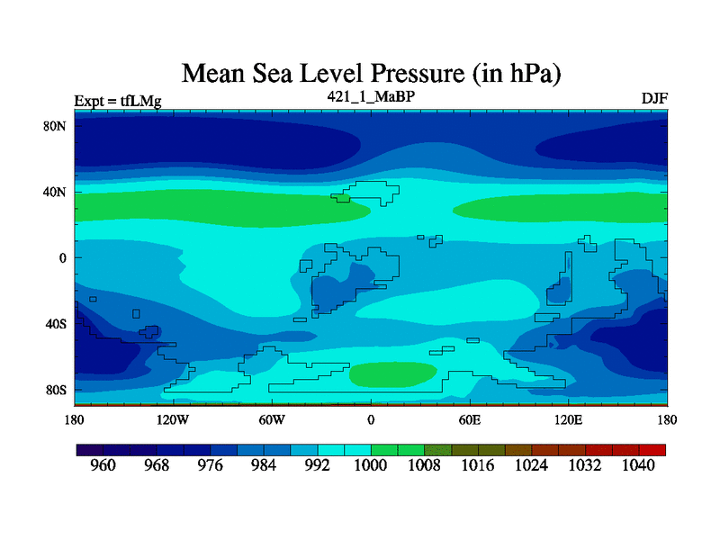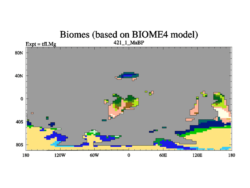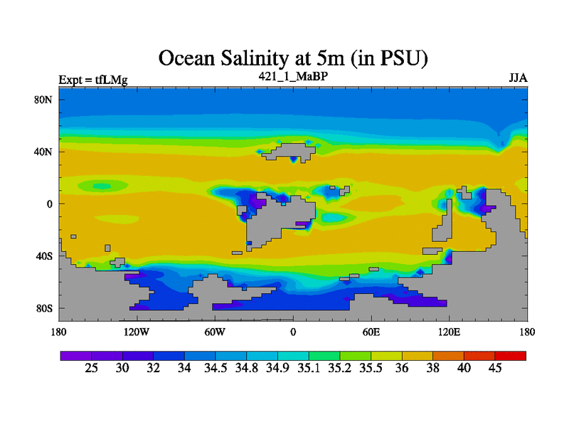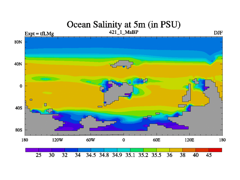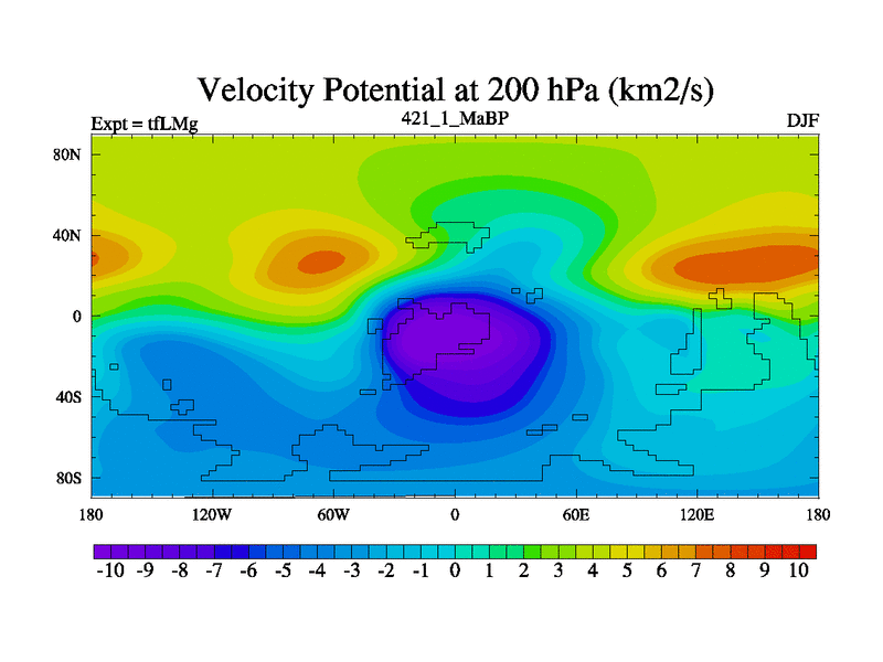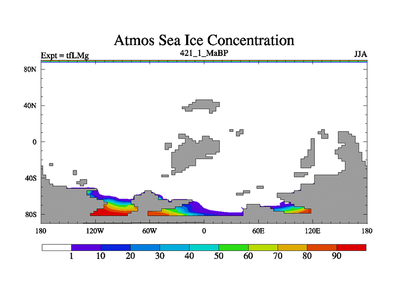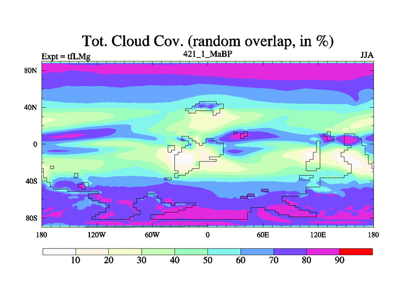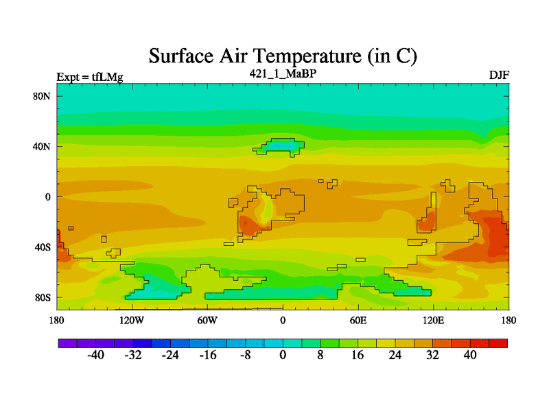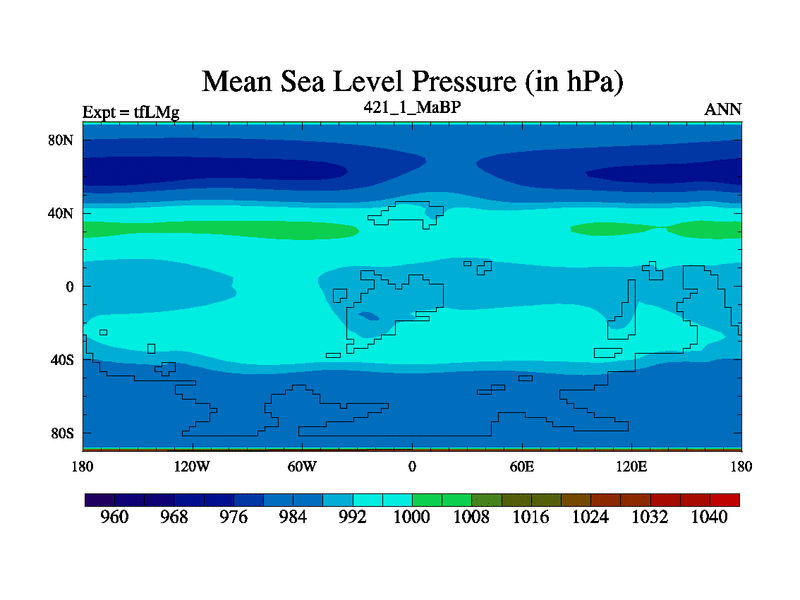 This is the 421.1 Ma simulation using the Scotese palaeogeographies and revised CCN etc. This version has islands and smoothing and desert albedo included. Tuned CO2 to give Scotese temperatures. Started from end of tfKSg. With JEDI output.