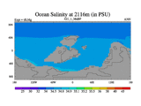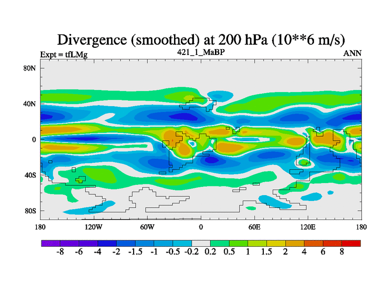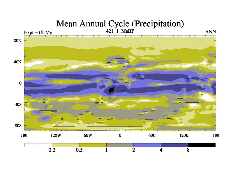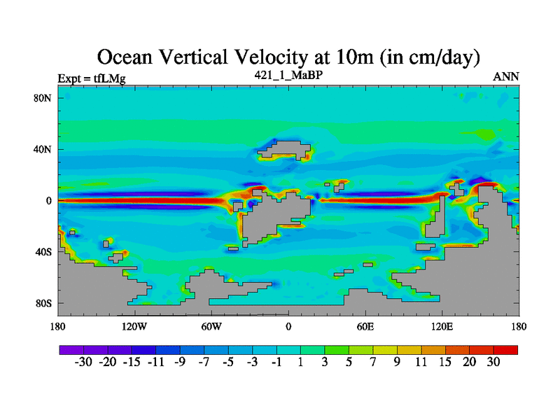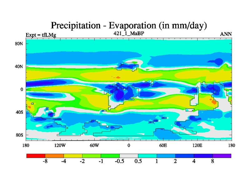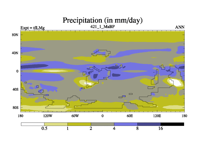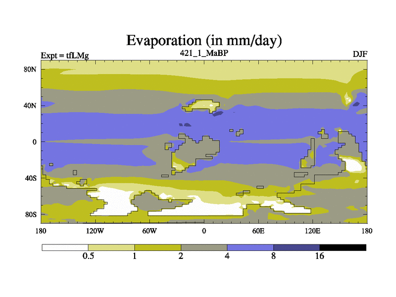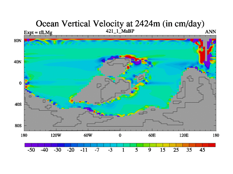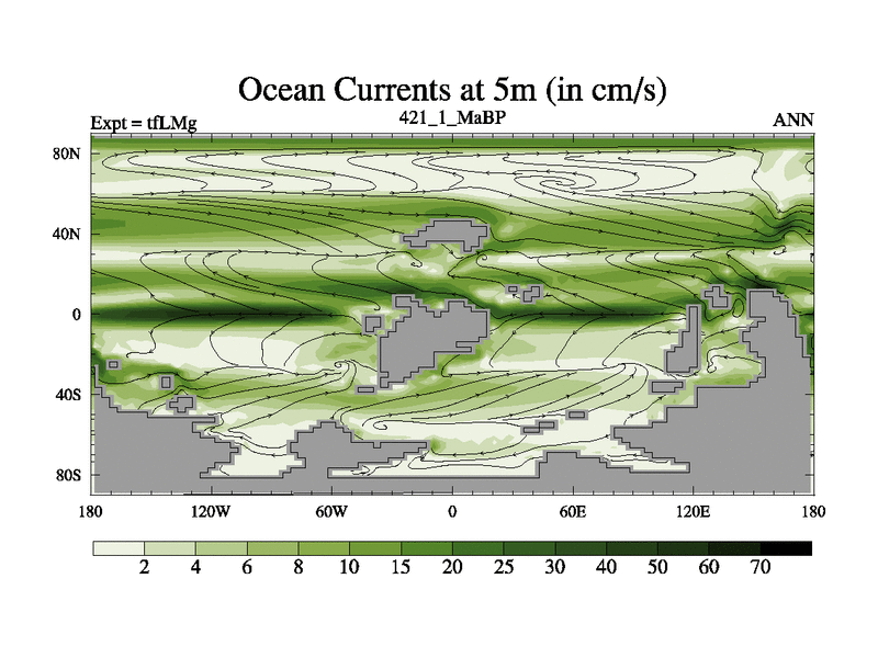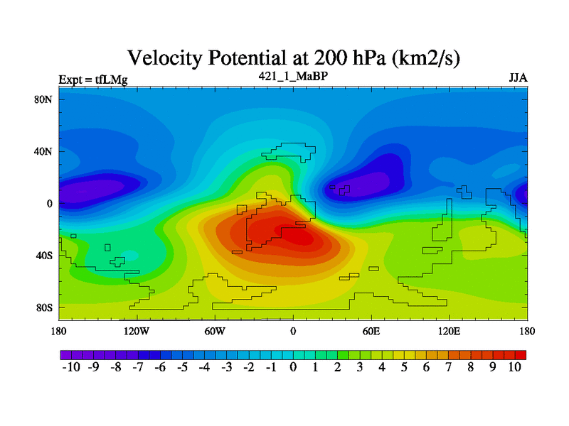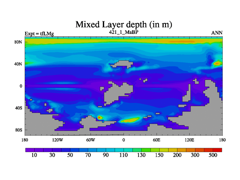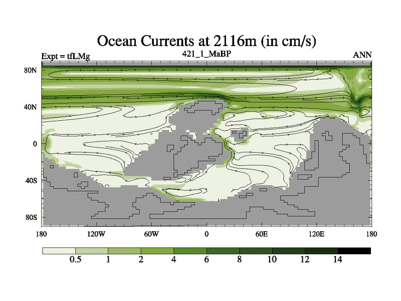 This is the 421.1 Ma simulation using the Scotese palaeogeographies and revised CCN etc. This version has islands and smoothing and desert albedo included. Tuned CO2 to give Scotese temperatures. Started from end of tfKSg. With JEDI output.