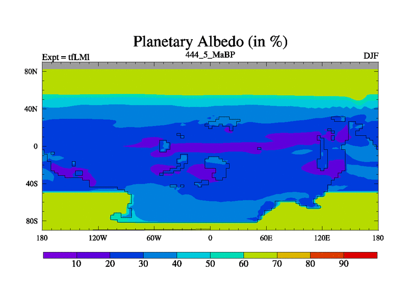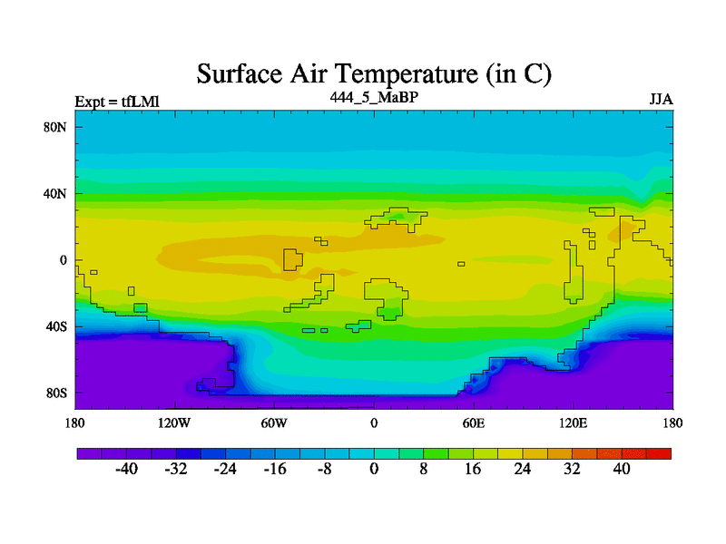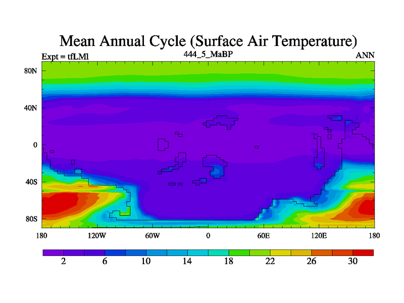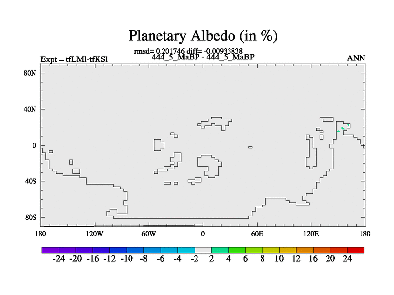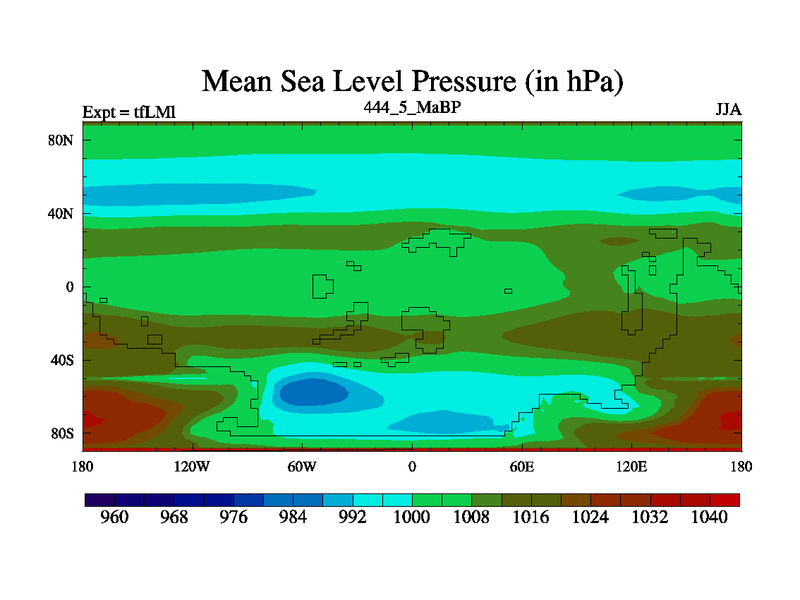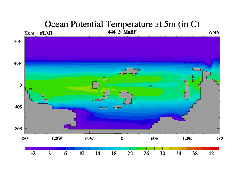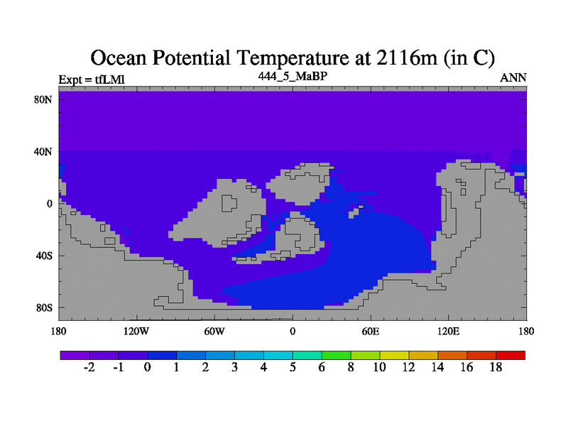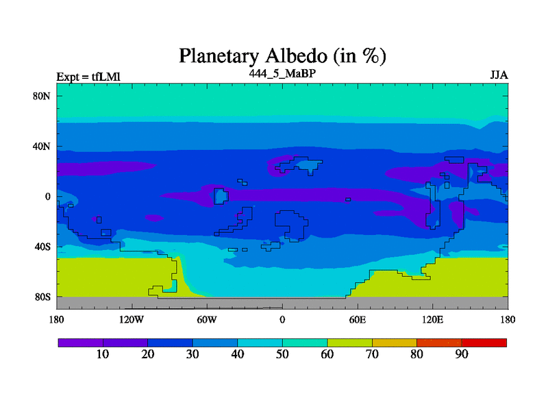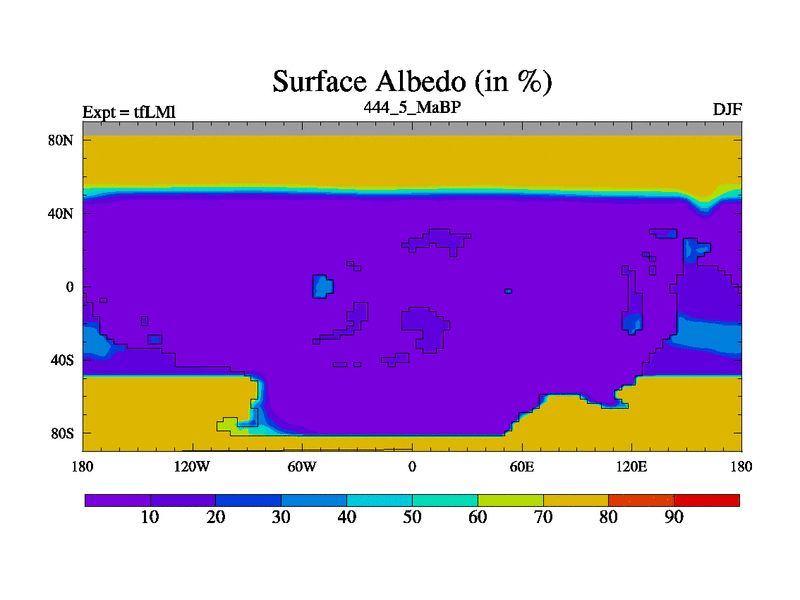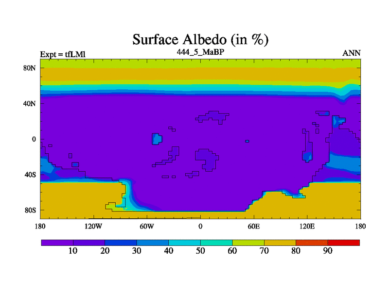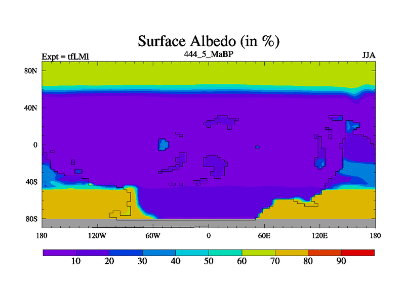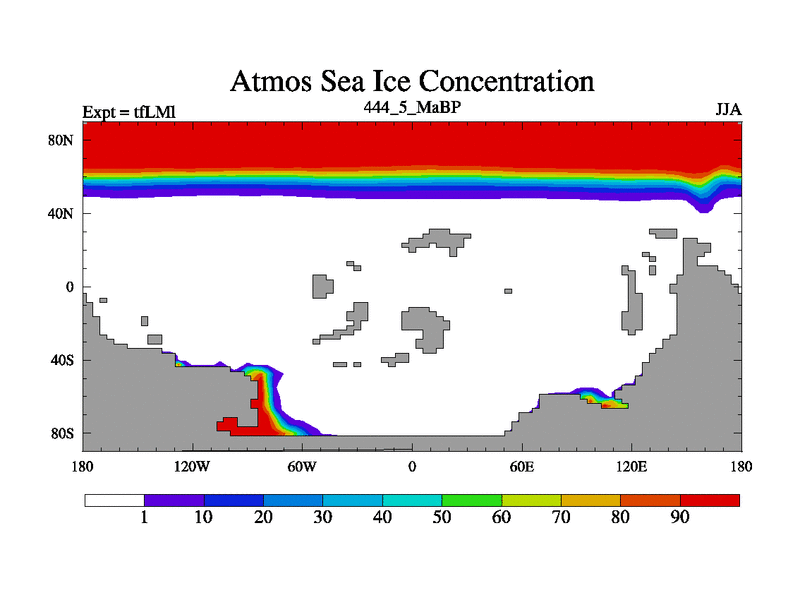 This is the 444.5 Ma simulation using the Scotese palaeogeographies and revised CCN etc. This version has islands and smoothing and desert albedo included. Tuned CO2 to give Scotese temperatures. Started from end of tfKSl. With JEDI output.