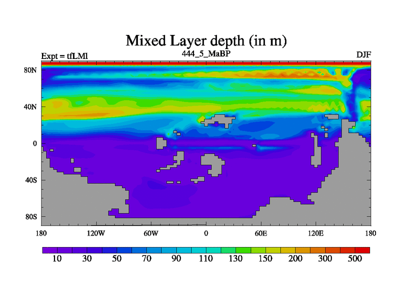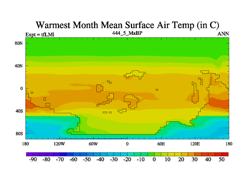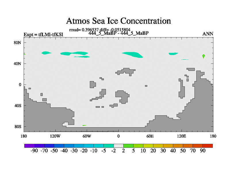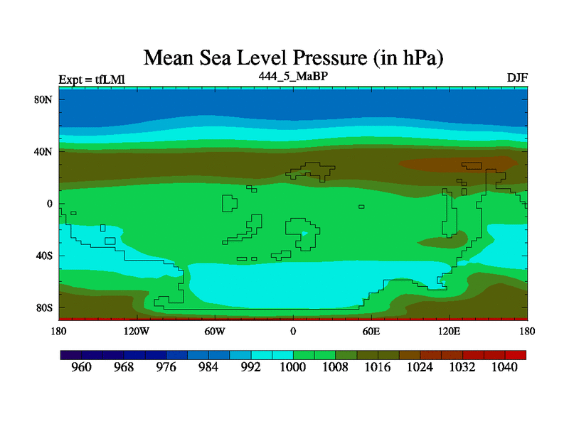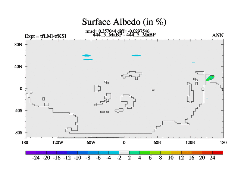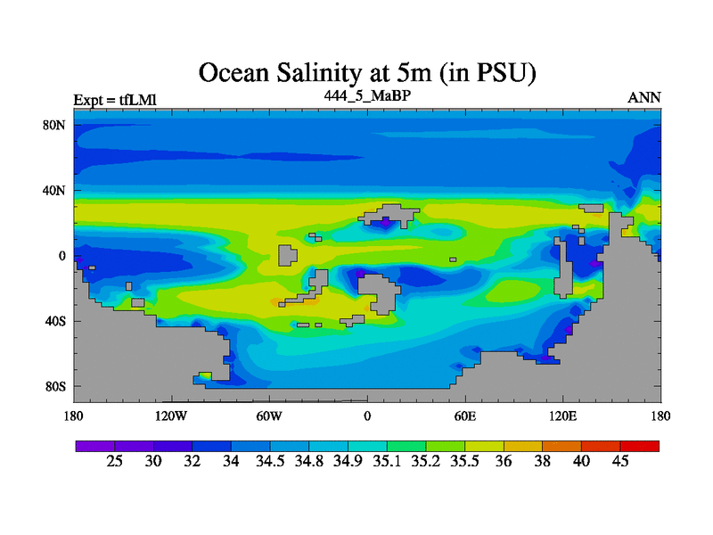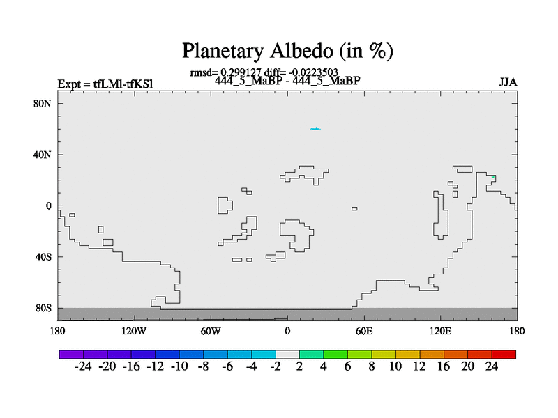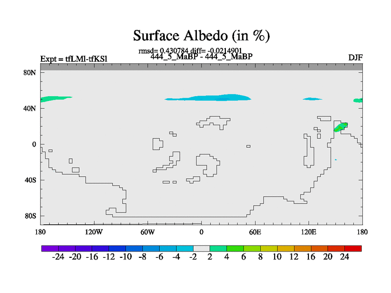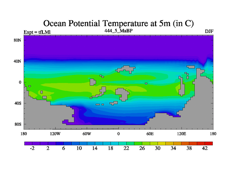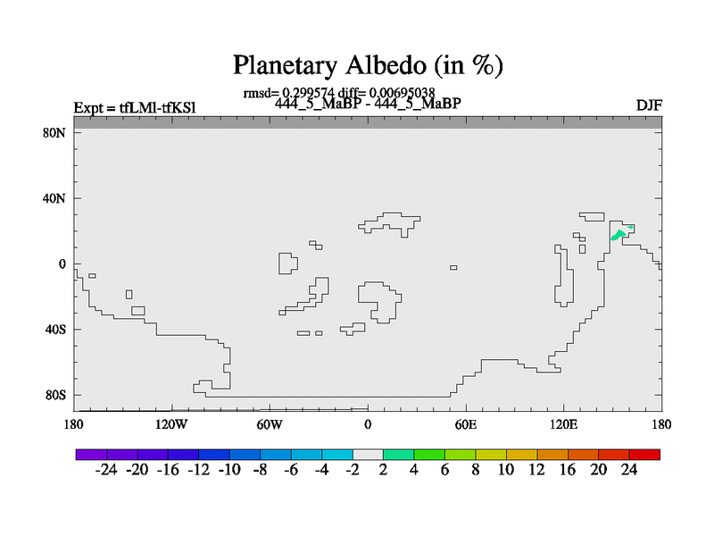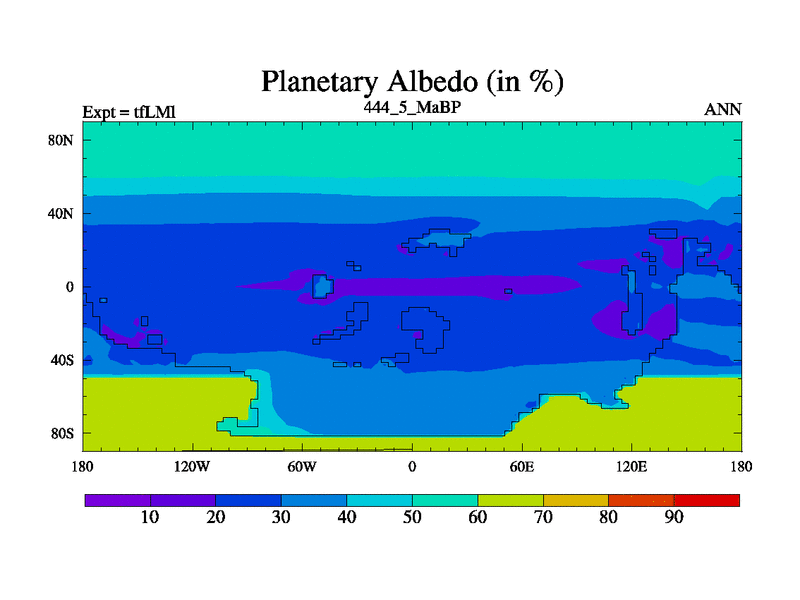 This is the 444.5 Ma simulation using the Scotese palaeogeographies and revised CCN etc. This version has islands and smoothing and desert albedo included. Tuned CO2 to give Scotese temperatures. Started from end of tfKSl. With JEDI output.