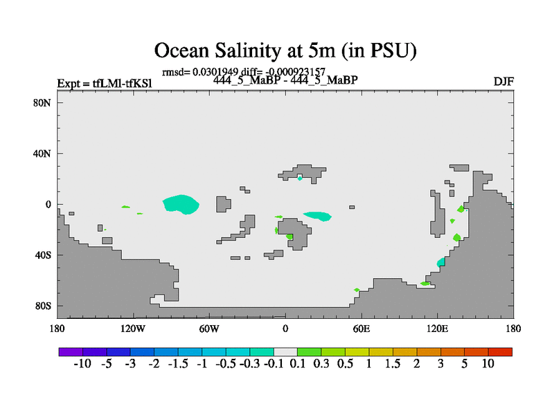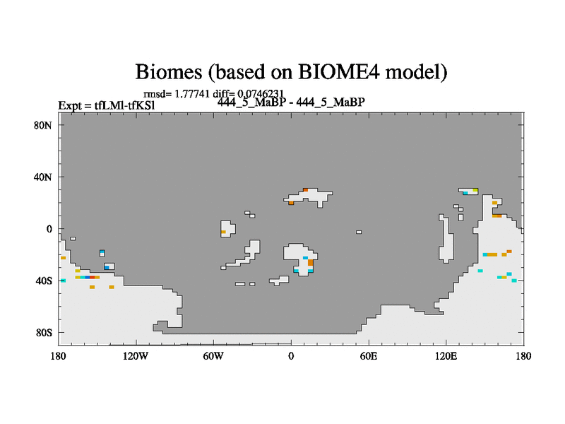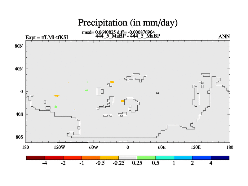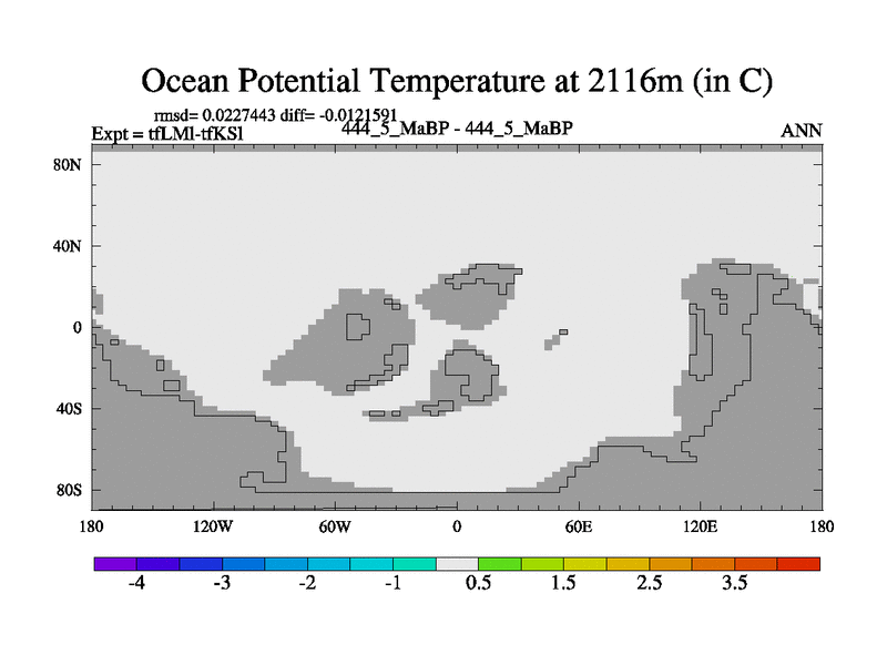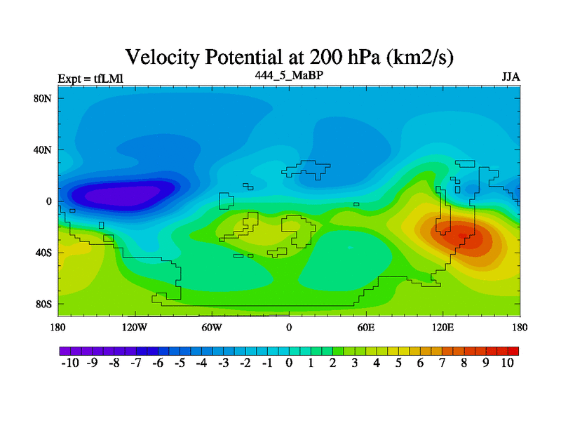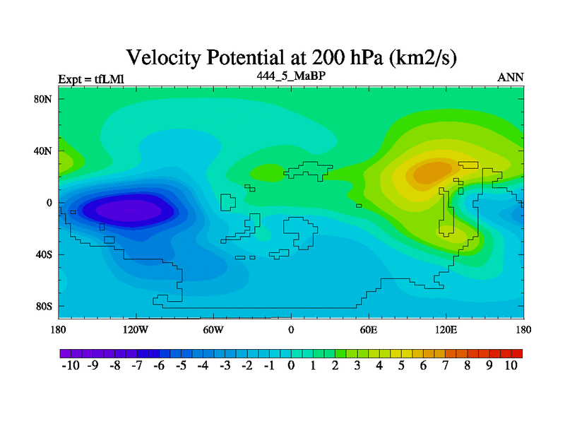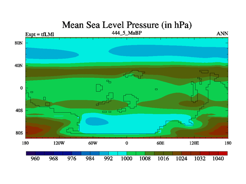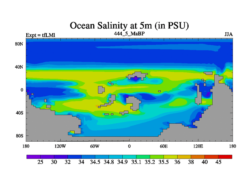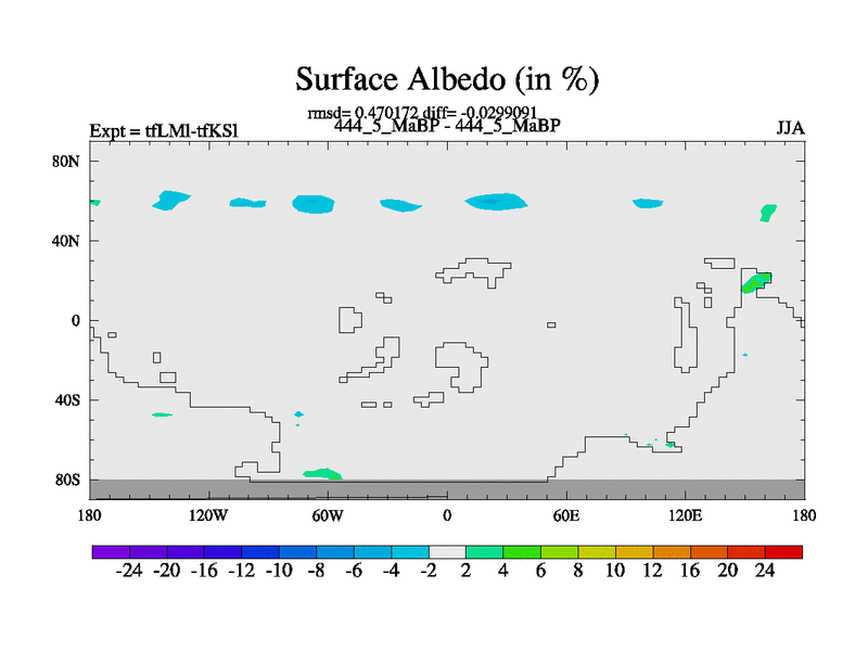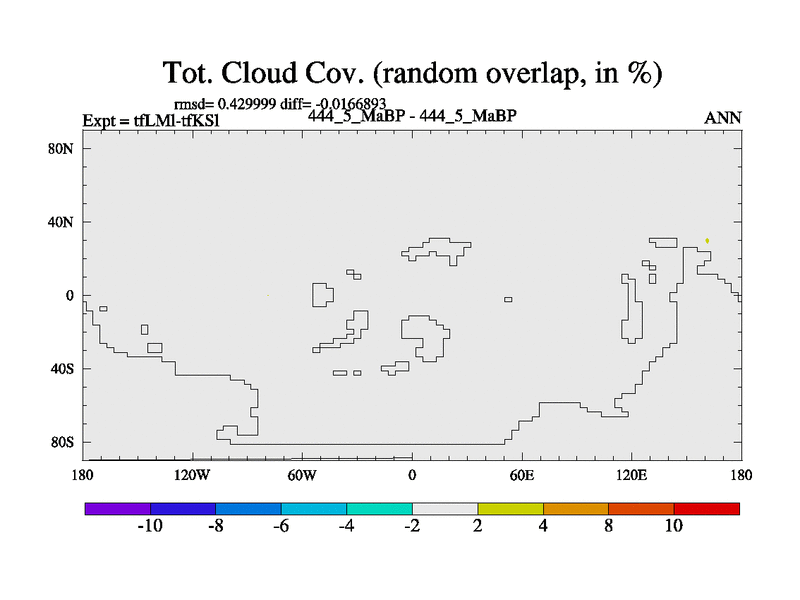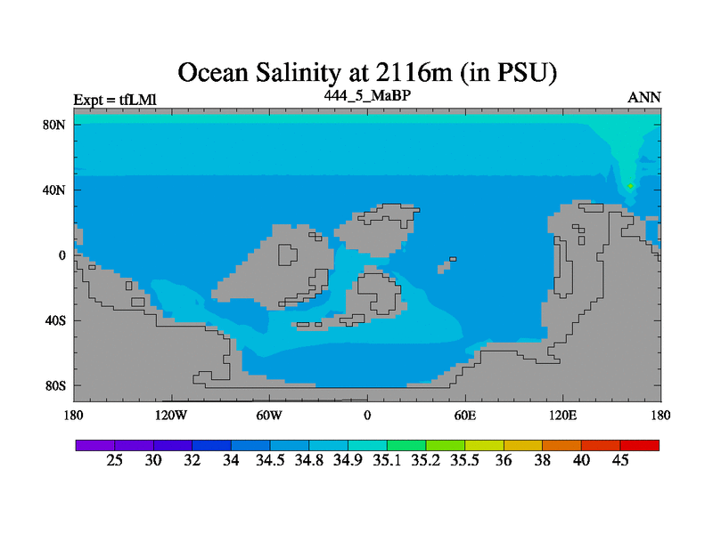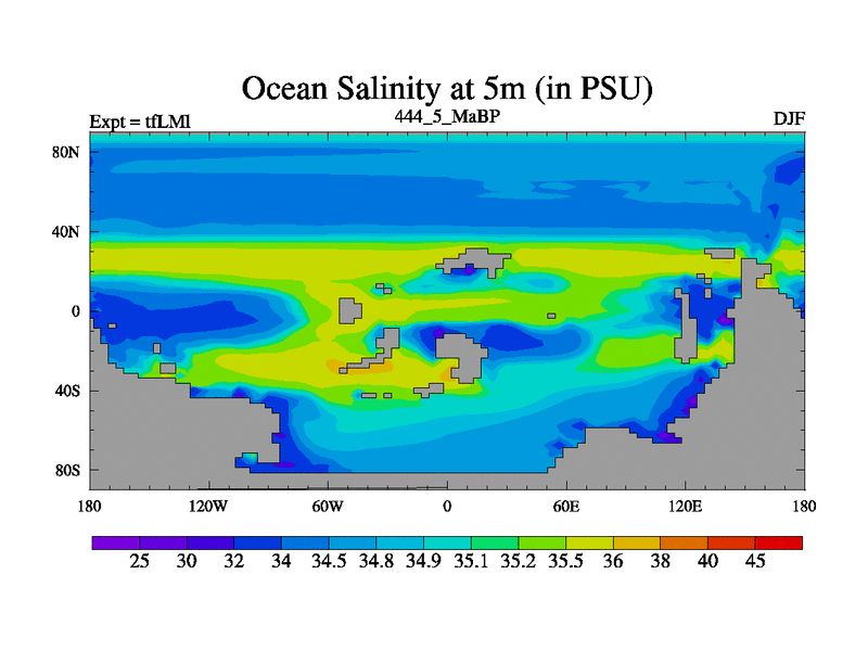 This is the 444.5 Ma simulation using the Scotese palaeogeographies and revised CCN etc. This version has islands and smoothing and desert albedo included. Tuned CO2 to give Scotese temperatures. Started from end of tfKSl. With JEDI output.