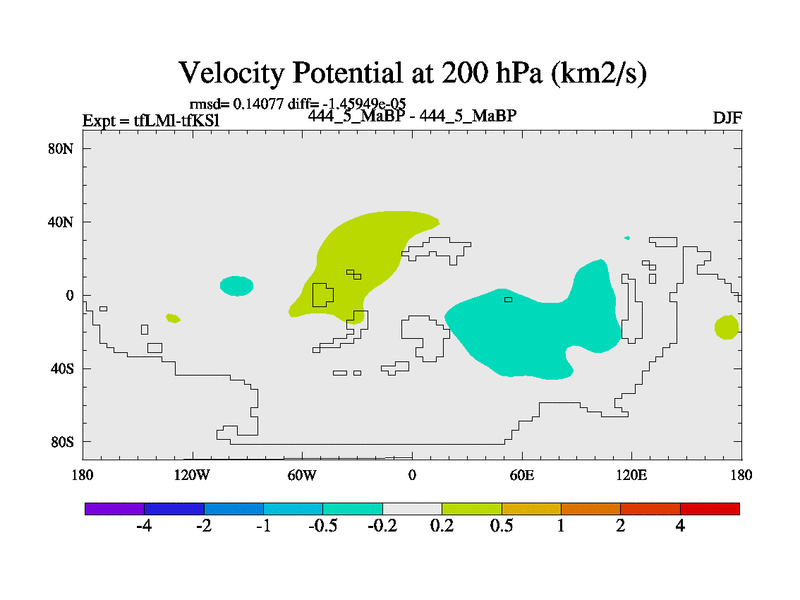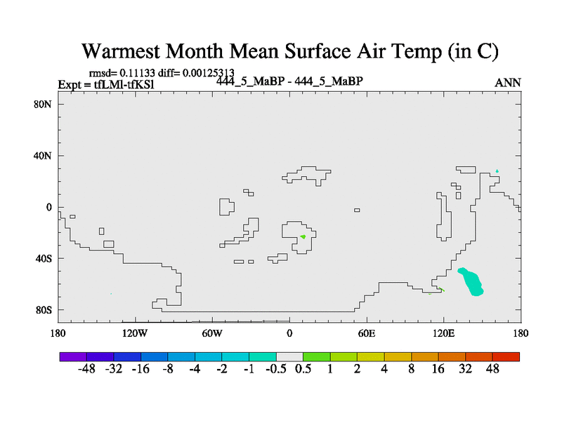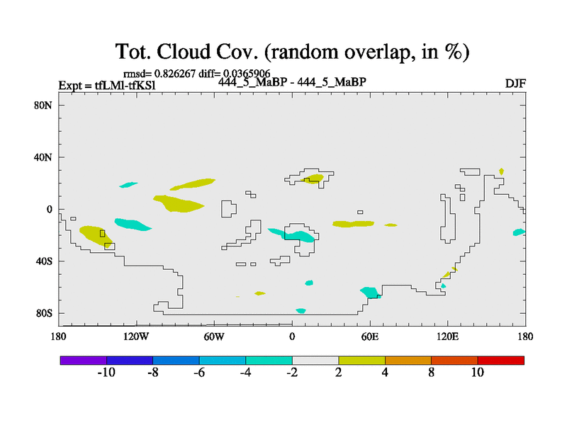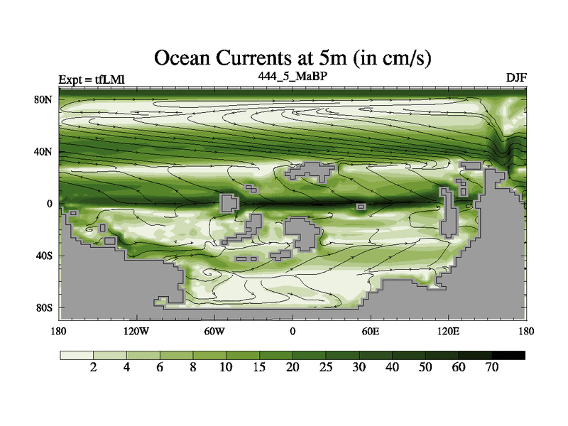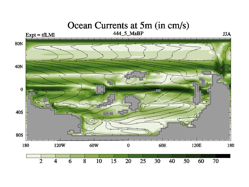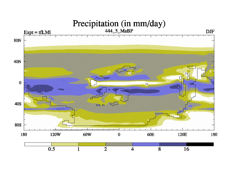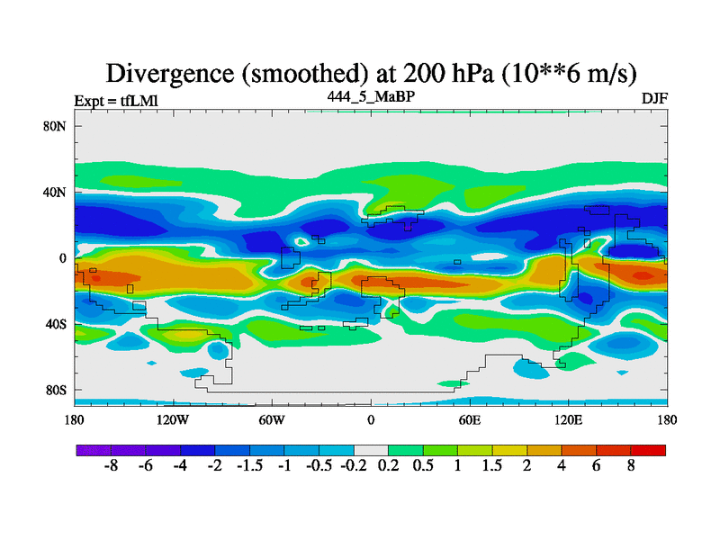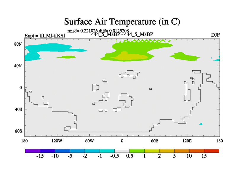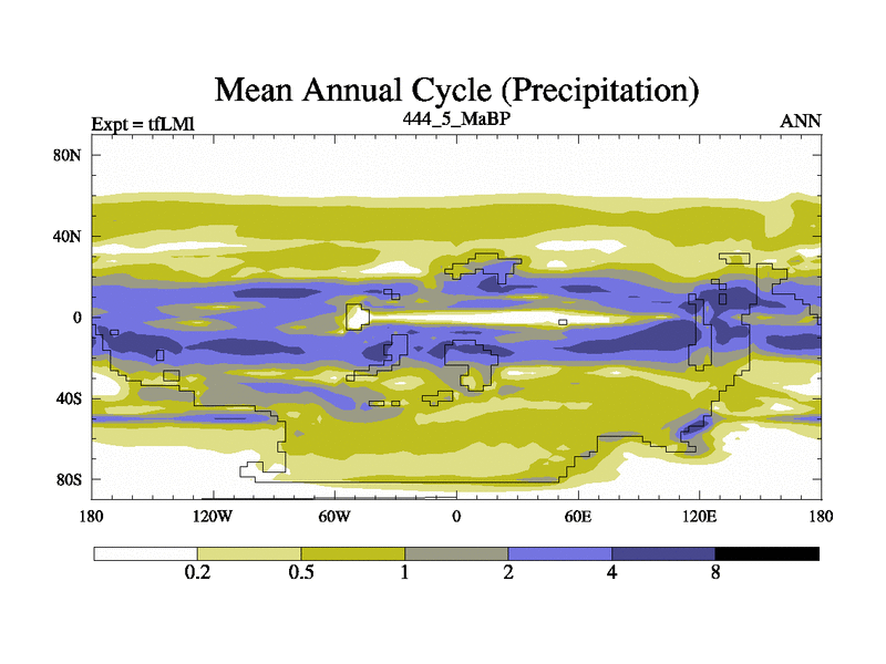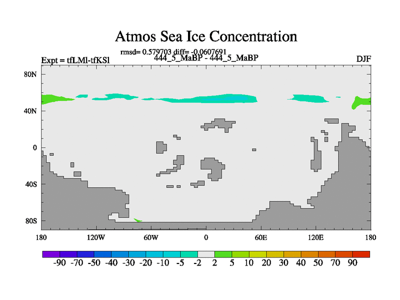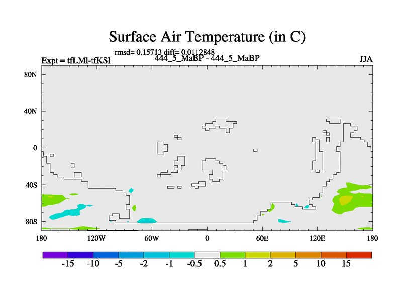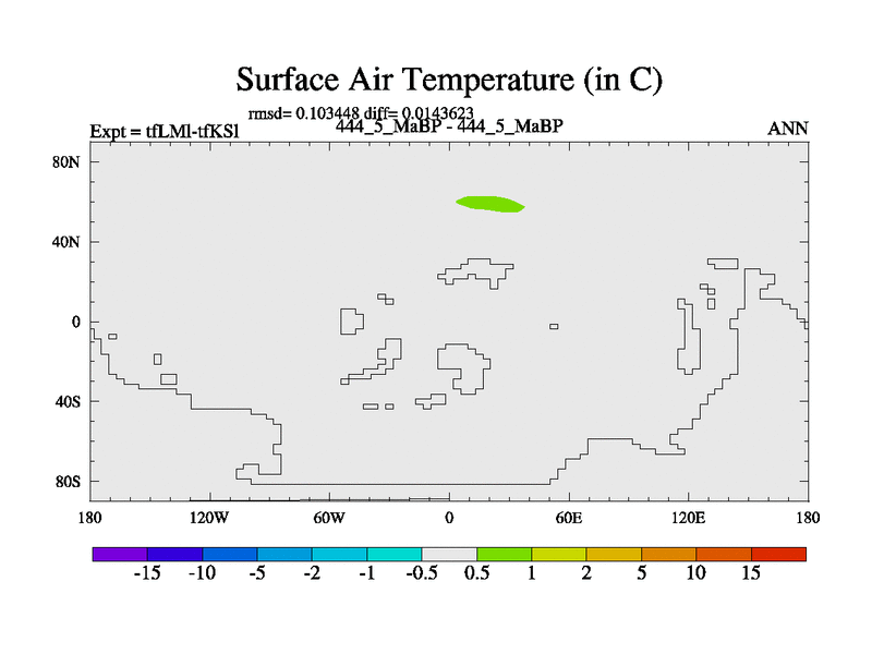 This is the 444.5 Ma simulation using the Scotese palaeogeographies and revised CCN etc. This version has islands and smoothing and desert albedo included. Tuned CO2 to give Scotese temperatures. Started from end of tfKSl. With JEDI output.