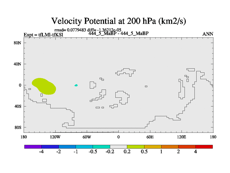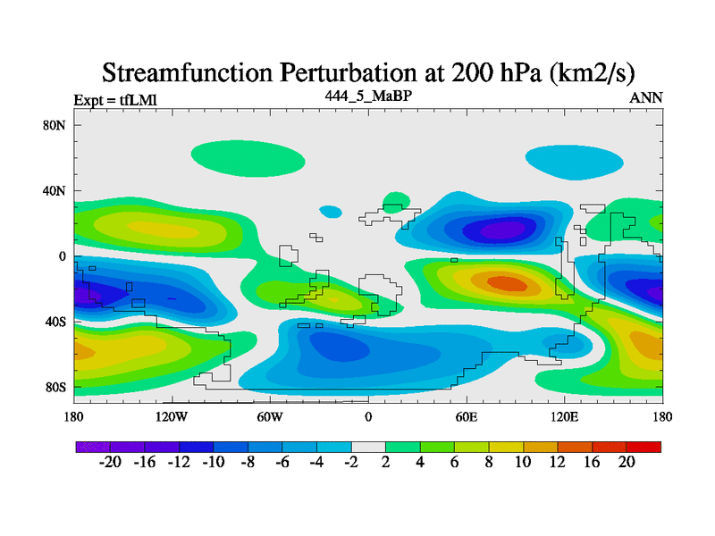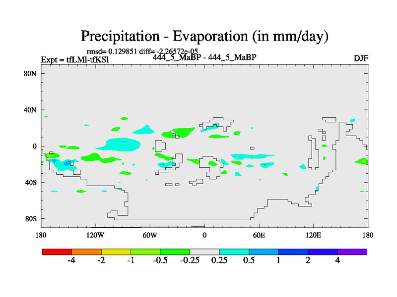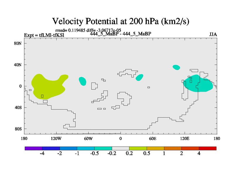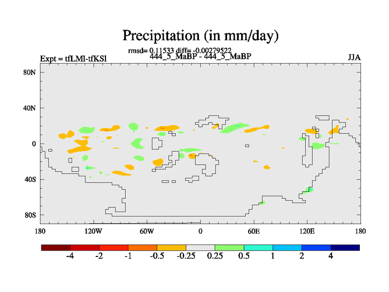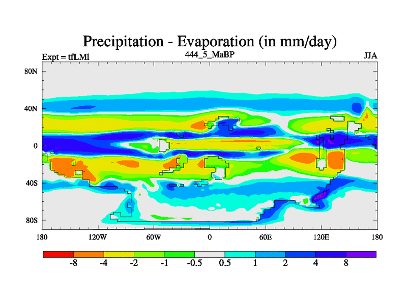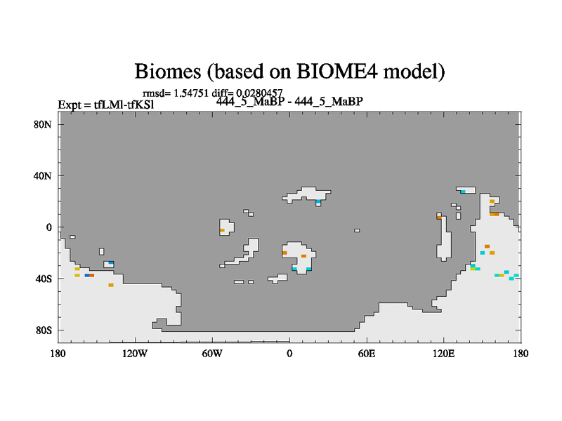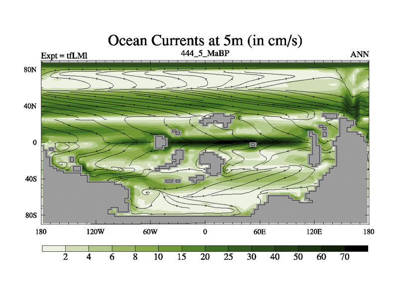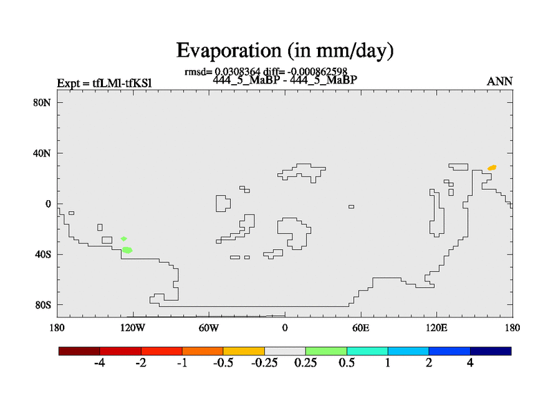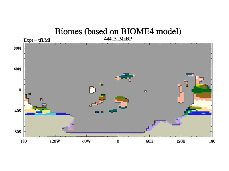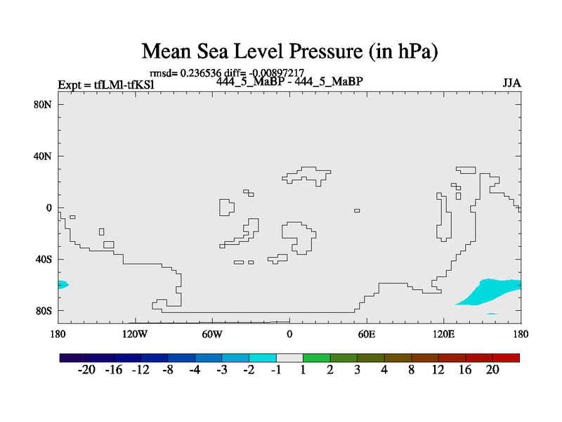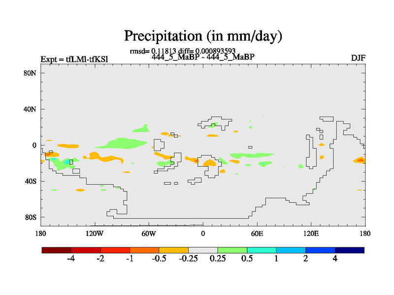 This is the 444.5 Ma simulation using the Scotese palaeogeographies and revised CCN etc. This version has islands and smoothing and desert albedo included. Tuned CO2 to give Scotese temperatures. Started from end of tfKSl. With JEDI output.