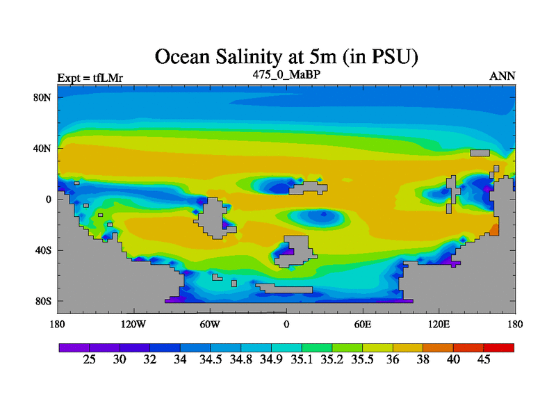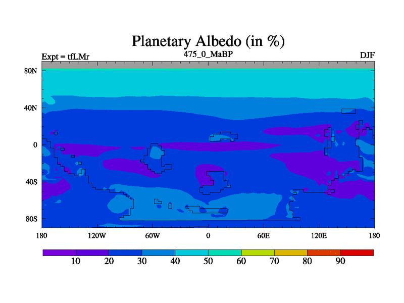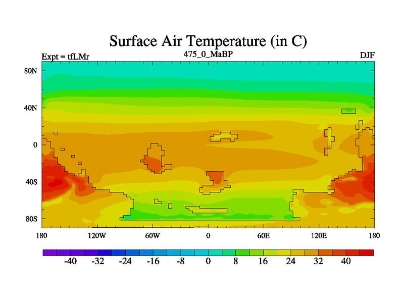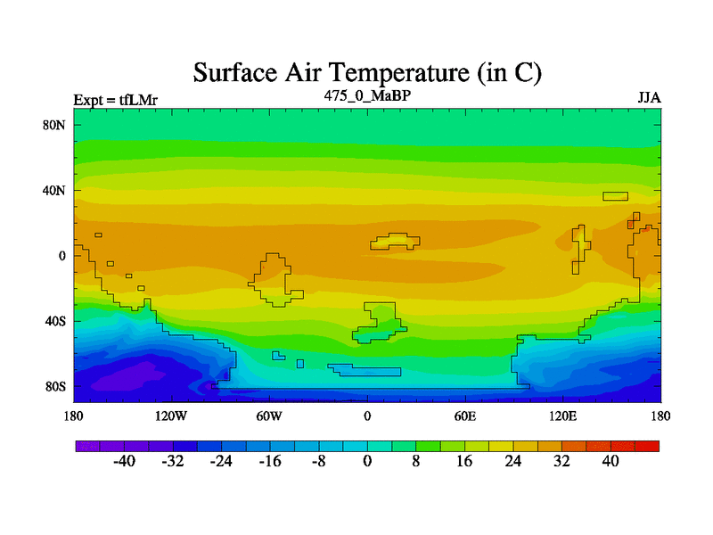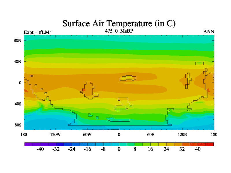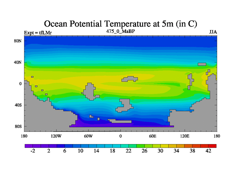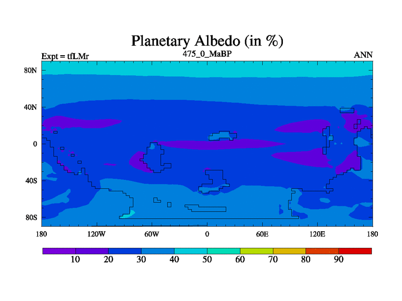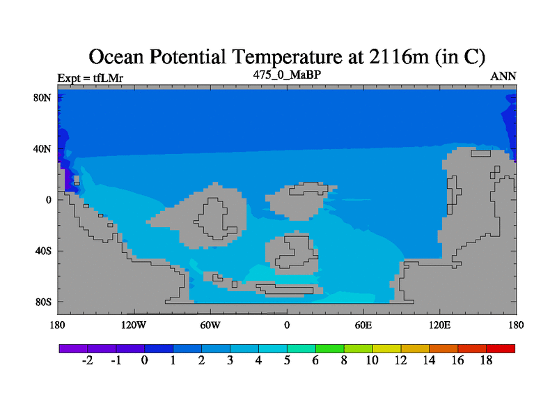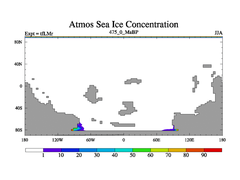 This is the 475.0 Ma simulation using the Scotese palaeogeographies and revised CCN etc. This version has islands and smoothing and desert albedo included. Tuned CO2 to give Scotese temperatures. Started from end of tfKSr. With JEDI output.
