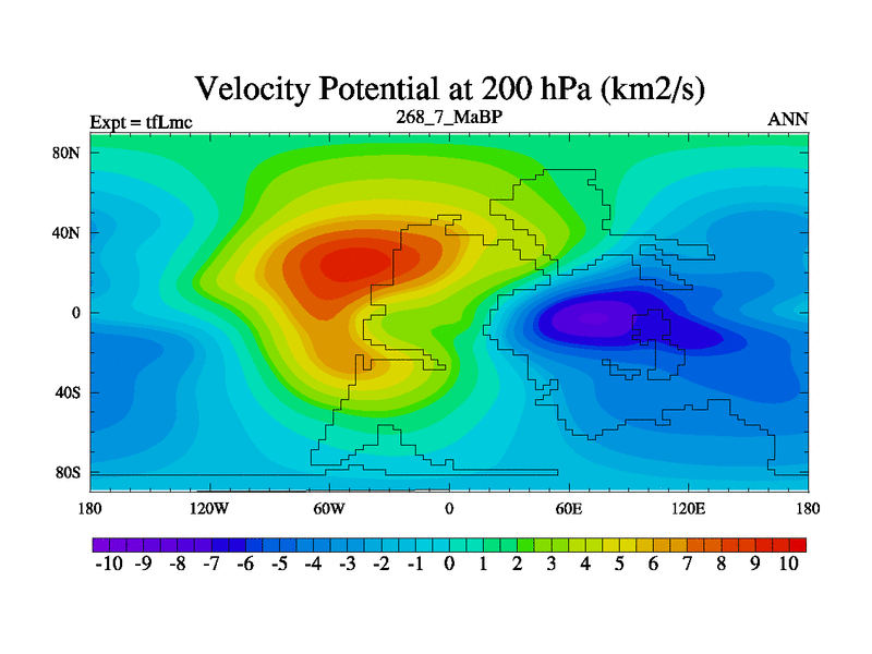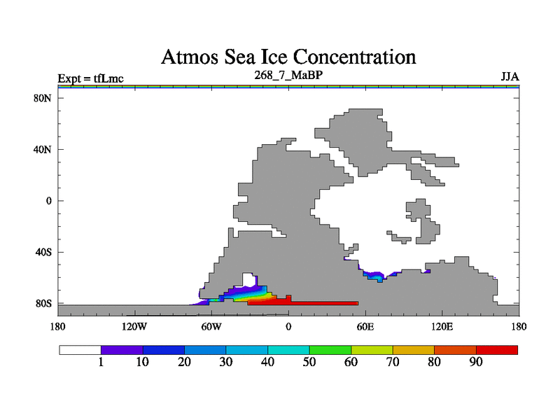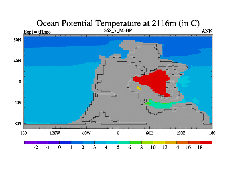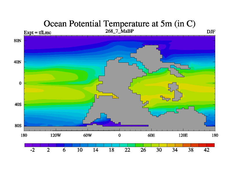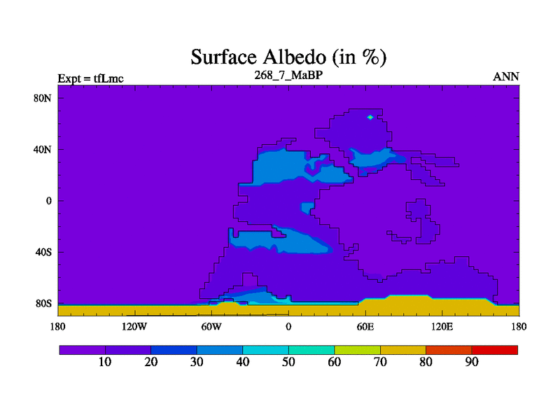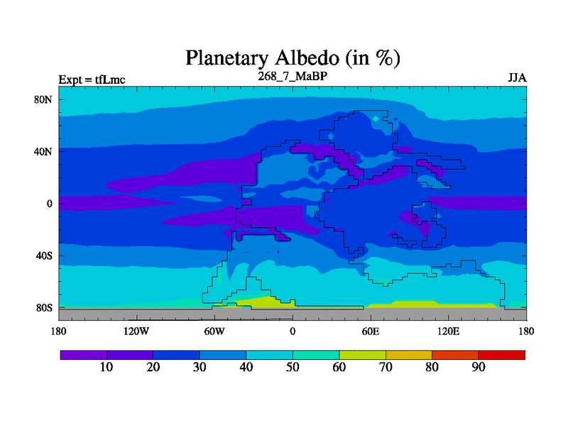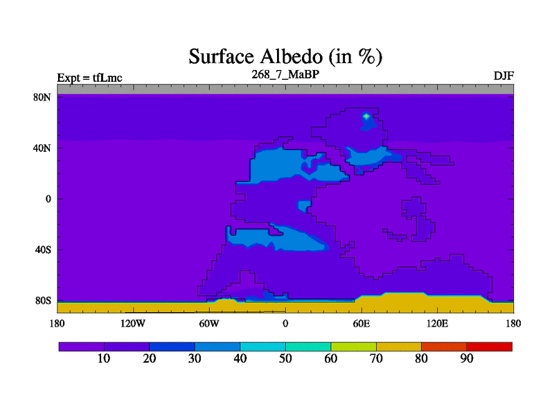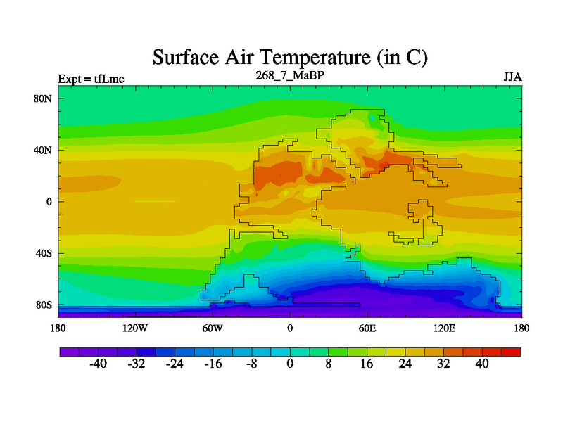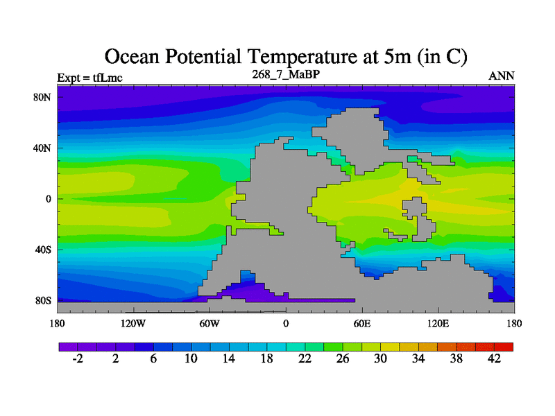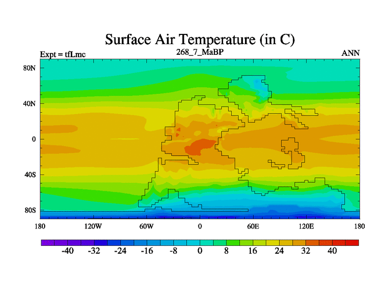 This is the 268.7 Ma simulation using the Scotese palaeogeographies and revised CCN etc. This version has islands and smoothing and desert albedo included. Tuned CO2 to give Scotese temperatures. Started from end of tfKsc. With JEDI output.