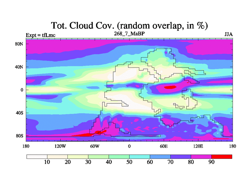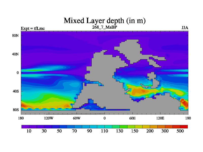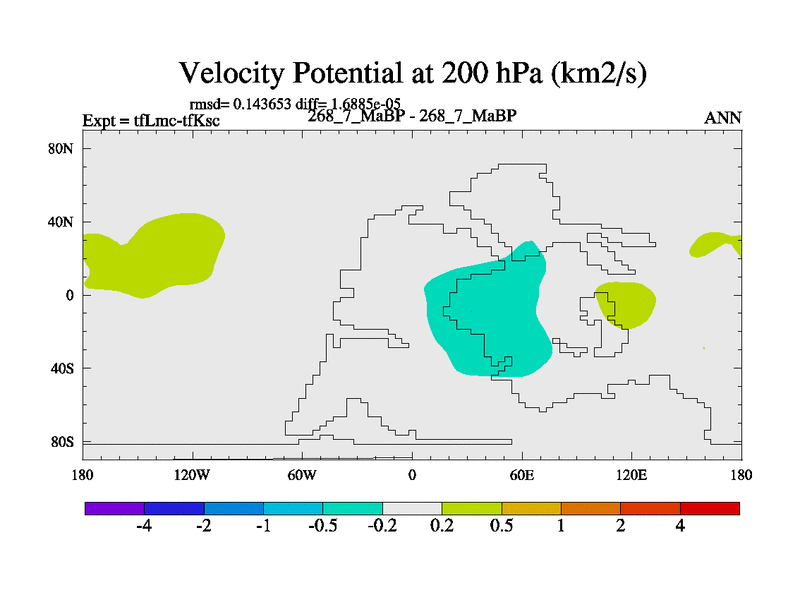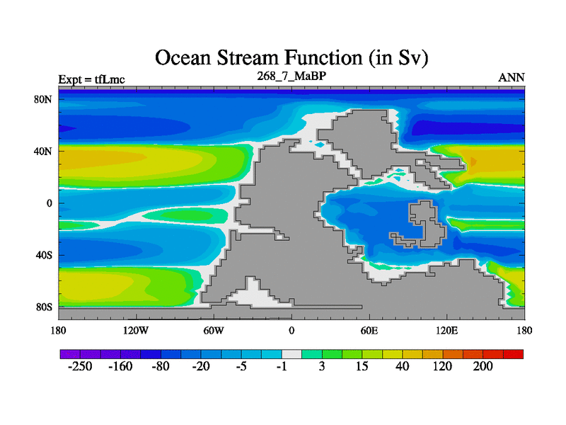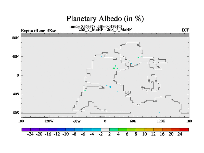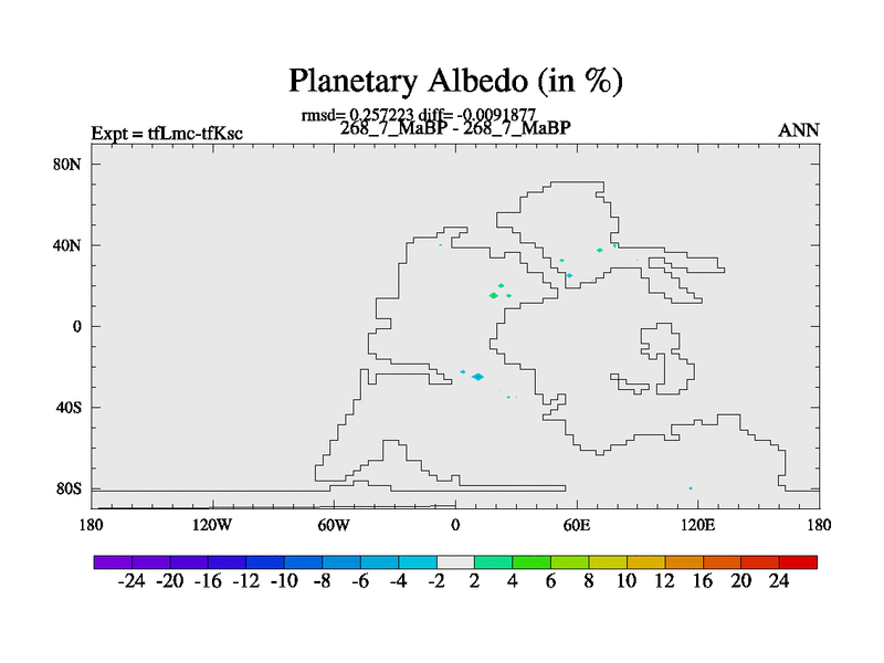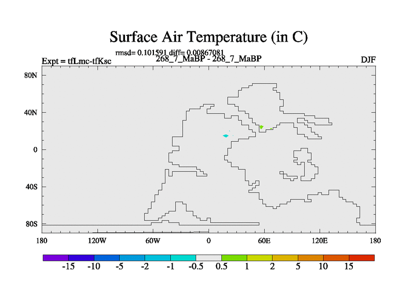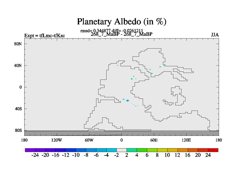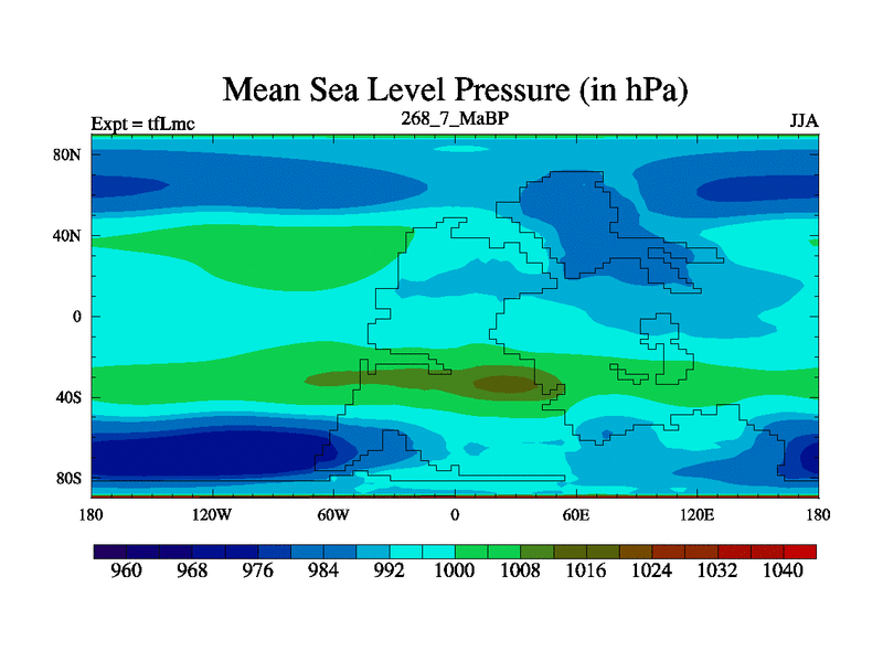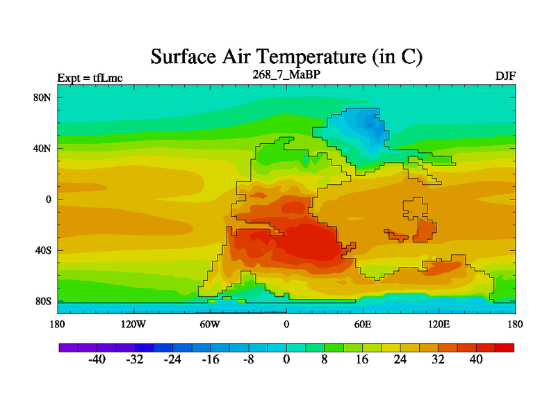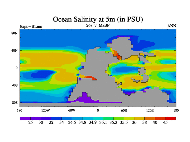 This is the 268.7 Ma simulation using the Scotese palaeogeographies and revised CCN etc. This version has islands and smoothing and desert albedo included. Tuned CO2 to give Scotese temperatures. Started from end of tfKsc. With JEDI output.