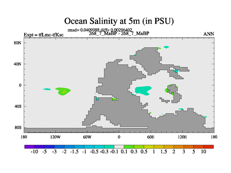 Scientifically as benchmark except using water age update, dark respiration, salinity conservation and revised ozone. Also using new orbital and solar update, and outputting leaf CO2. This version has islands included and atmospheric smoothing and desert albedo. Tuned CO2 to give Scotese temperatures. Started from end of tfKsc. With JEDI output.
