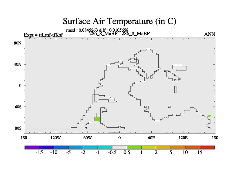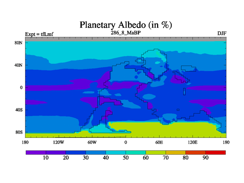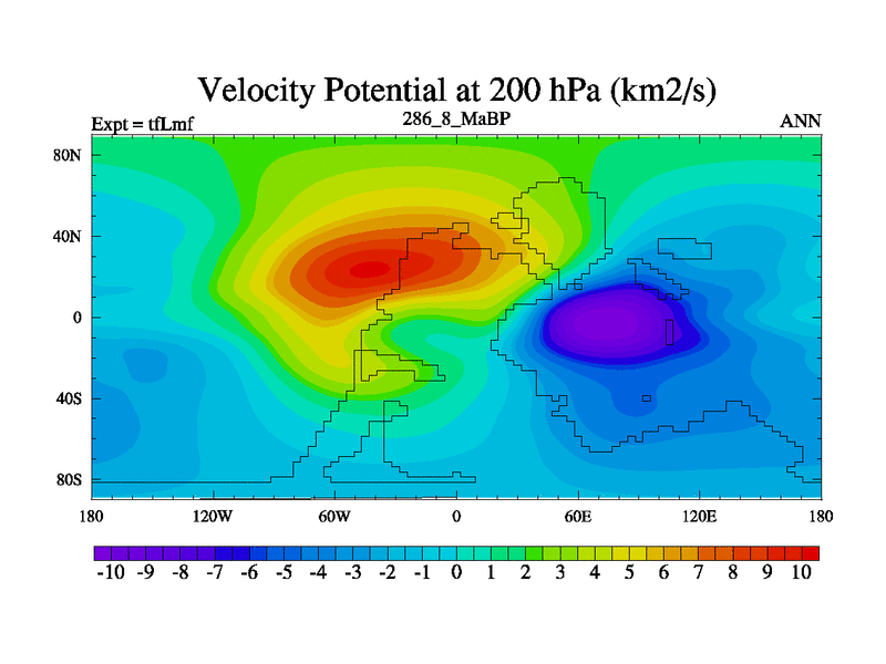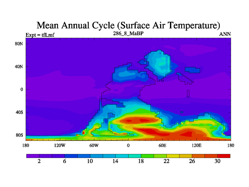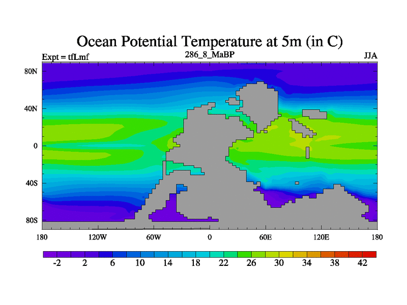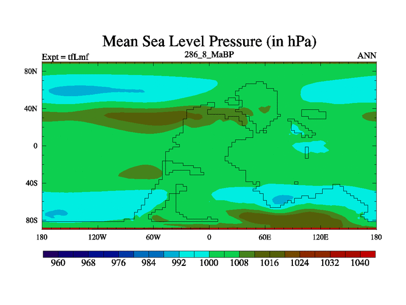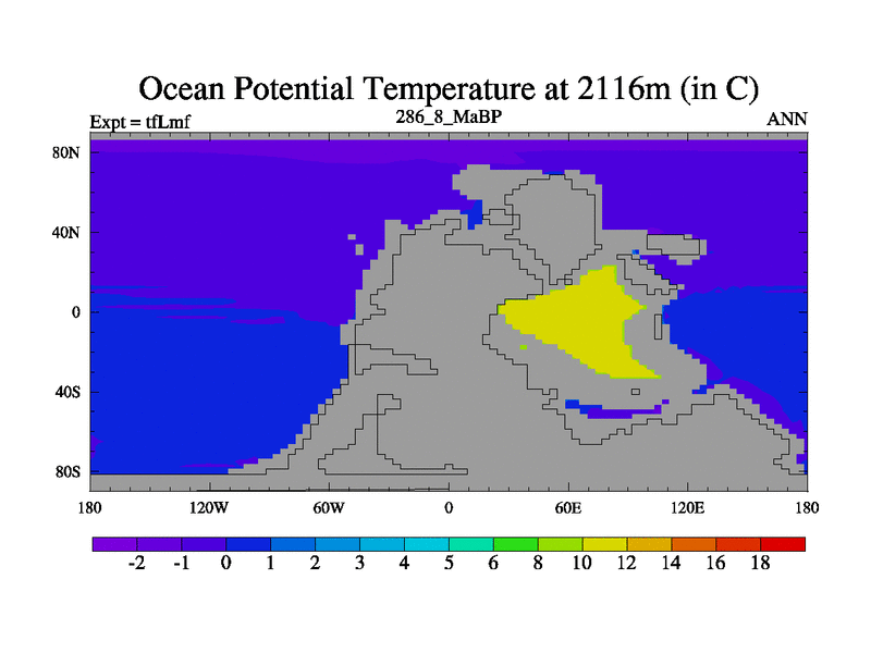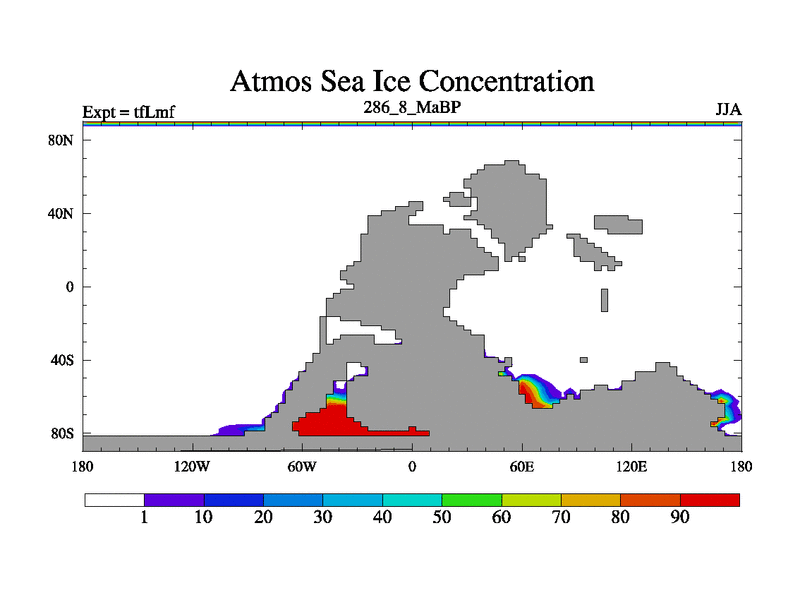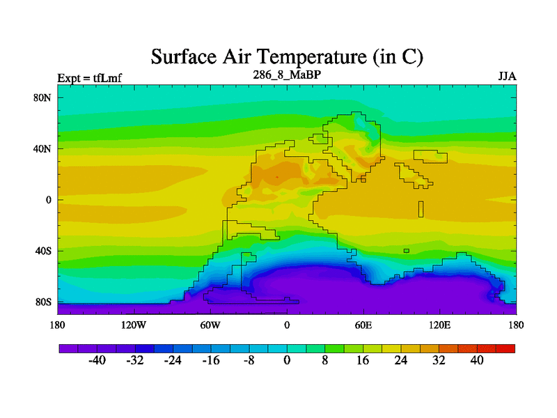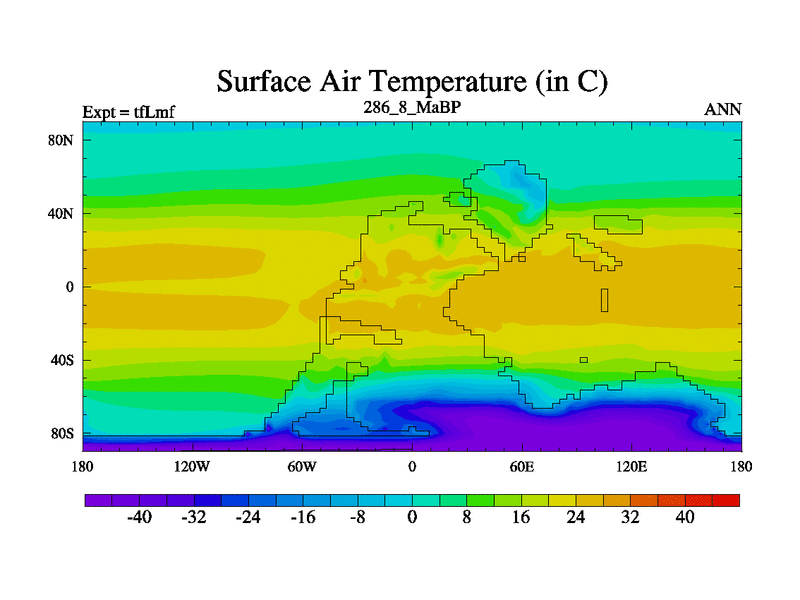 This is the 286.8 Ma simulation using the Scotese palaeogeographies and revised CCN etc. This version has islands and smoothing and desert albedo included. Tuned CO2 to give Scotese temperatures. Started from end of tfKsf. With JEDI output.