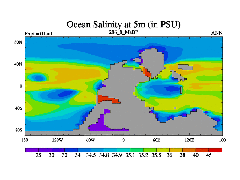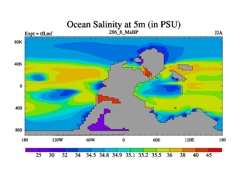 Scientifically as benchmark except using water age update, dark respiration, salinity conservation and revised ozone. Also using new orbital and solar update, and outputting leaf CO2. This version has islands included and atmospheric smoothing and desert albedo. Tuned CO2 to give Scotese temperatures. Started from end of tfKsf. With JEDI output.