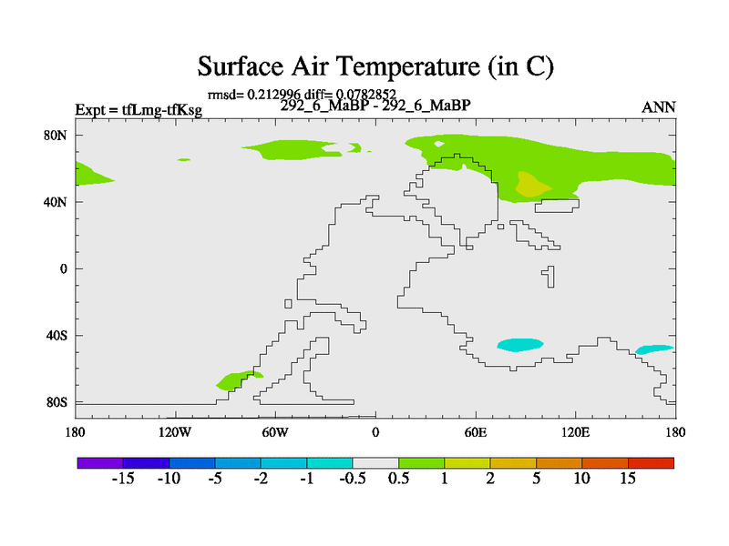 Scientifically as benchmark except using water age update, dark respiration, salinity conservation and revised ozone. Also using new orbital and solar update, and outputting leaf CO2. This version has islands included and atmospheric smoothing and desert albedo. Tuned CO2 to give Scotese temperatures. Started from end of tfKsg. With JEDI output.