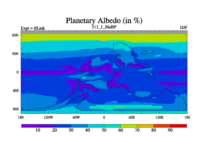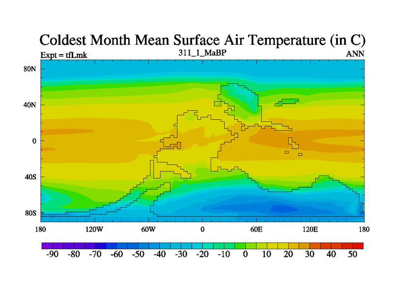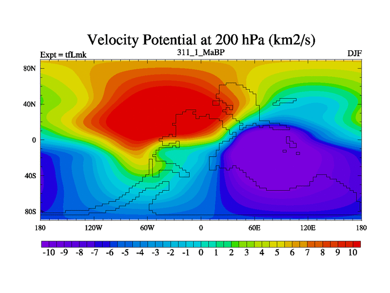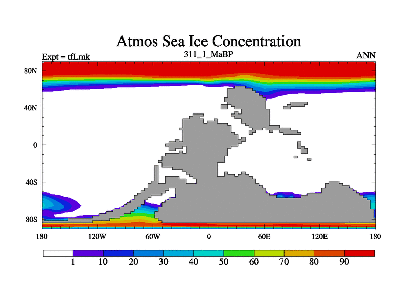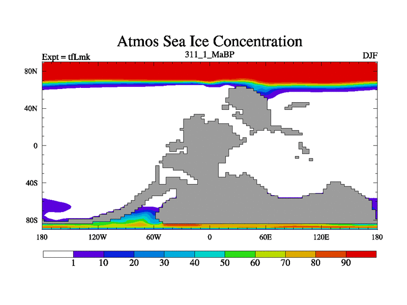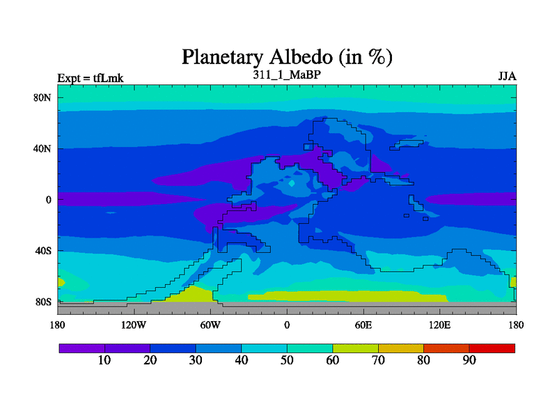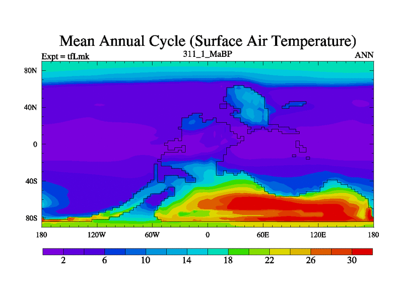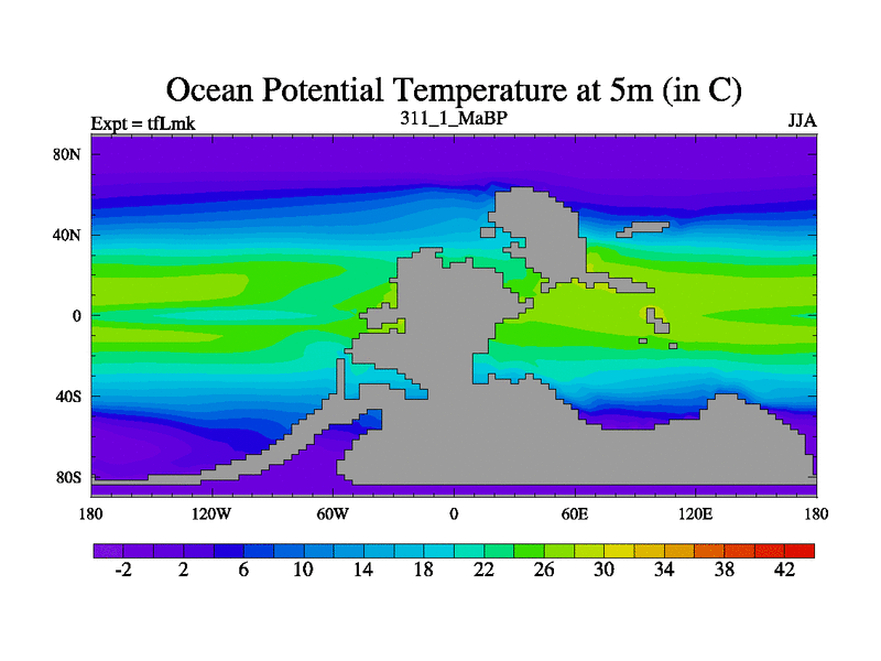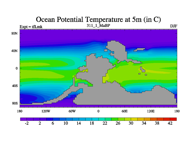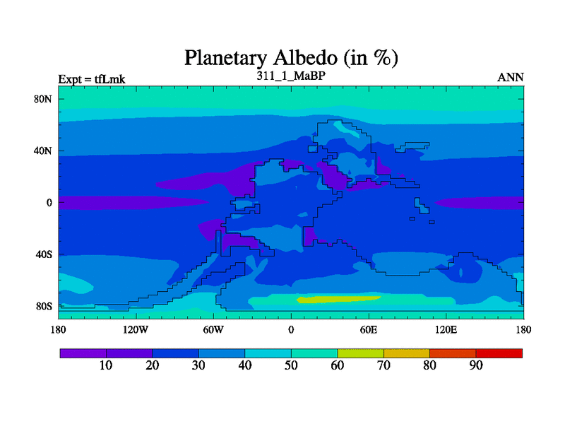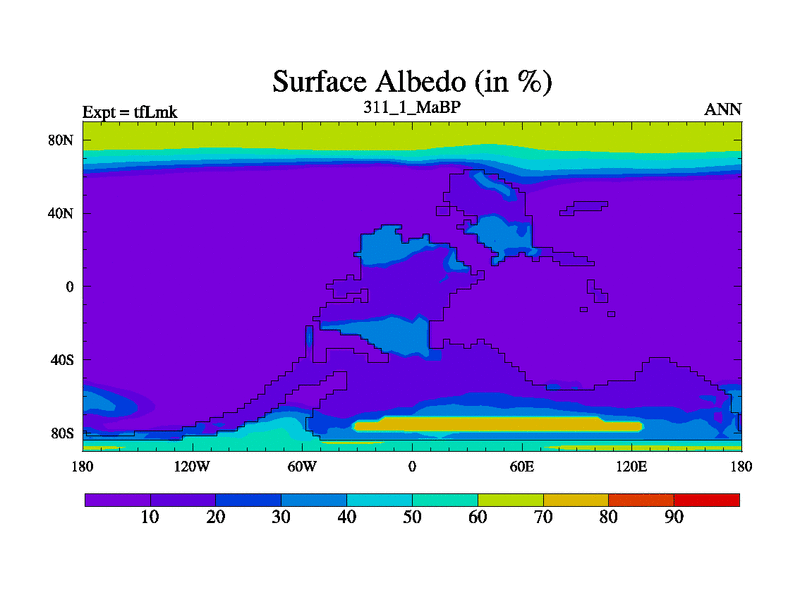 This is the 311.1 Ma simulation using the Scotese palaeogeographies and revised CCN etc. This version has islands and smoothing and desert albedo included. Tuned CO2 to give Scotese temperatures. Started from end of tfKsk. With JEDI output.