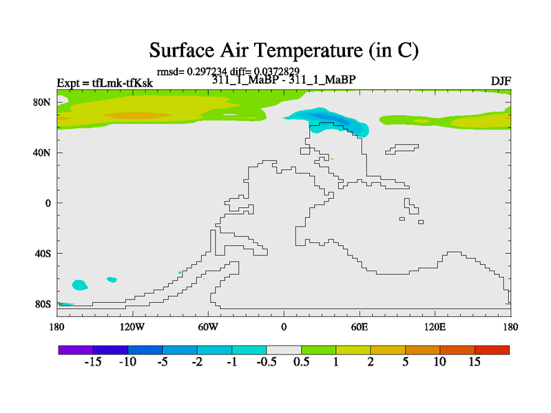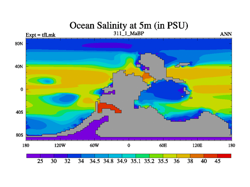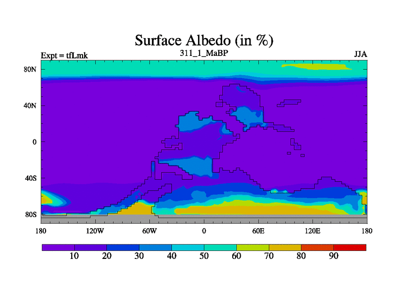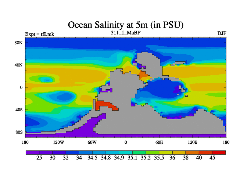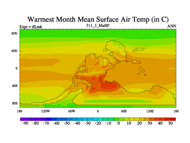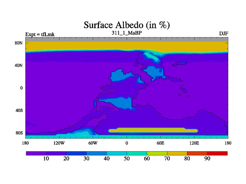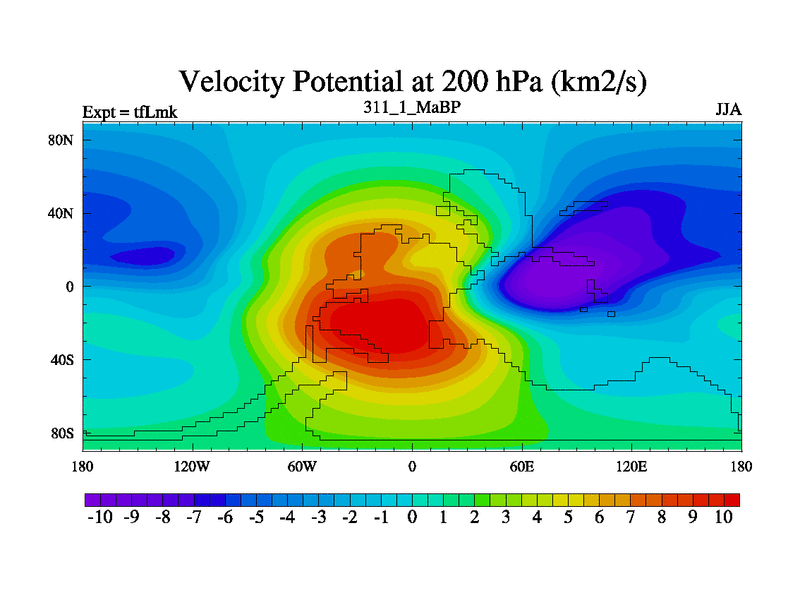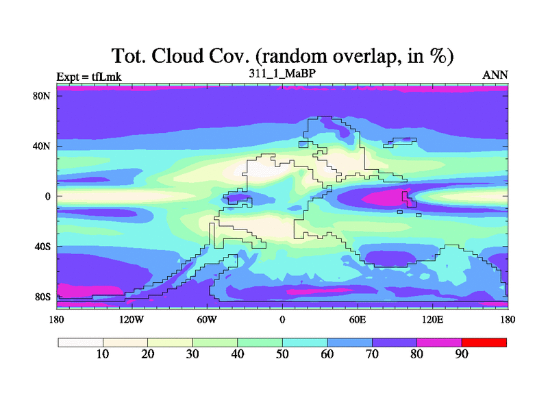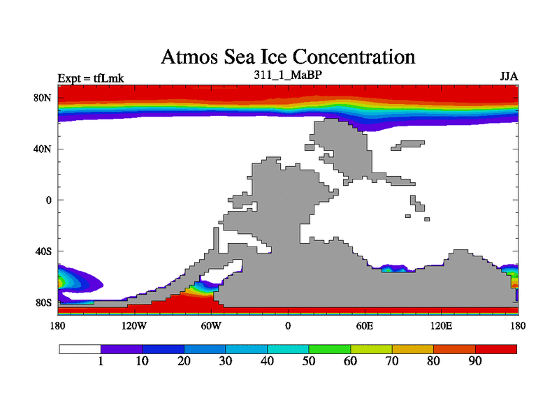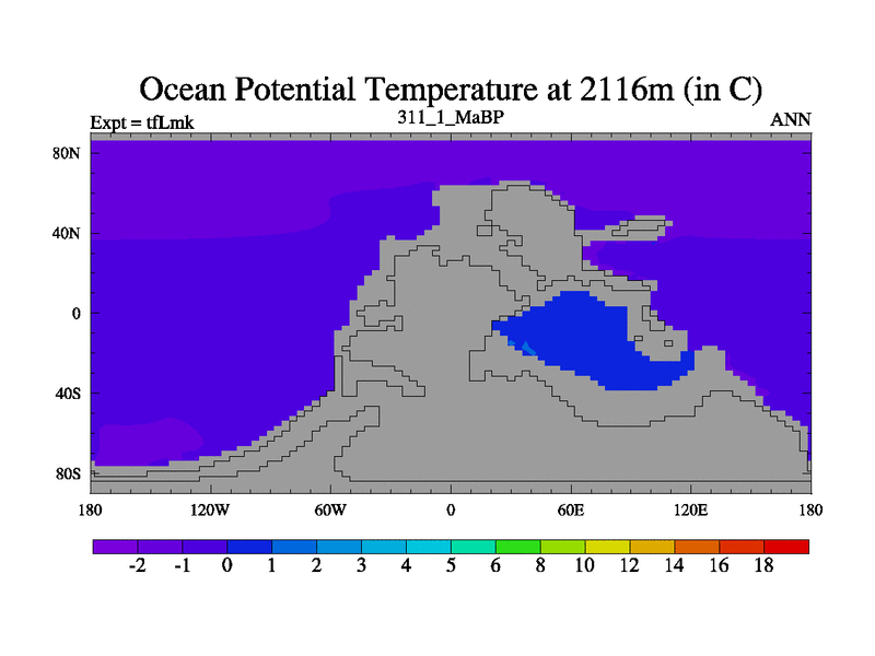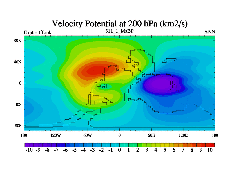 This is the 311.1 Ma simulation using the Scotese palaeogeographies and revised CCN etc. This version has islands and smoothing and desert albedo included. Tuned CO2 to give Scotese temperatures. Started from end of tfKsk. With JEDI output.