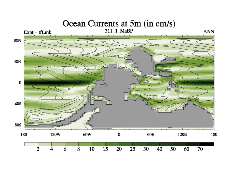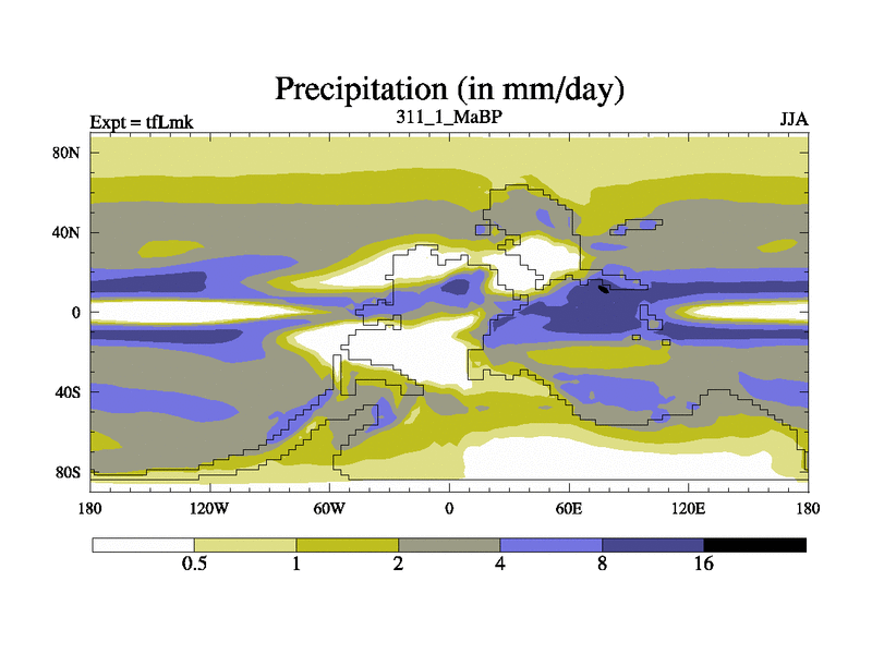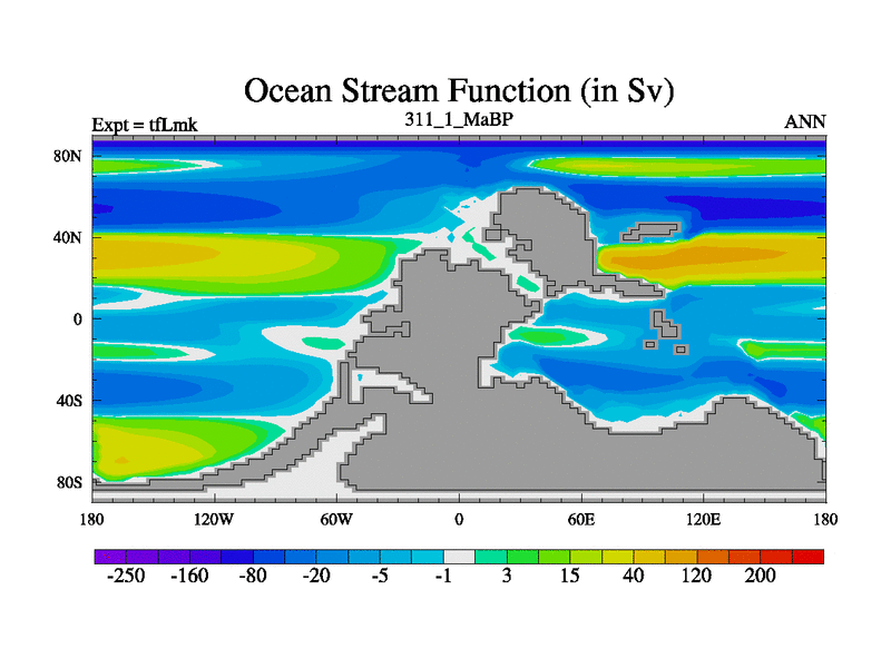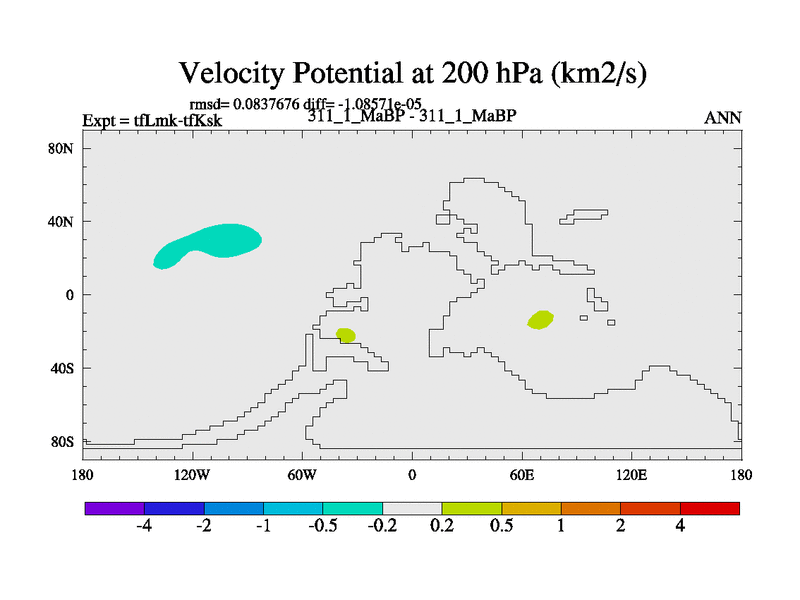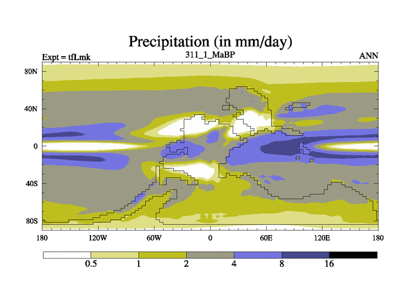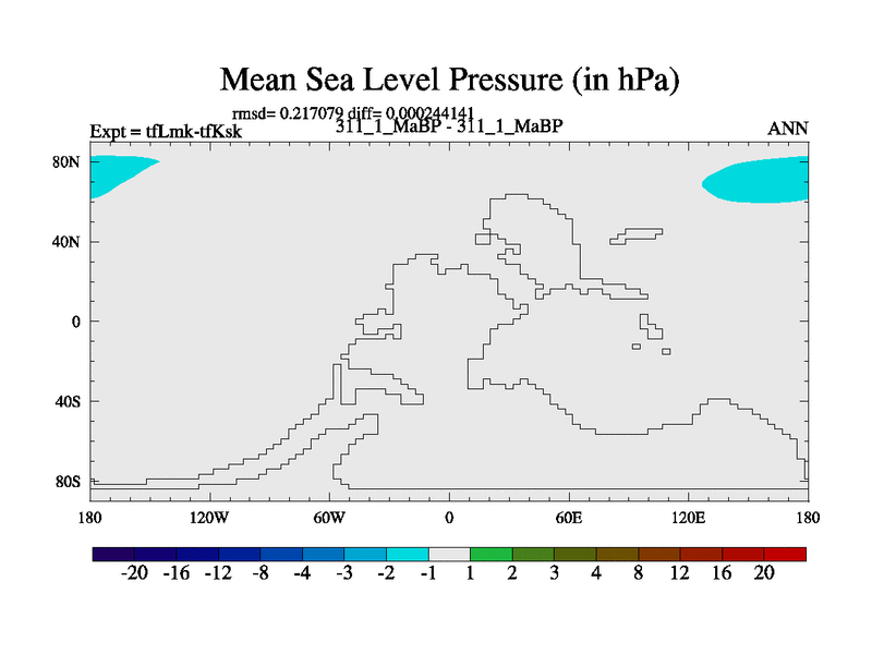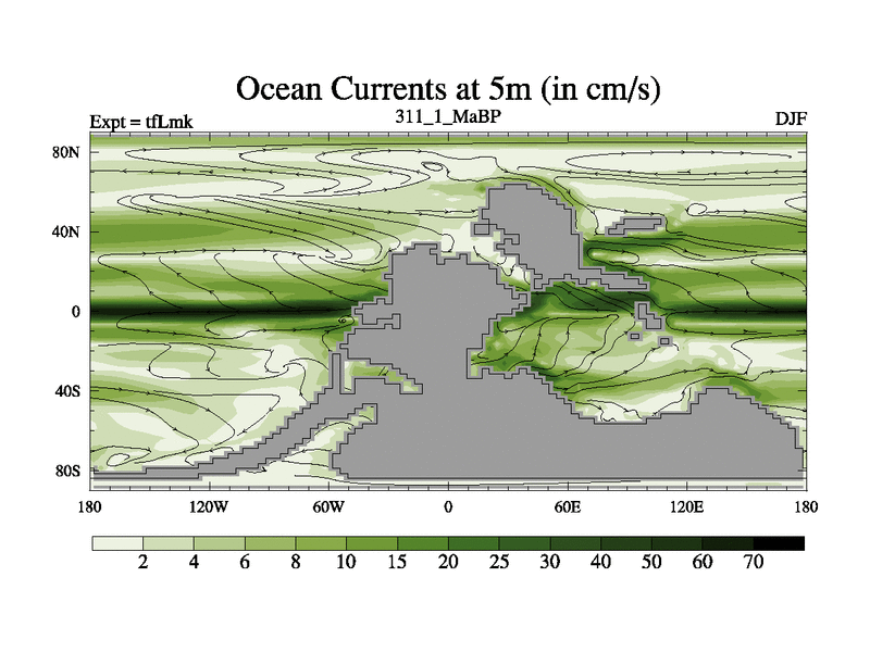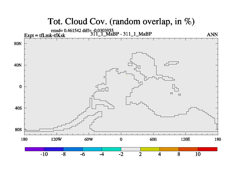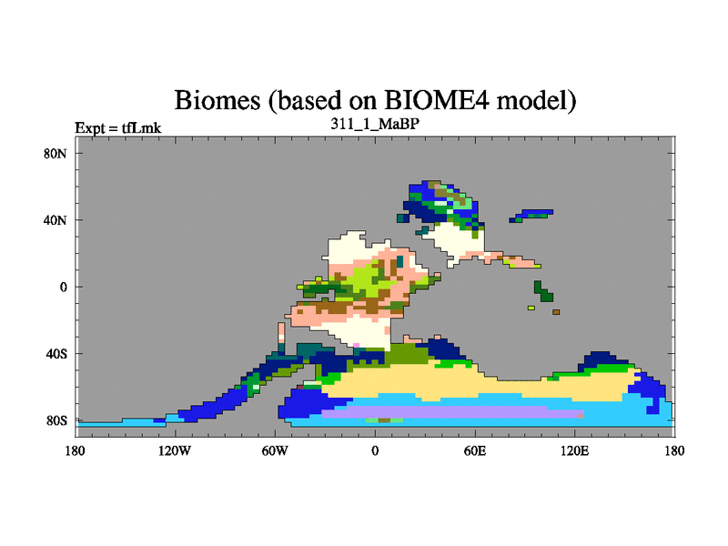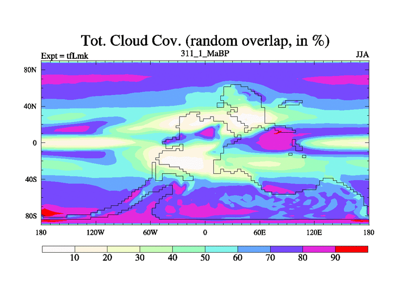 This is the 311.1 Ma simulation using the Scotese palaeogeographies and revised CCN etc. This version has islands and smoothing and desert albedo included. Tuned CO2 to give Scotese temperatures. Started from end of tfKsk. With JEDI output.