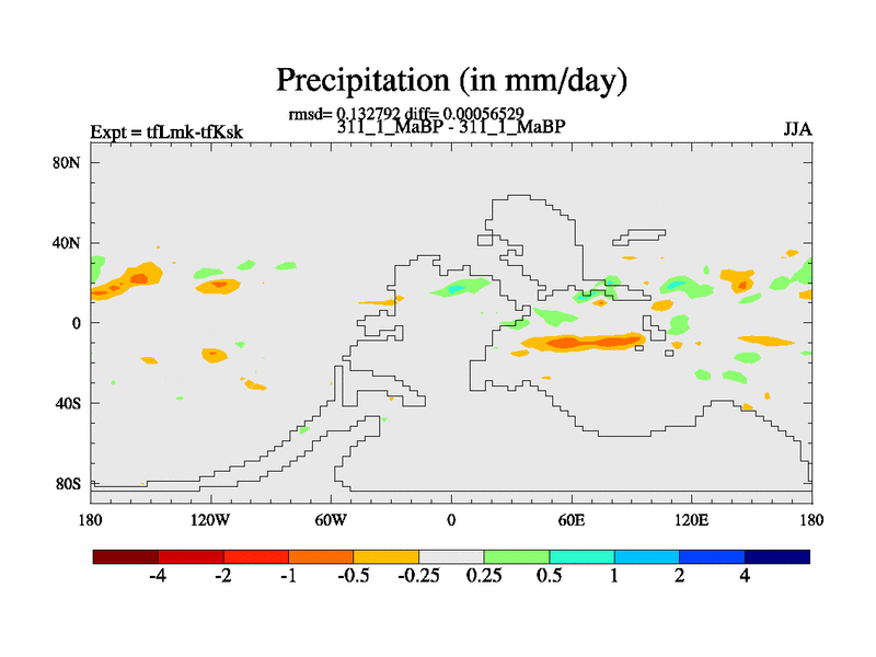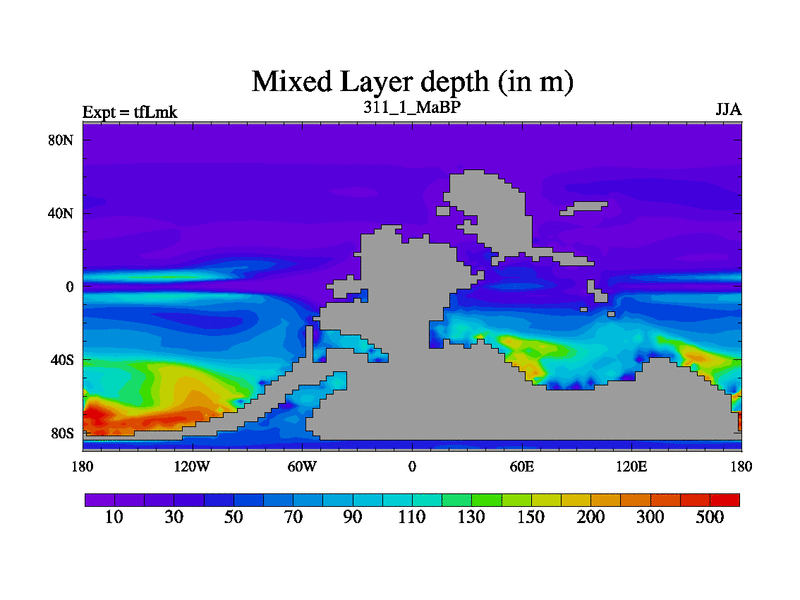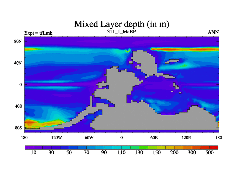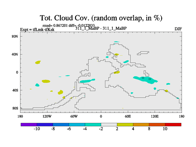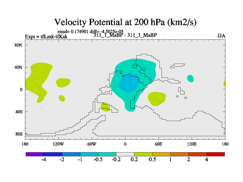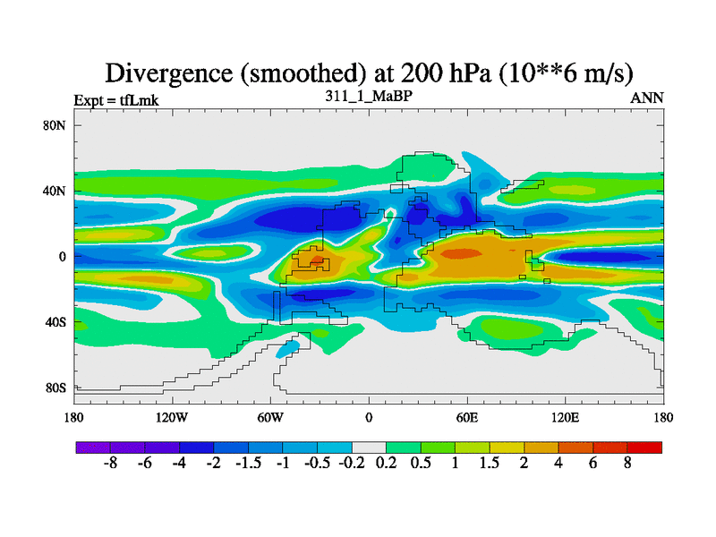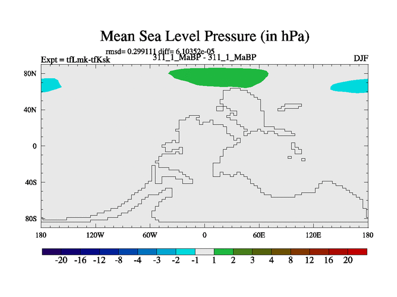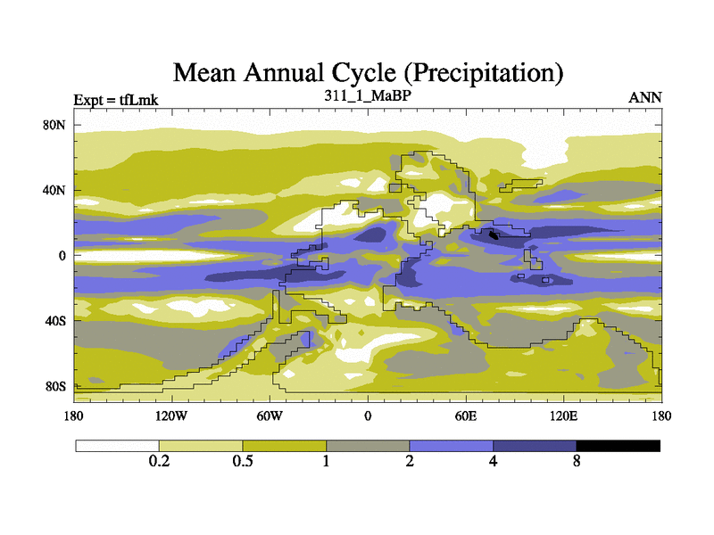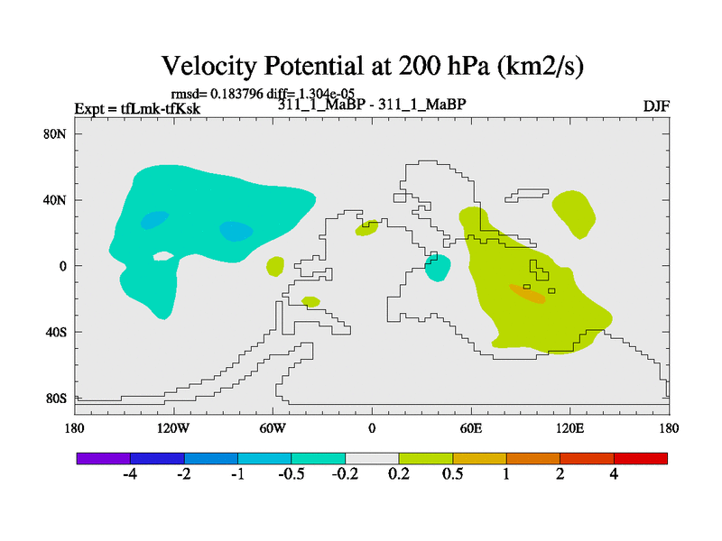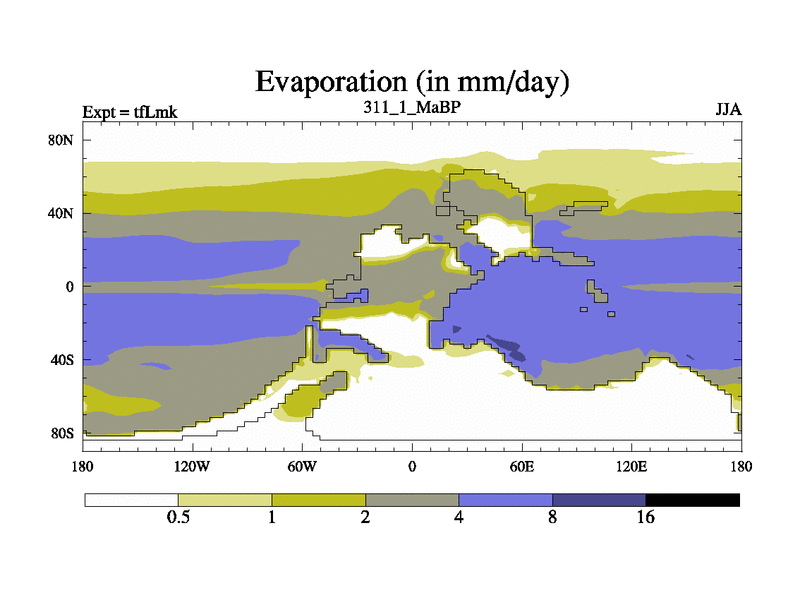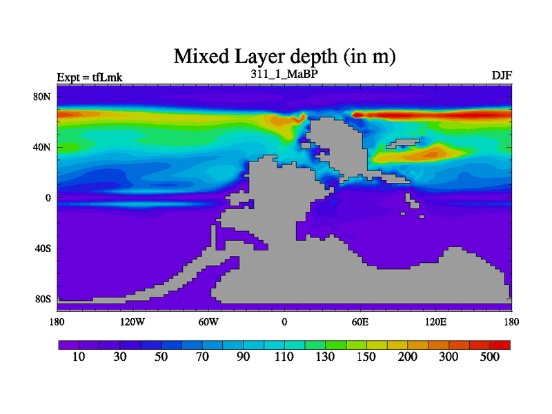 This is the 311.1 Ma simulation using the Scotese palaeogeographies and revised CCN etc. This version has islands and smoothing and desert albedo included. Tuned CO2 to give Scotese temperatures. Started from end of tfKsk. With JEDI output.