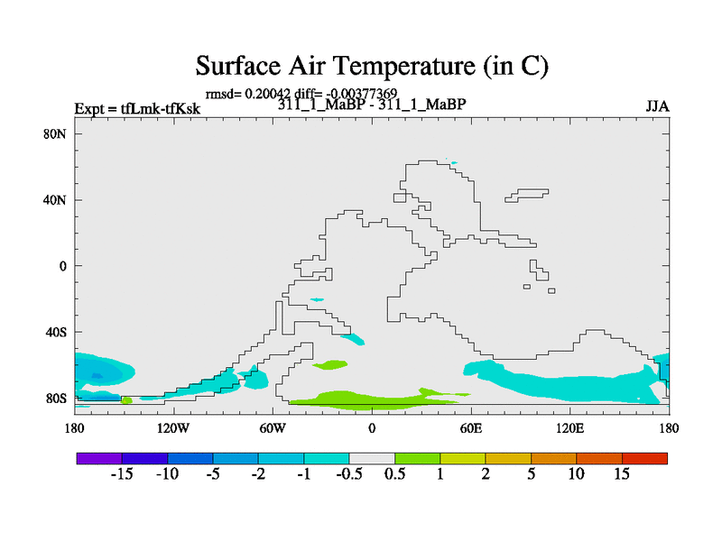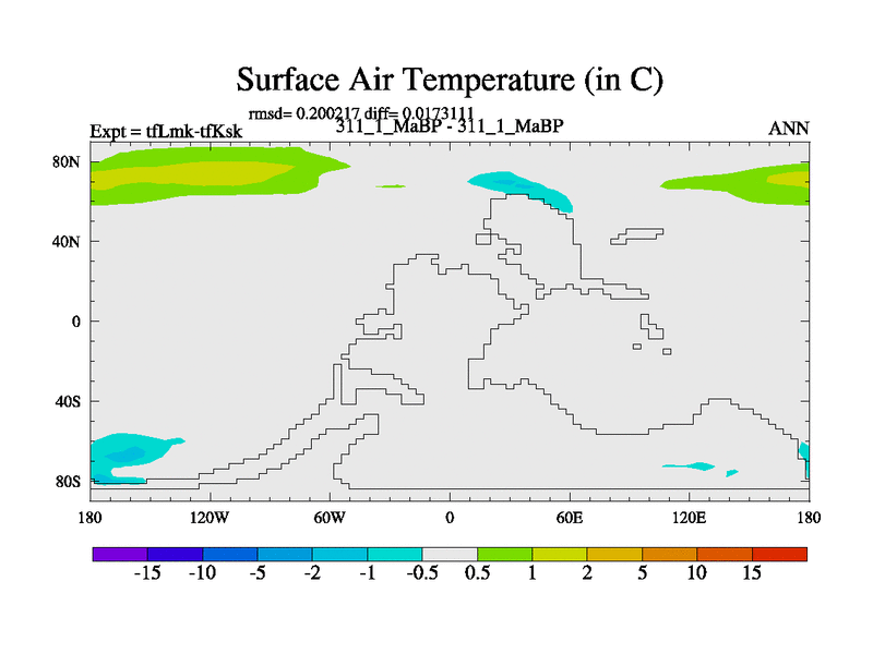 Scientifically as benchmark except using water age update, dark respiration, salinity conservation and revised ozone. Also using new orbital and solar update, and outputting leaf CO2. This version has islands included and atmospheric smoothing and desert albedo. Tuned CO2 to give Scotese temperatures. Started from end of tfKsk. With JEDI output.