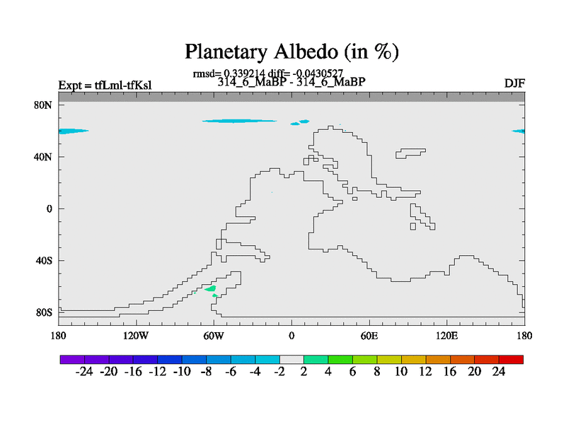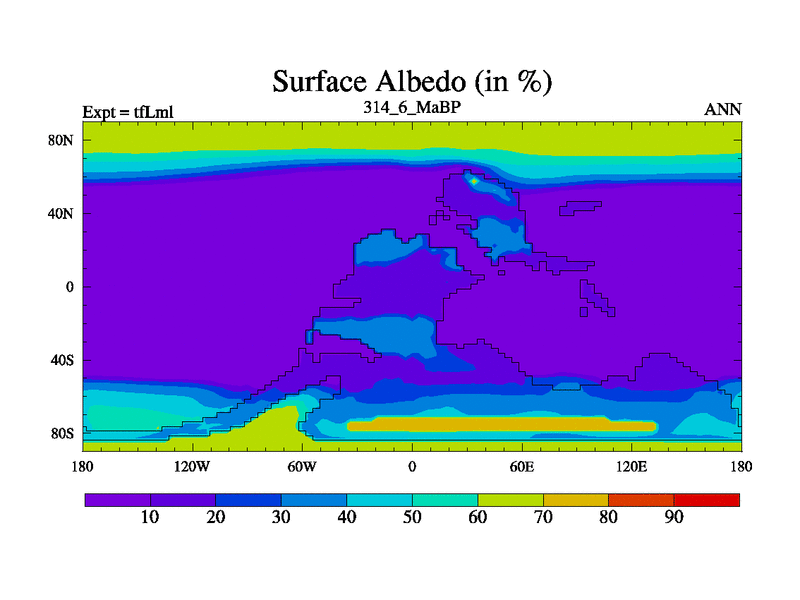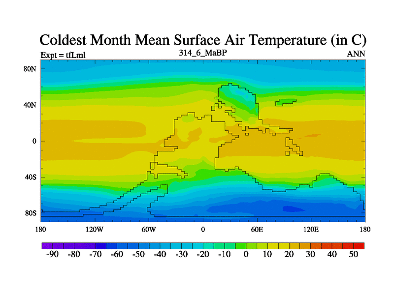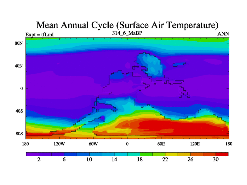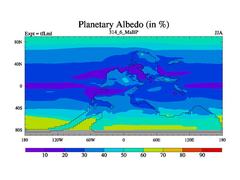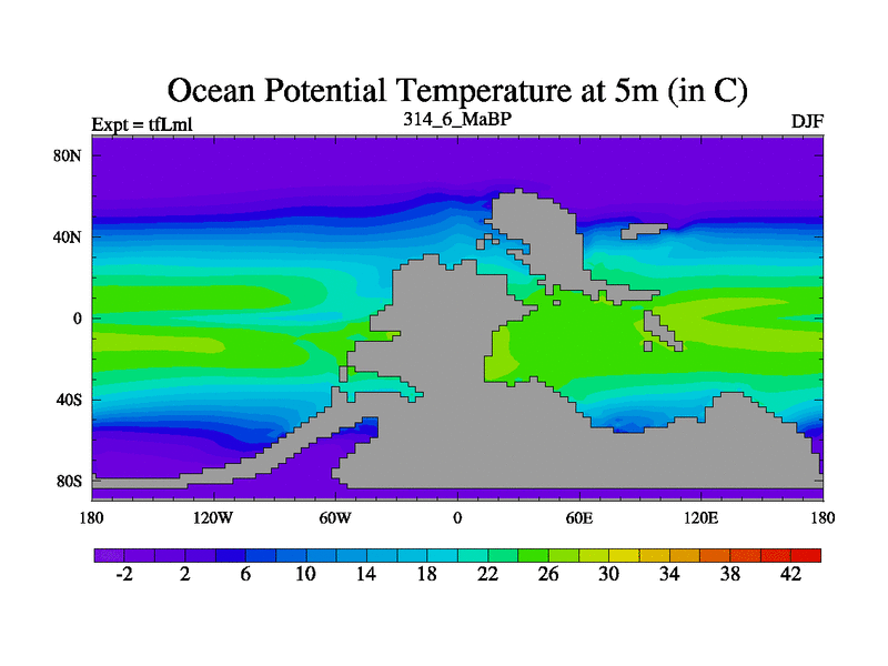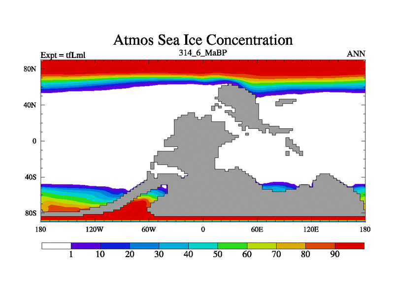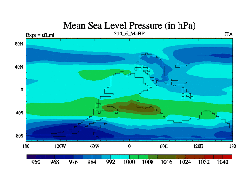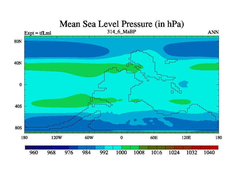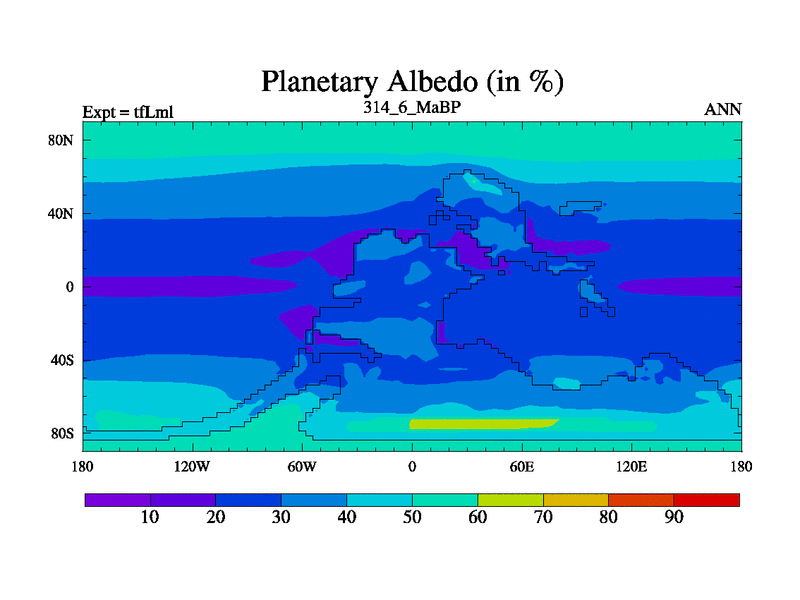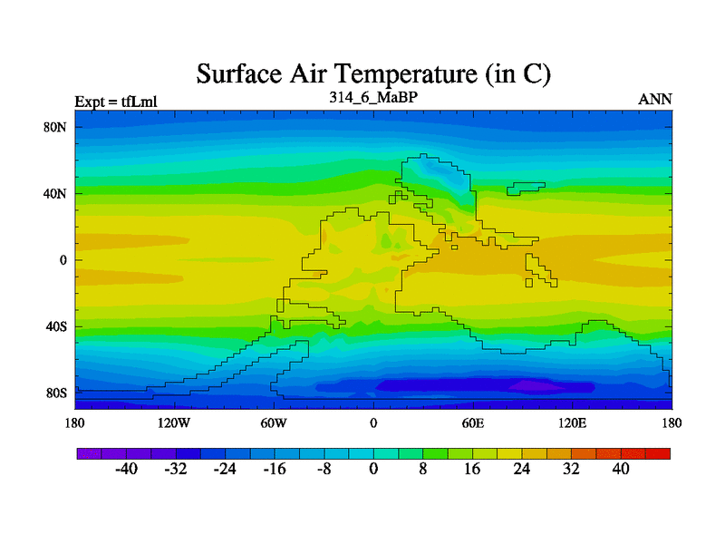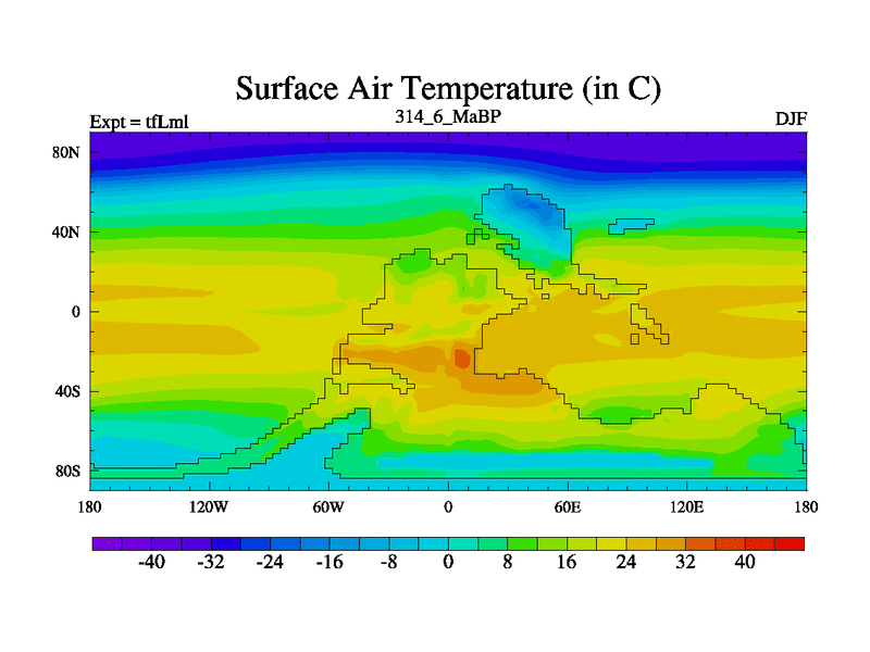 This is the 314.6 Ma simulation using the Scotese palaeogeographies and revised CCN etc. This version has islands and smoothing and desert albedo included. Tuned CO2 to give Scotese temperatures. Started from end of tfKsl. With JEDI output.
