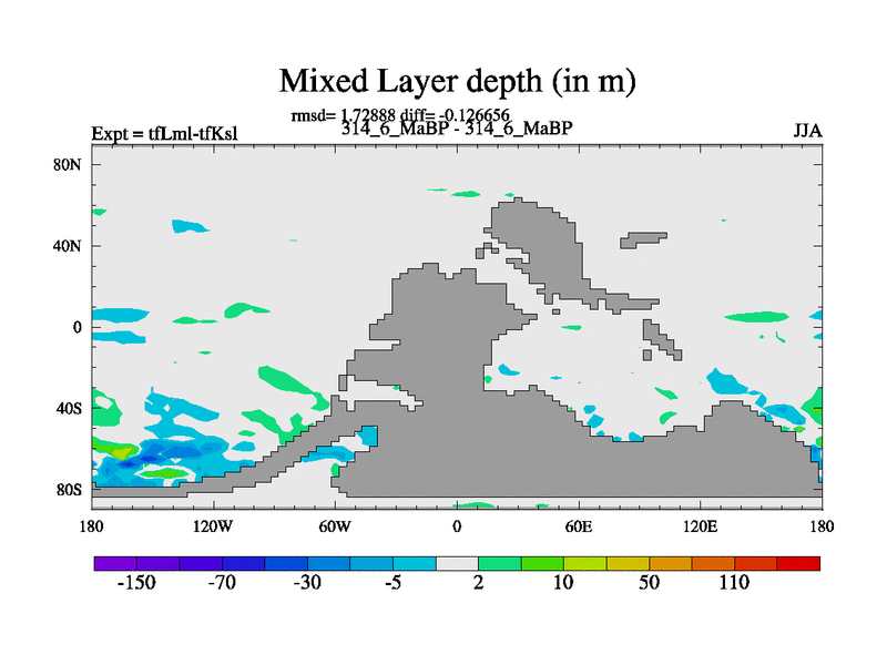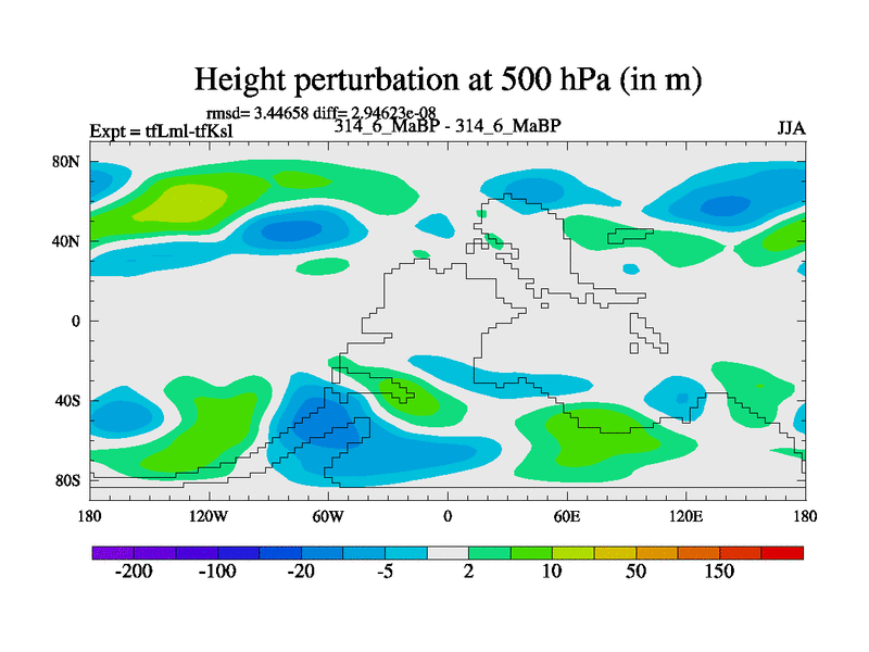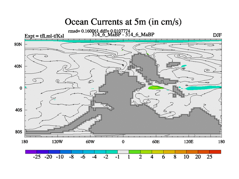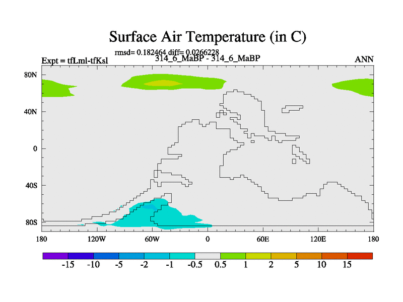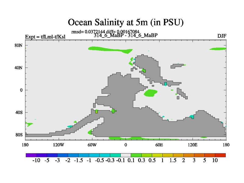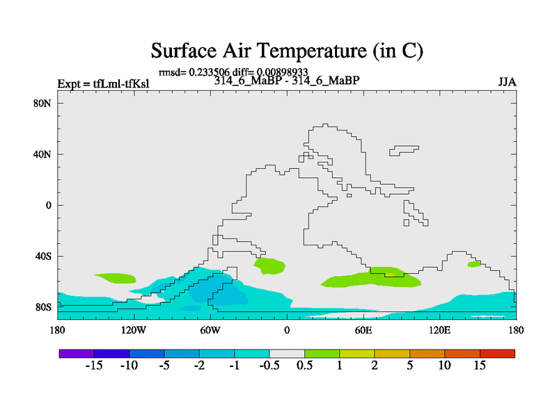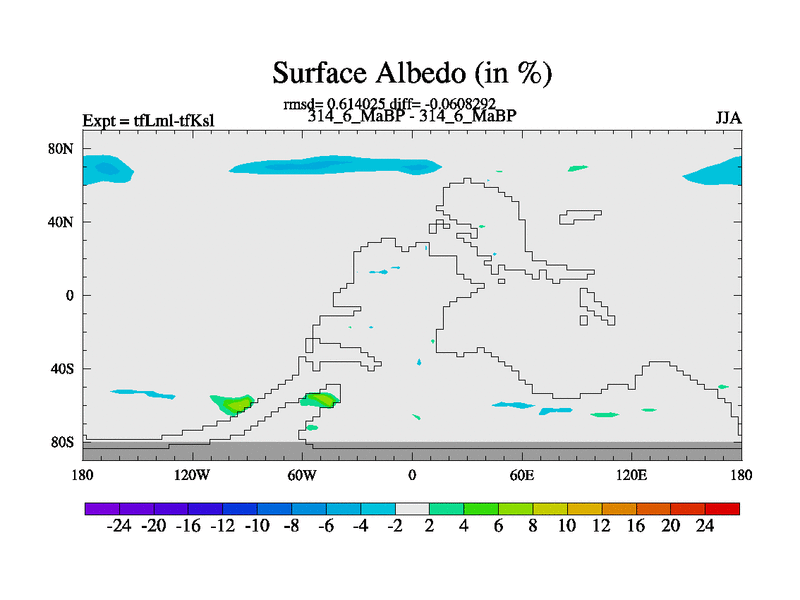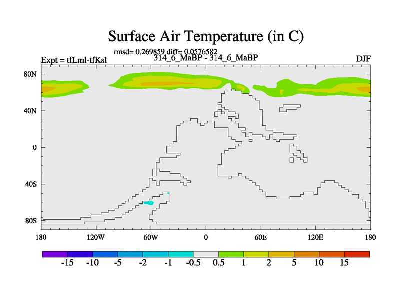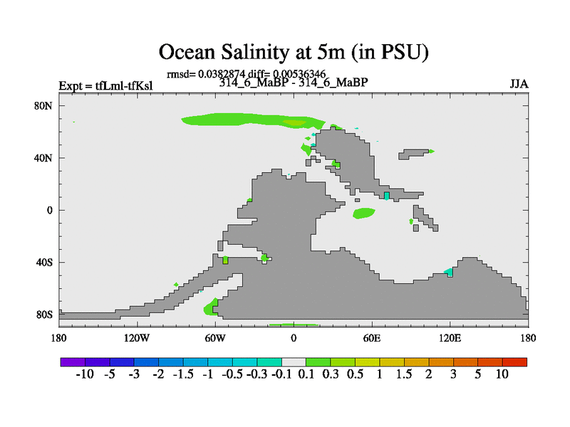 Scientifically as benchmark except using water age update, dark respiration, salinity conservation and revised ozone. Also using new orbital and solar update, and outputting leaf CO2. This version has islands included and atmospheric smoothing and desert albedo. Tuned CO2 to give Scotese temperatures. Started from end of tfKsl. With JEDI output.